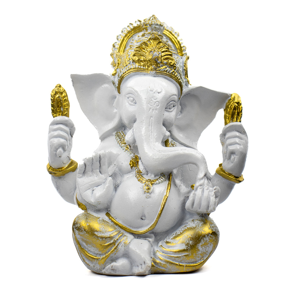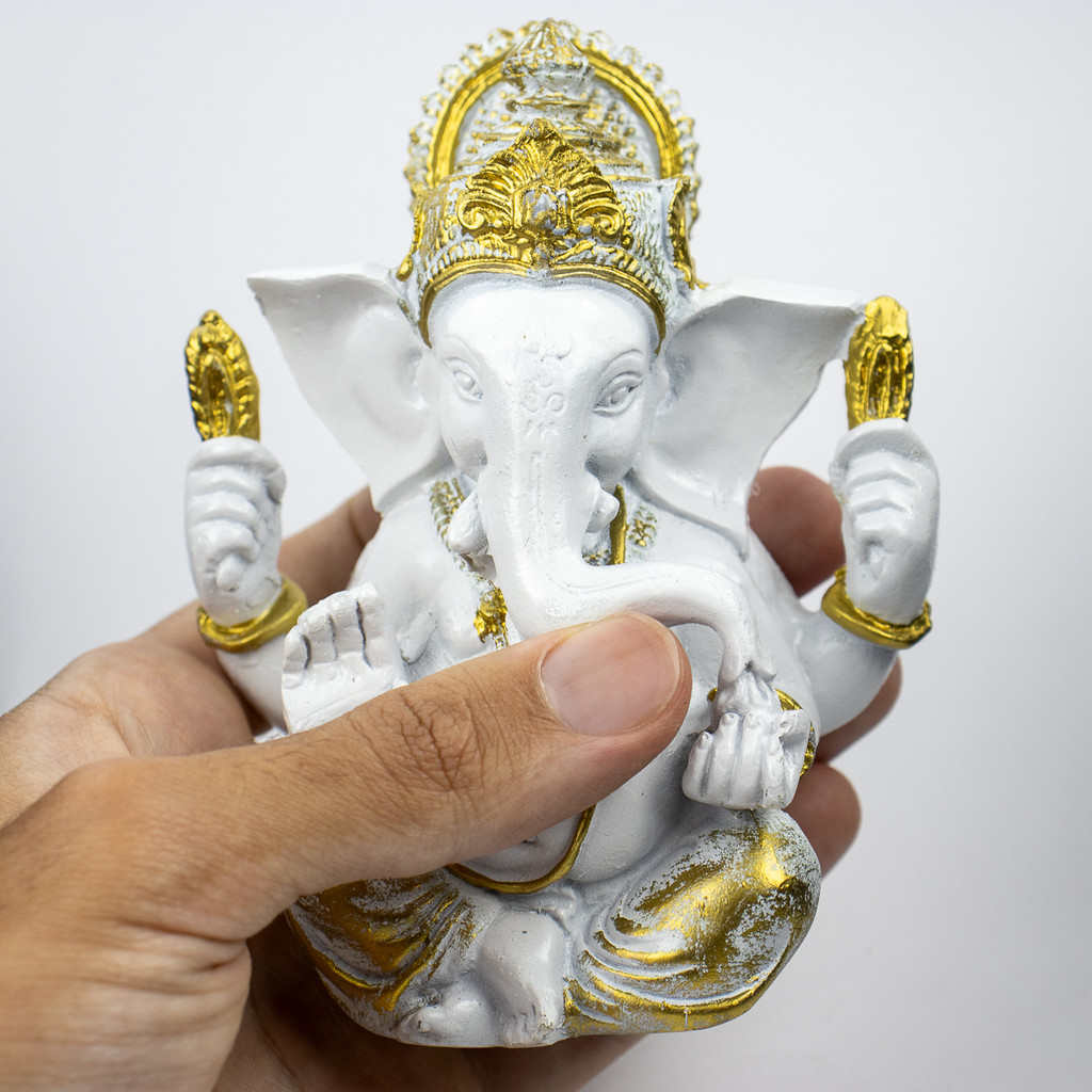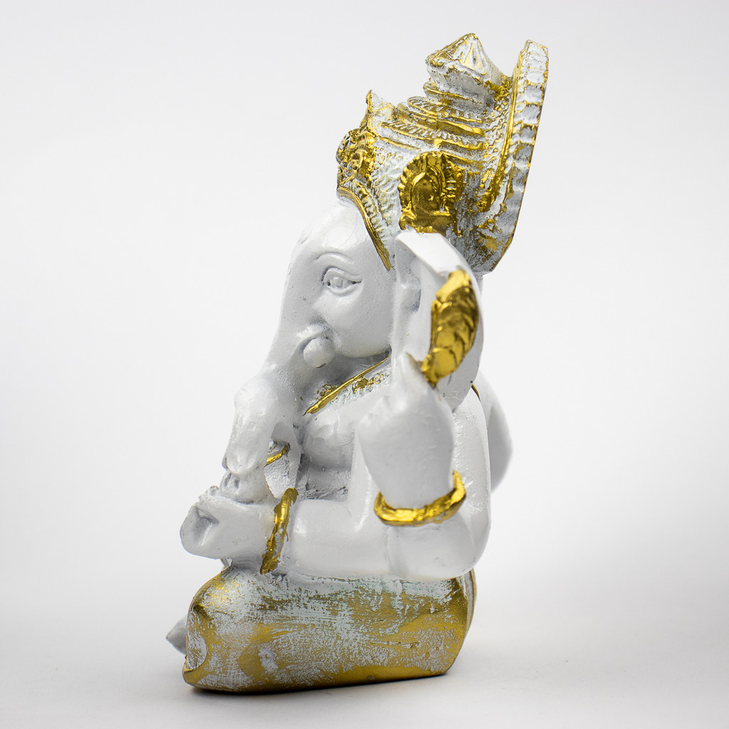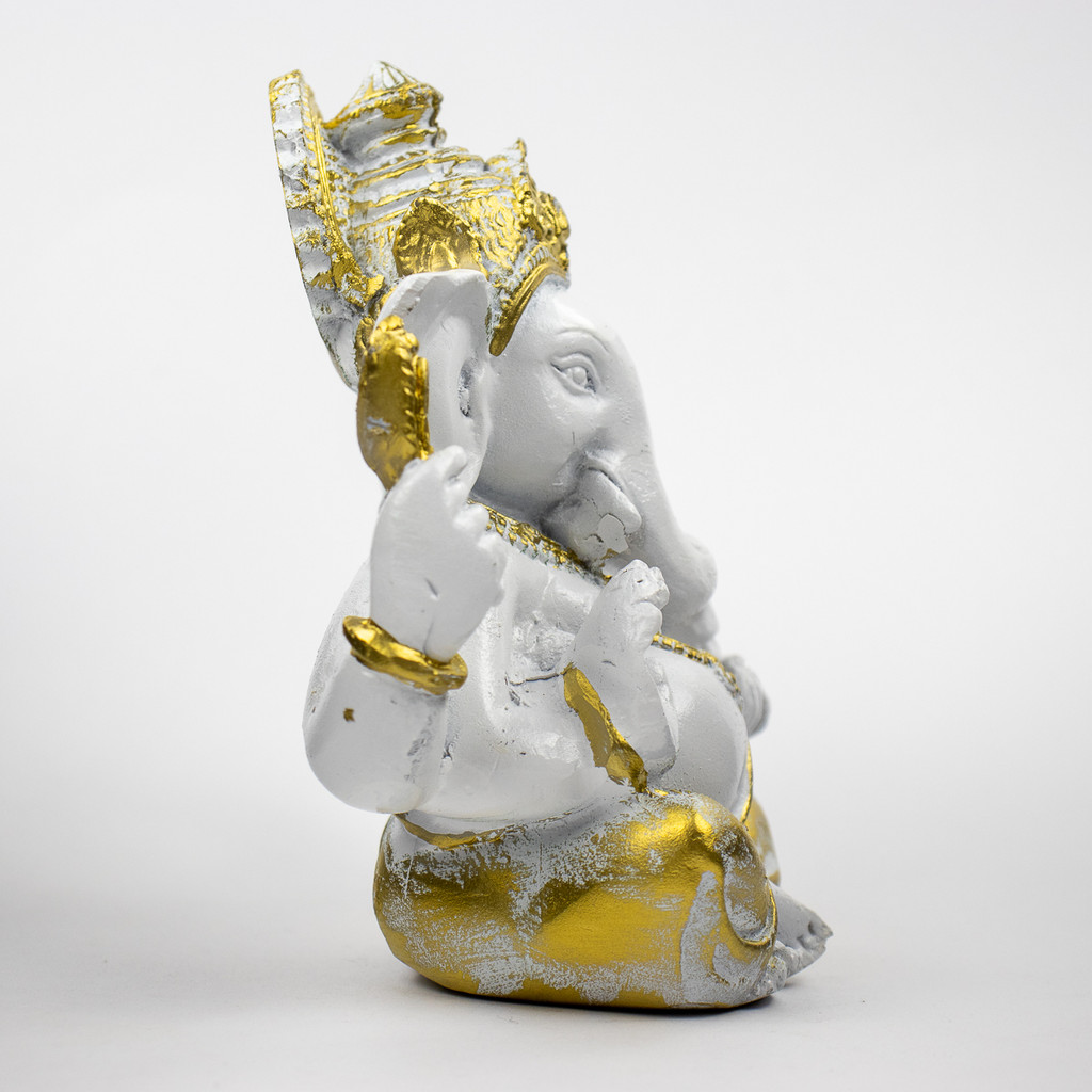 Escultura Ganesha Baby Meditando 11cm Branco Dourado Resina