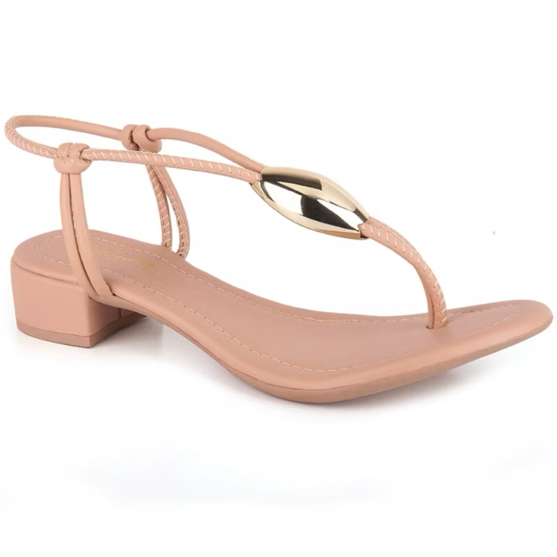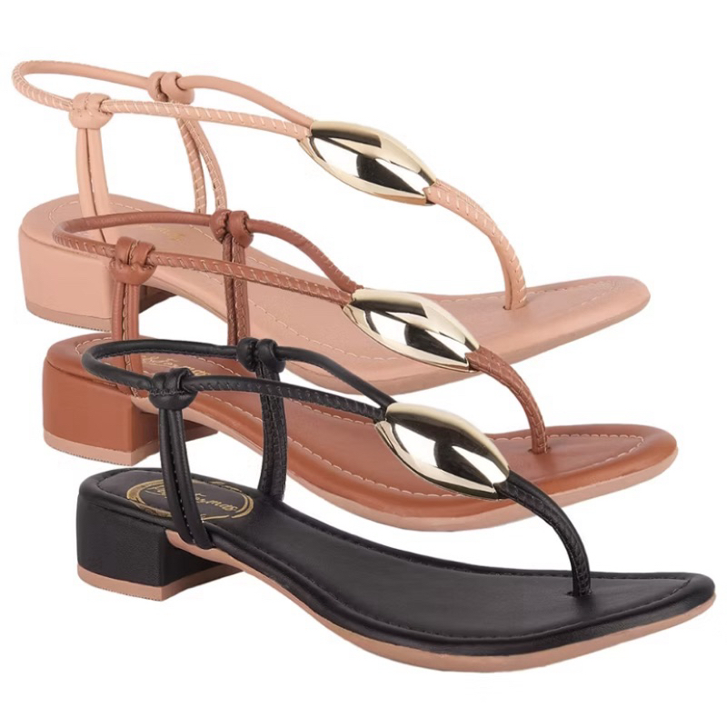 Sandália Salto Baixo Feminina Enfeite de Metal Folha Dourada Casual e Confortável Promoção Dia a Dia