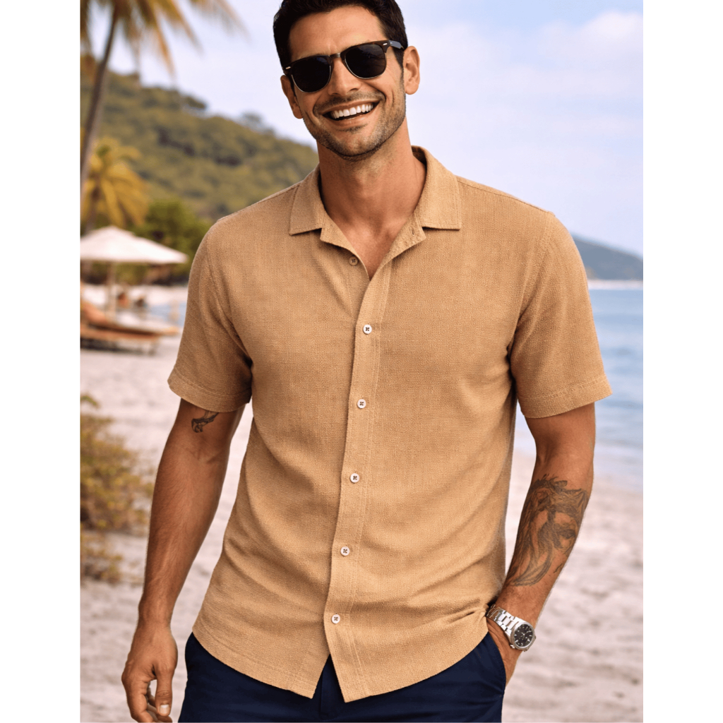 Camisa Masculina Texturizada Com Botões Old Money Estilosa Praia Verão Preto Off White Marrom Verde