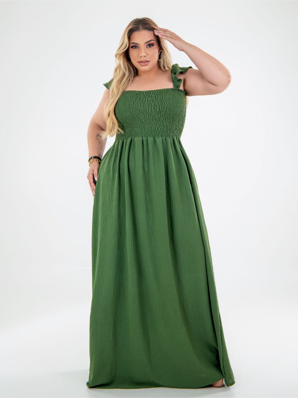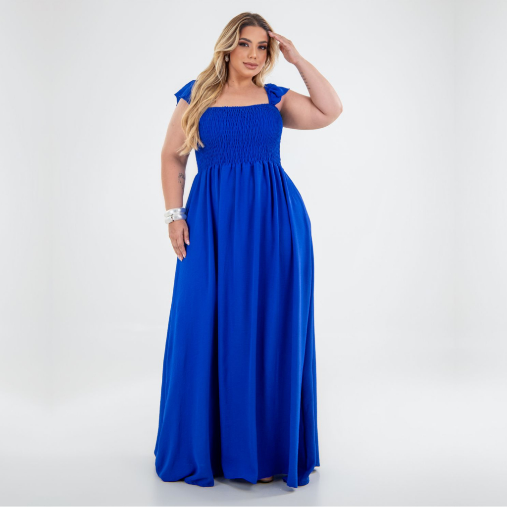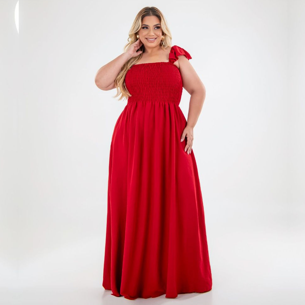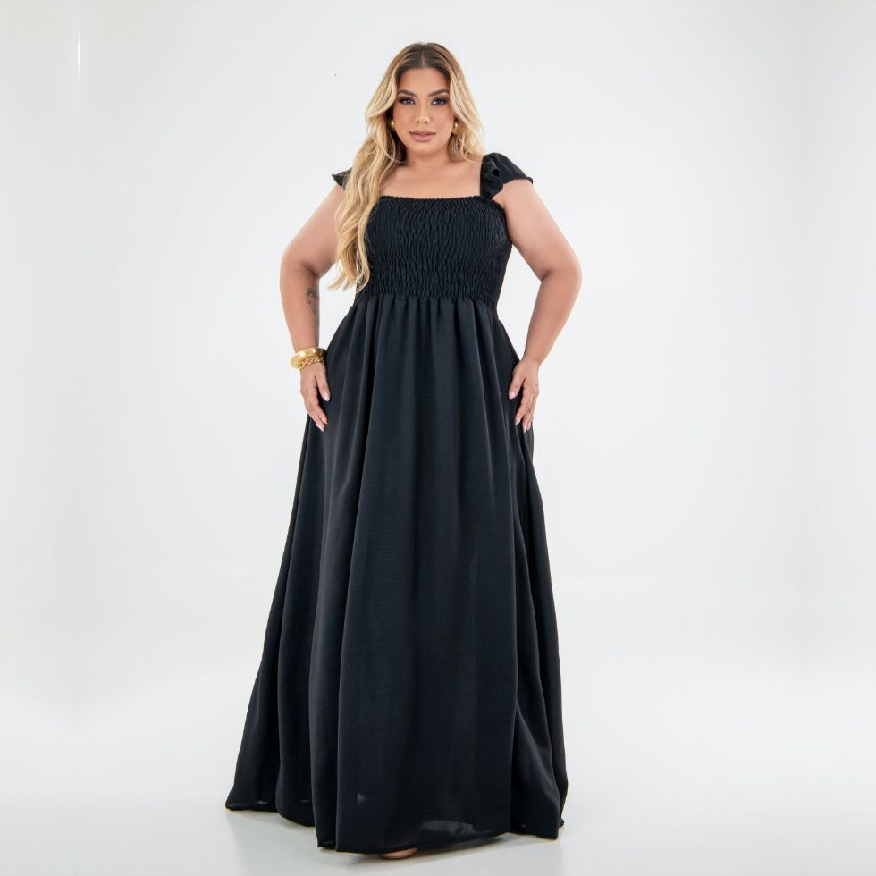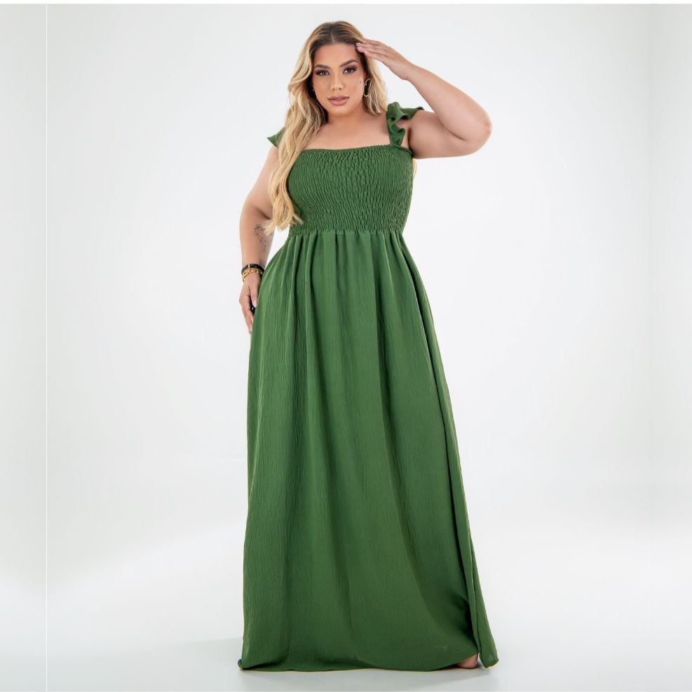 Vestido Longo Alça de Babado Crepe Dunas Plus Size Moda Casual Plis, Moda Evangélica