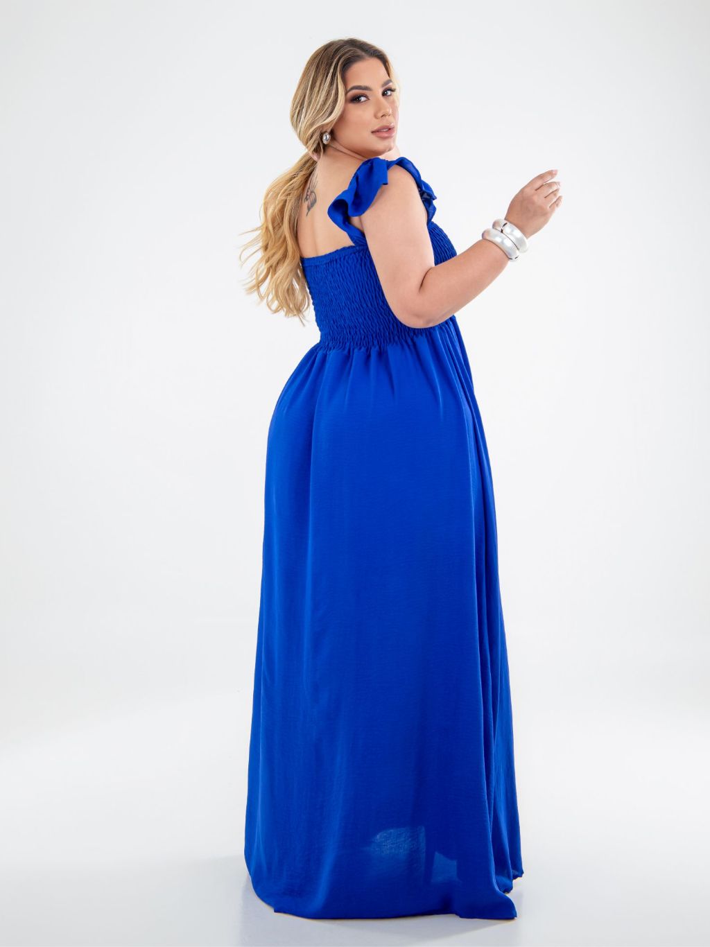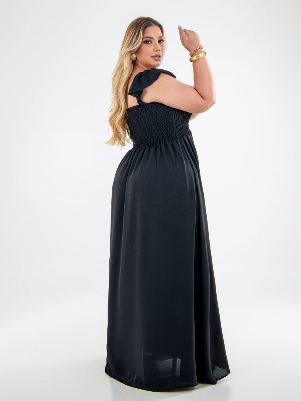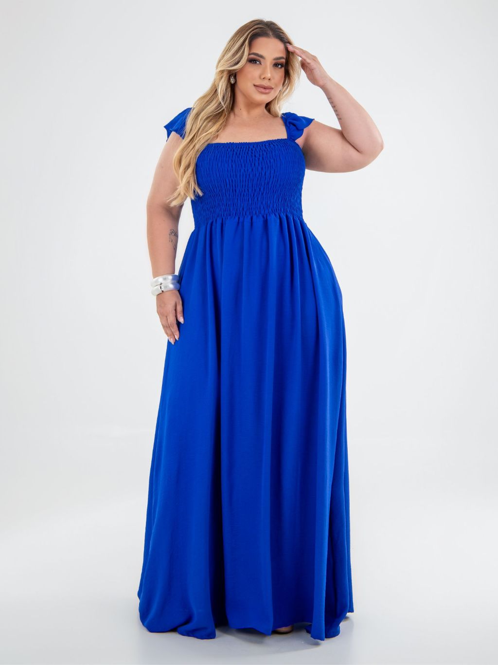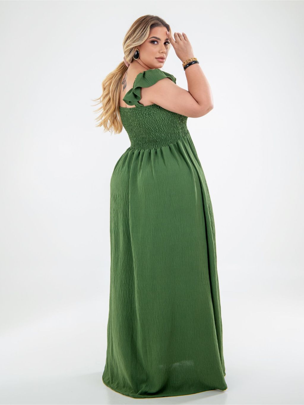 Vestido Longo Alça de Babado Crepe Dunas Plus Size Moda Casual Plis, Moda Evangélica