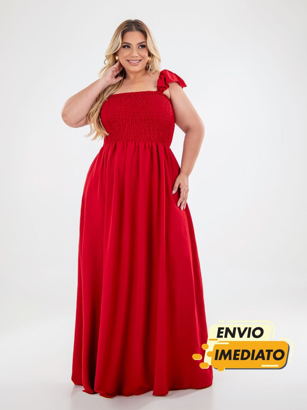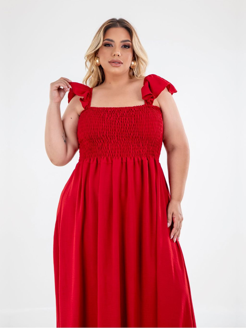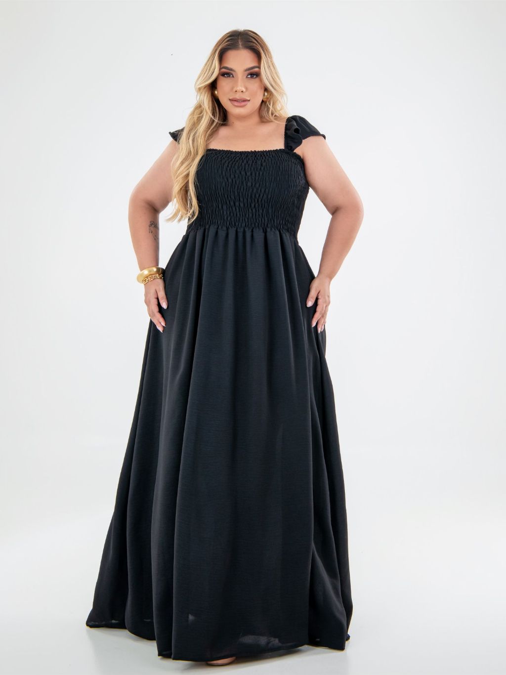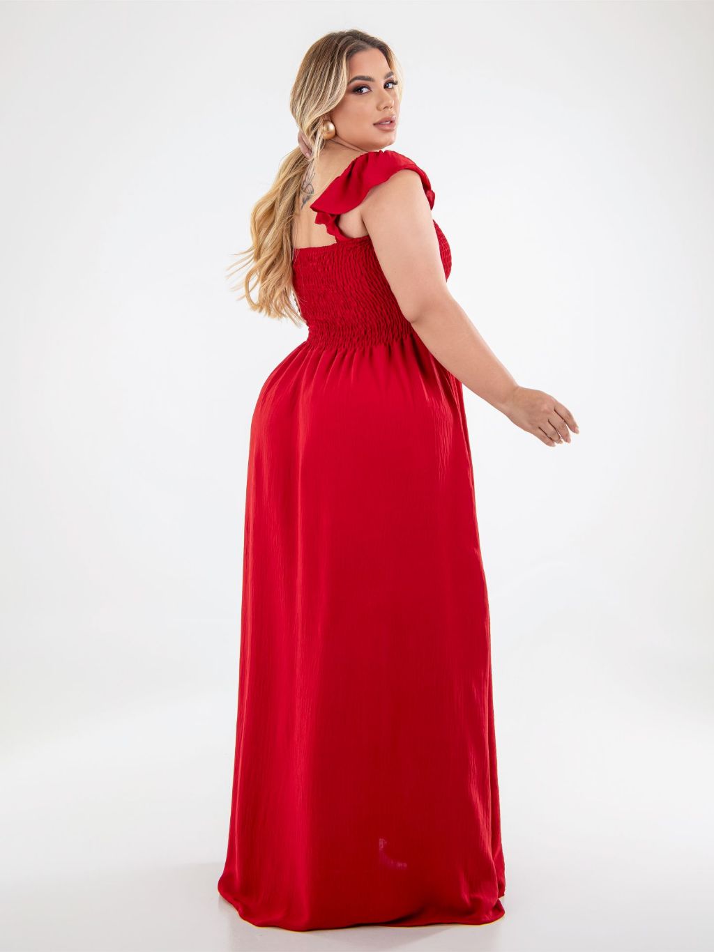 Vestido Longo Alça de Babado Crepe Dunas Plus Size Moda Casual Plis, Moda Evangélica