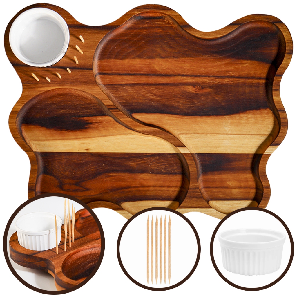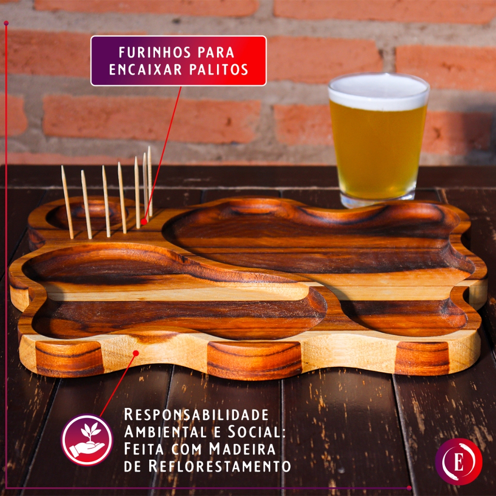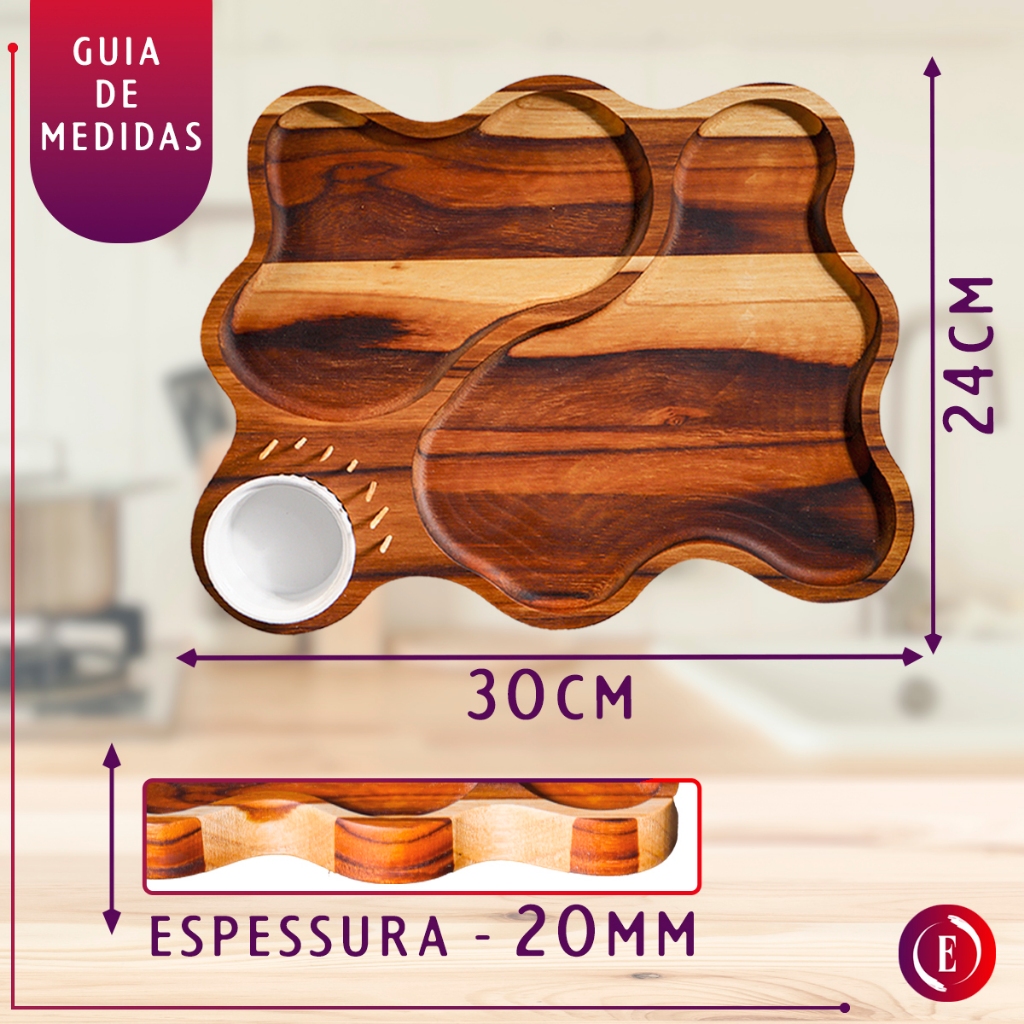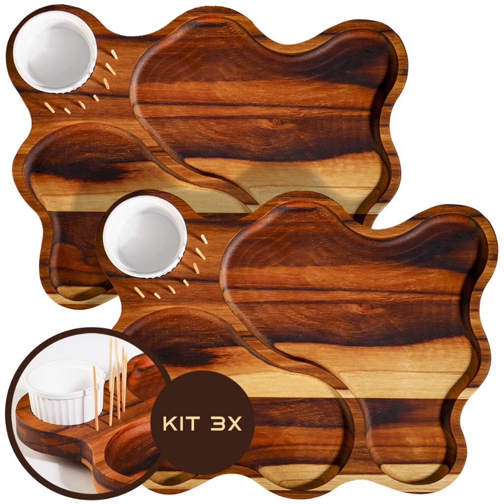 Kit 03 Petisqueiras Madeira Teca Ramequim Molhos Barbecue Salame Churrasco Trabalhada 2 Repartições