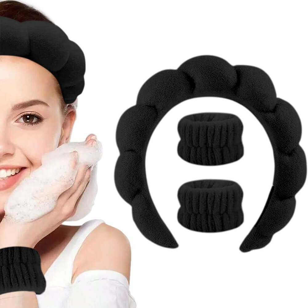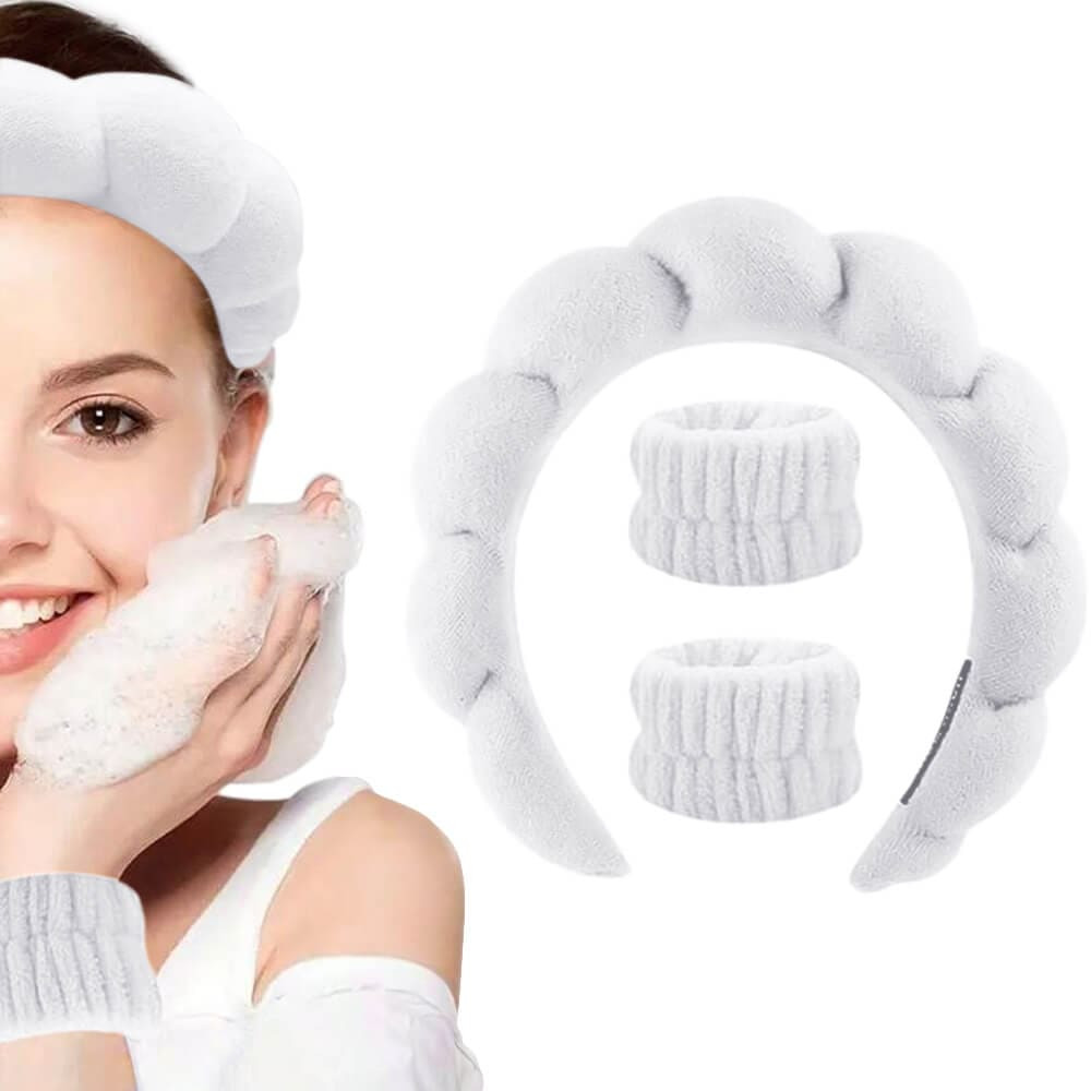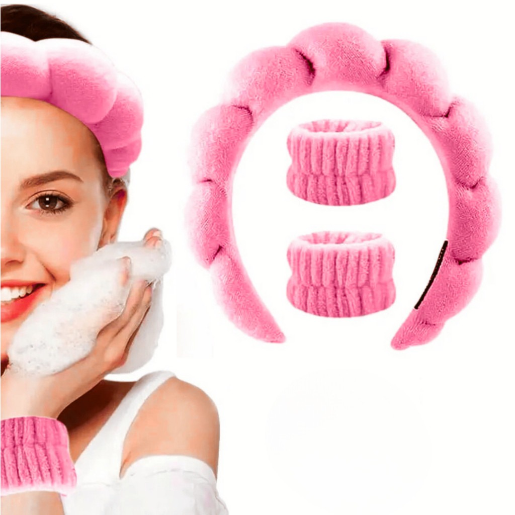 Kit Tiara Nuvem e Pulseira Atoalhada Skincare Maquiagem