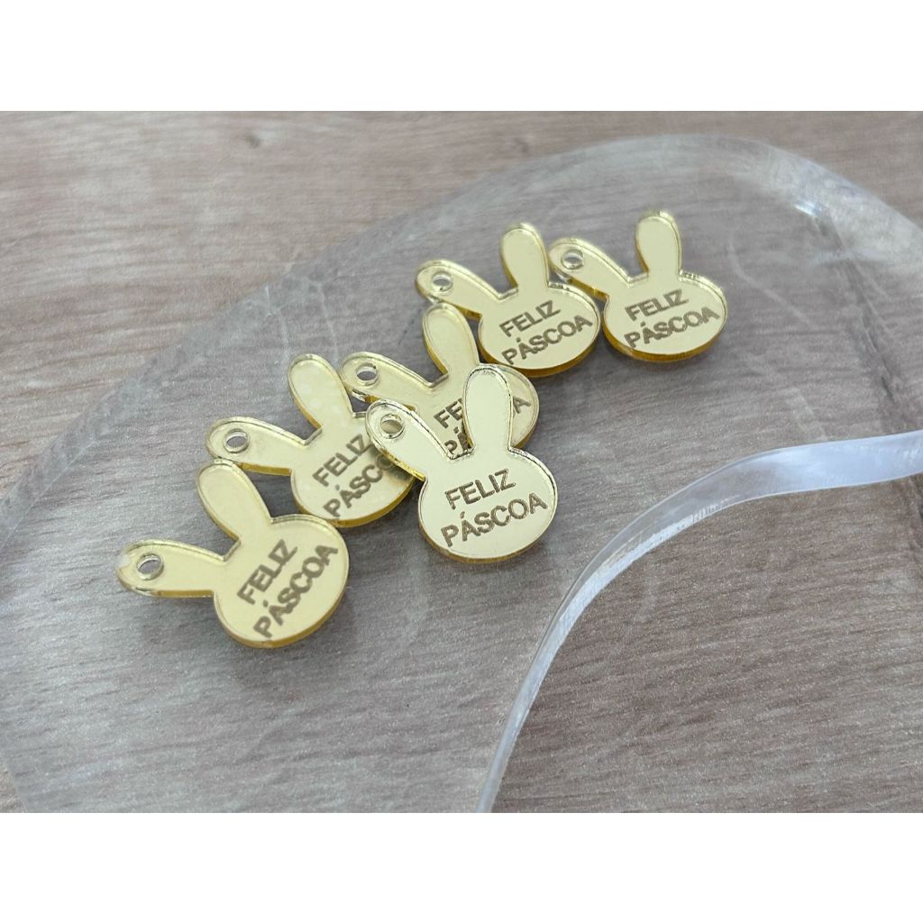 Aplique Tag Coelho Feliz Páscoa Gravado Acrílico Dourado Espelhado