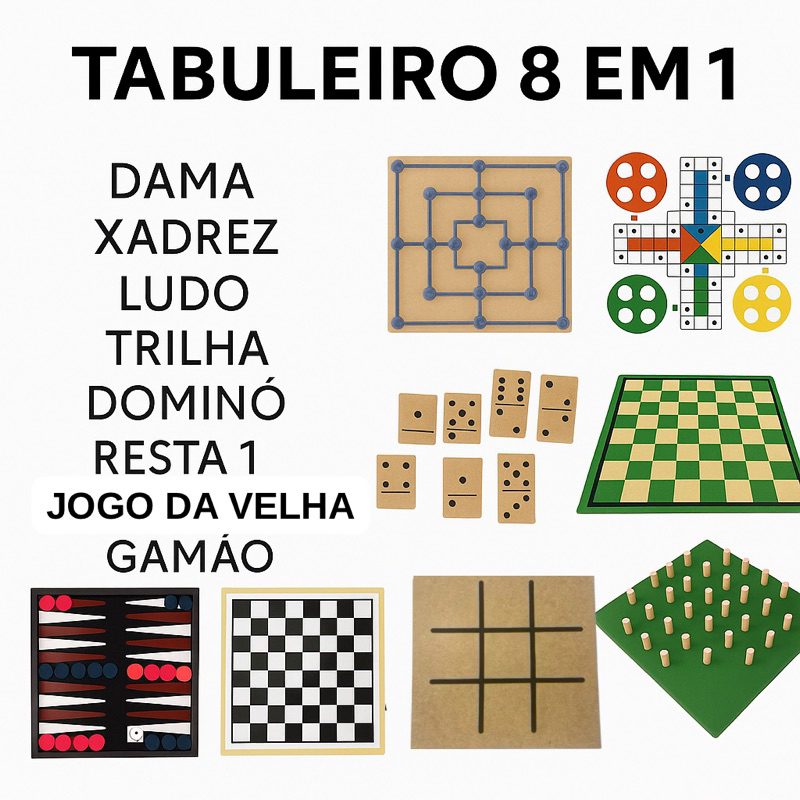 8 em 1 Tabuleiros Xadrez Dominó Dama Gamão Trilha Resta um Jogo da Velha Ludo Jogo