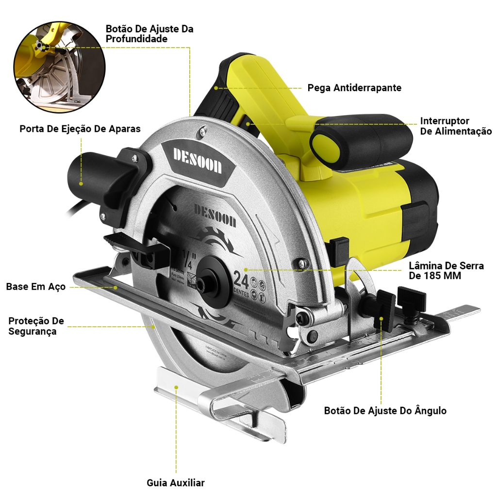Serra Circular 1600W Profissional Elétrica 5500RPM 185mm 7/1.4" Disco com Guia Paralela E Três lápis Desoon