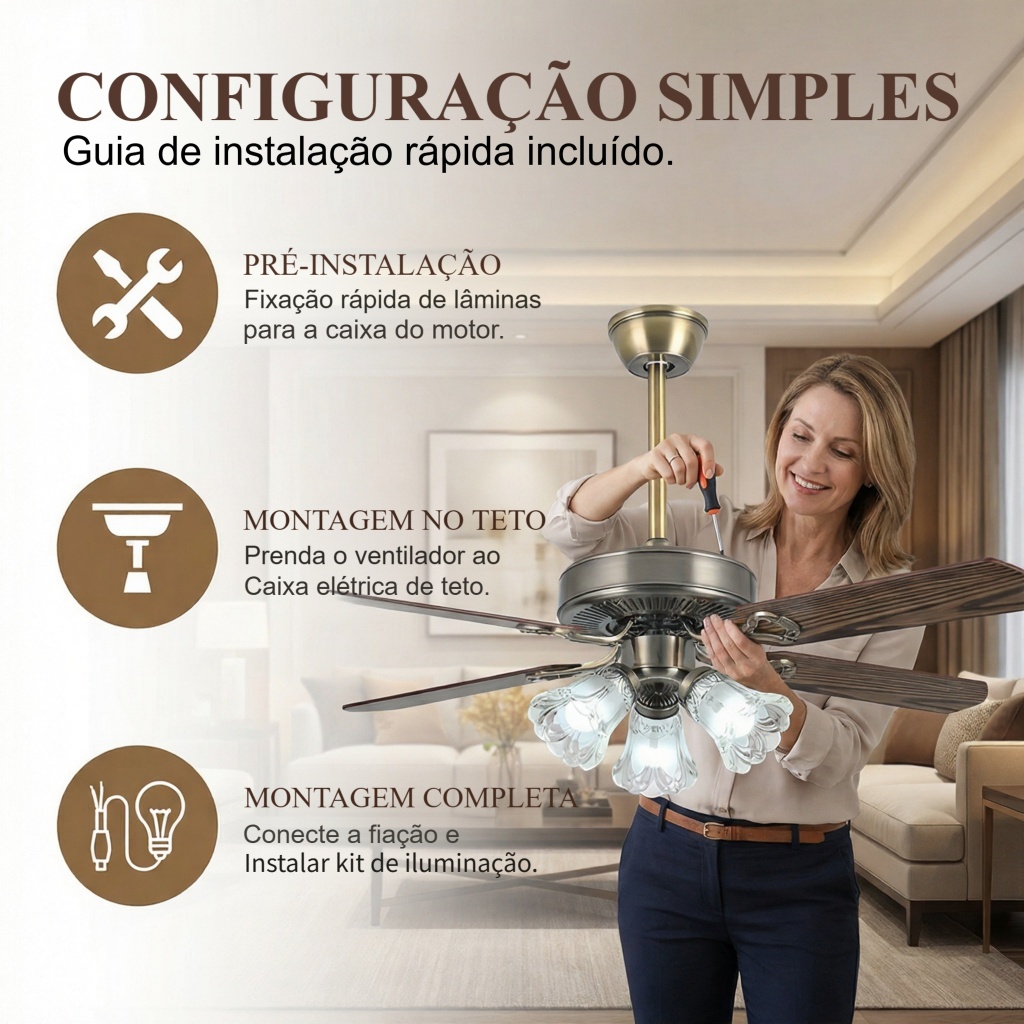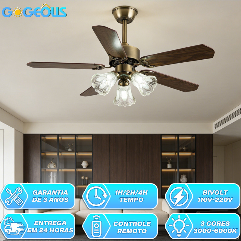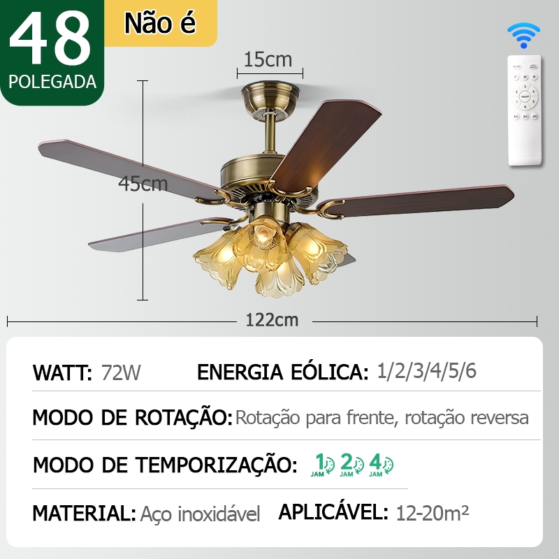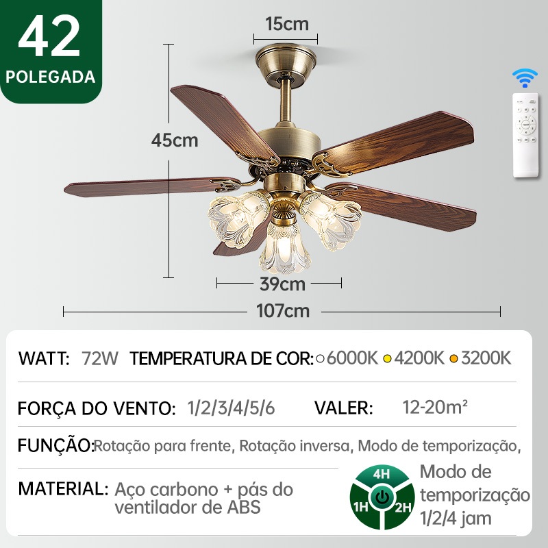Ventilador de Teto com Luz 110V-220V 42/48 Polegadas Motor CC Reversível Silencioso Controle Remoto 3 Cores de Luz