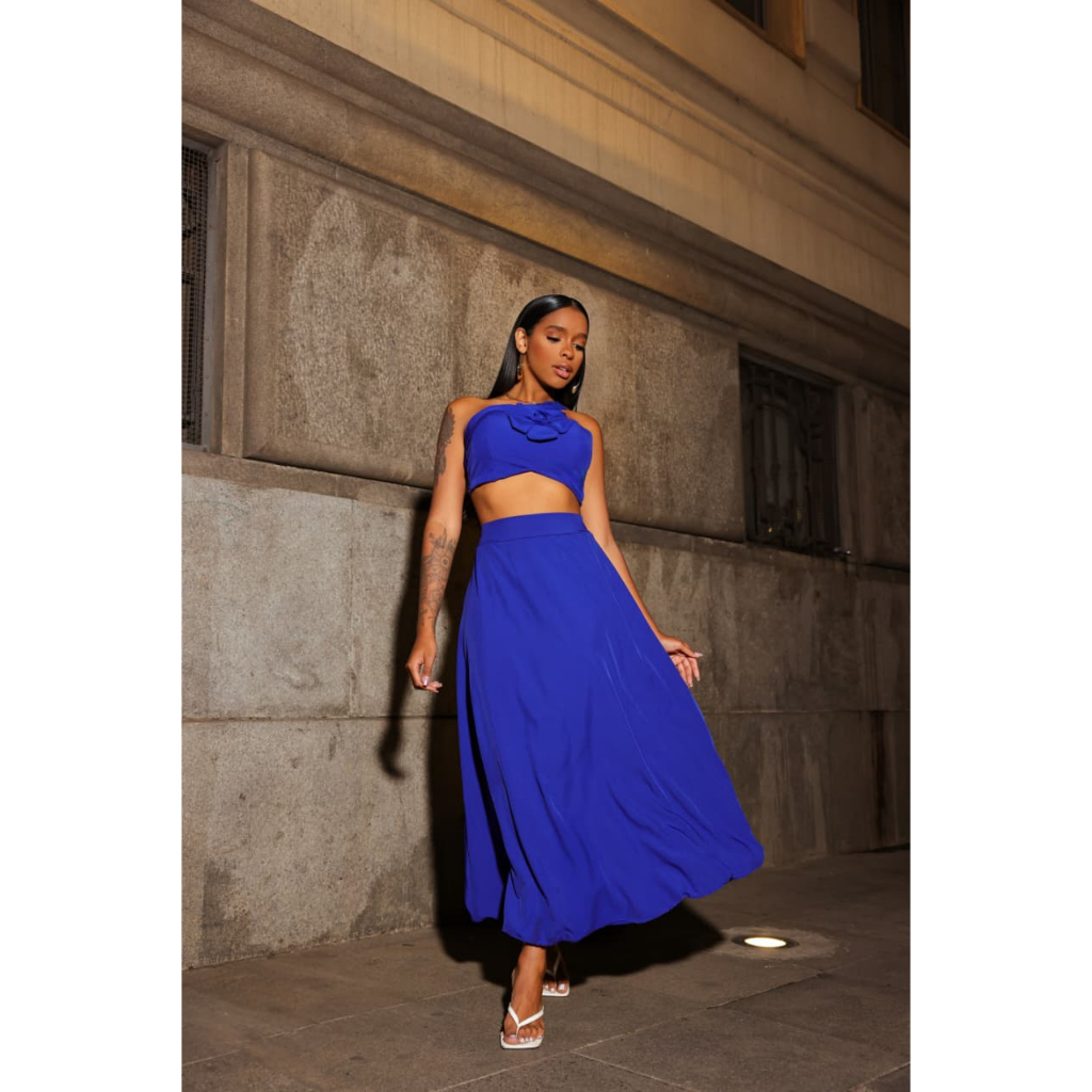 comjunto saia e cropped com flor tecido crepinho elegante tendencia feminina