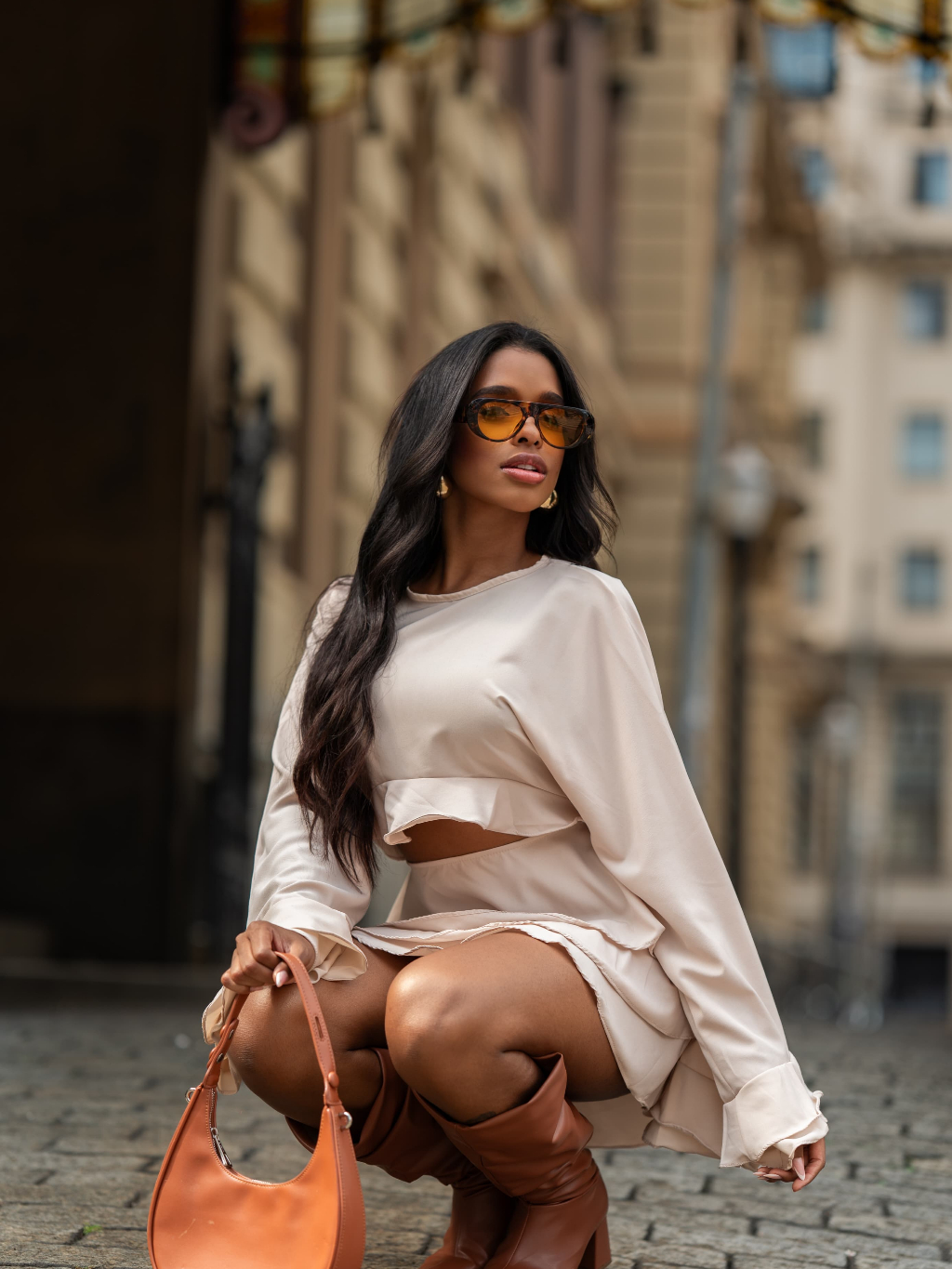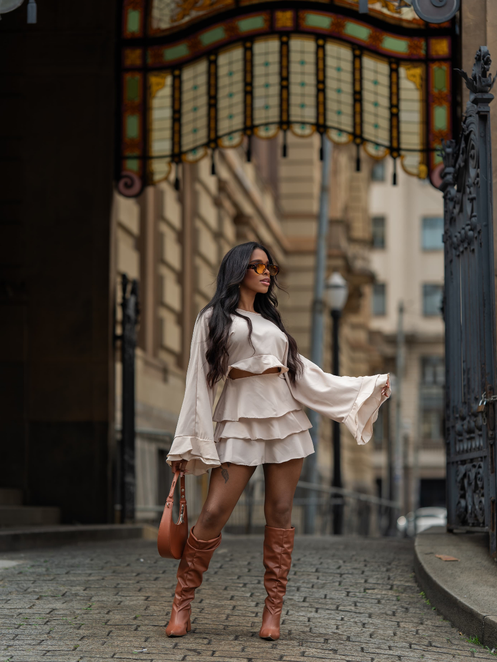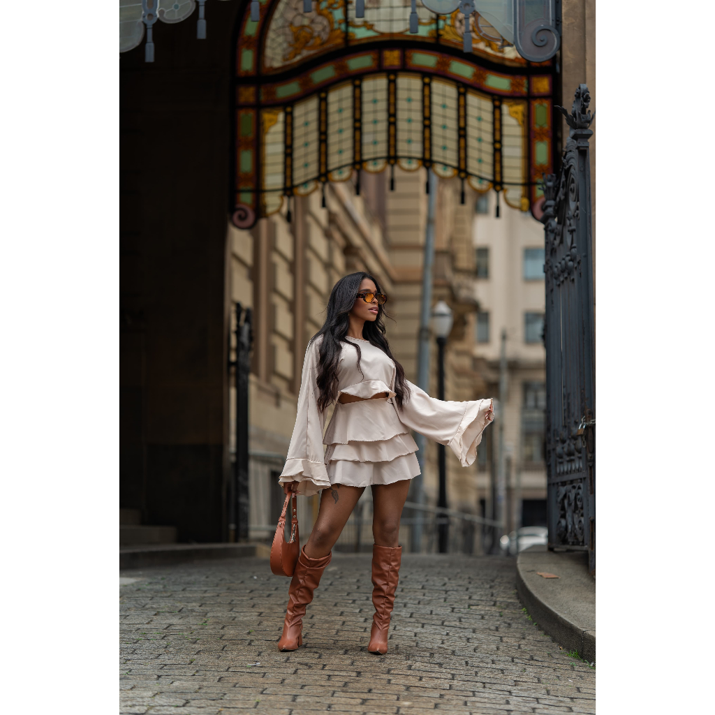 vestido curto manga longa com babados abertura na frente tecido crepinho