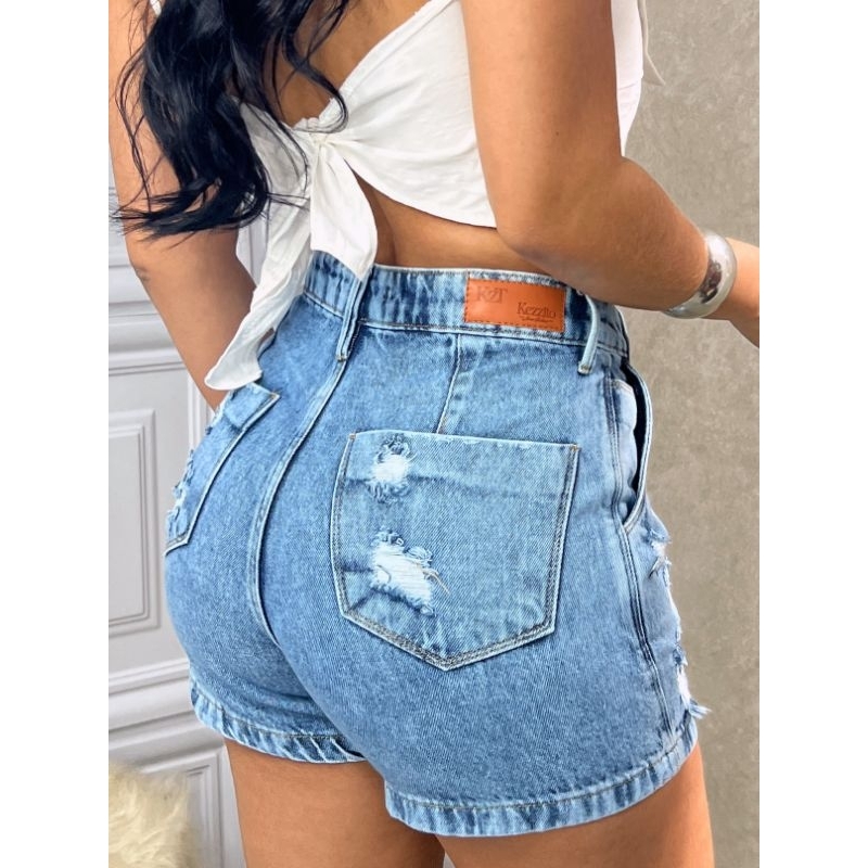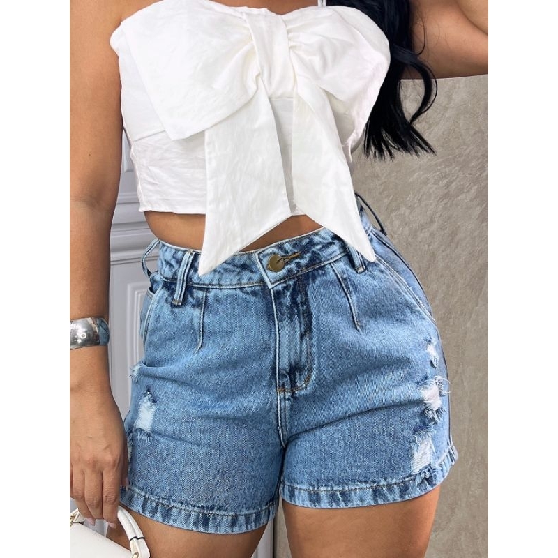 Short Jeans Feminino Cintura Alta BOYFRIEND Com Pinça 100% Algodão Azul Claro