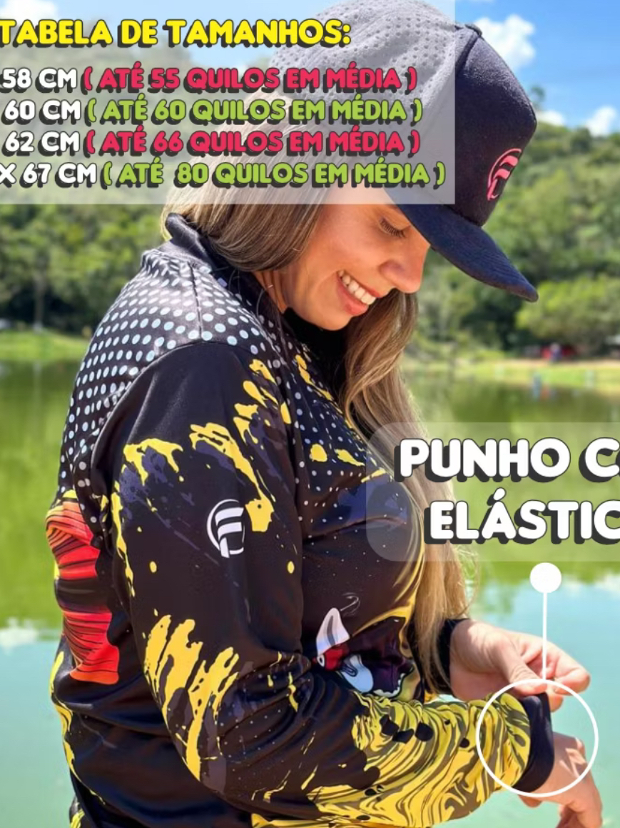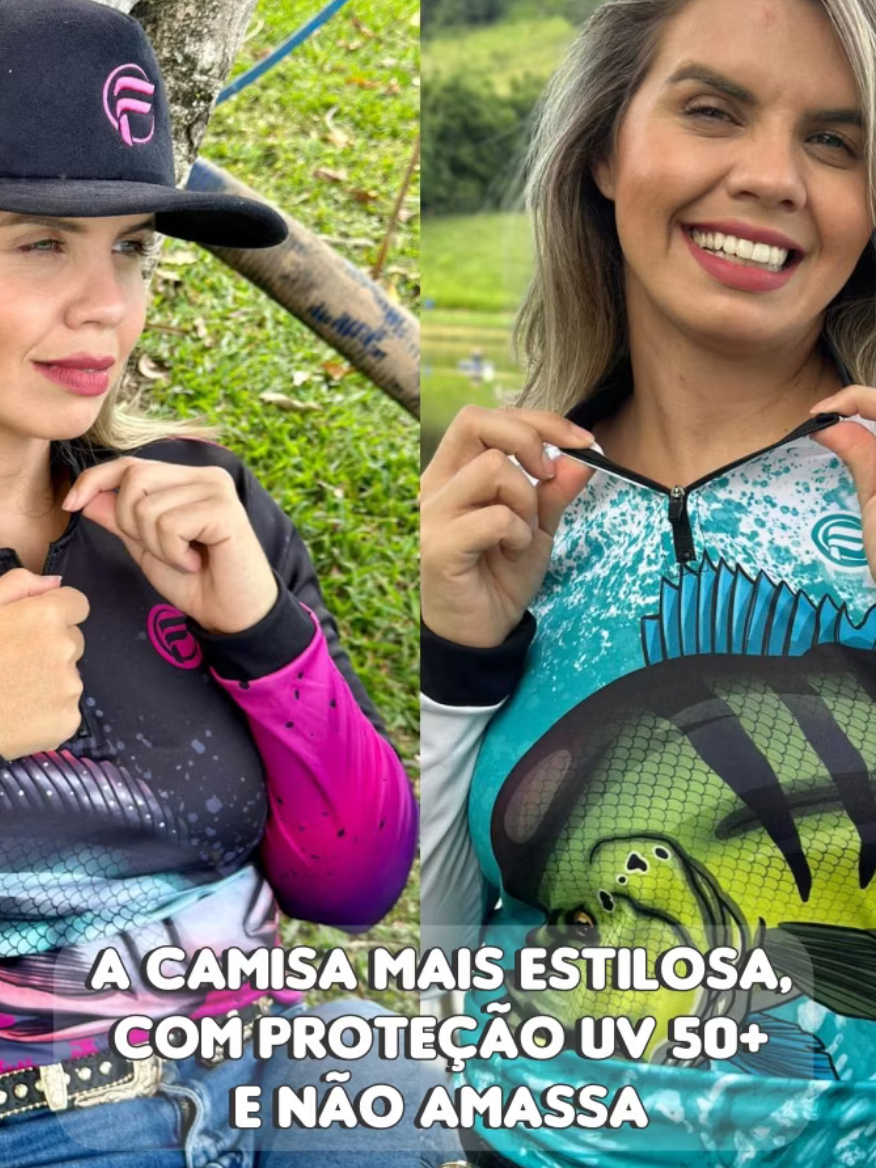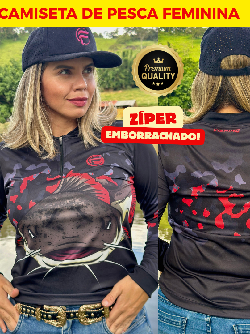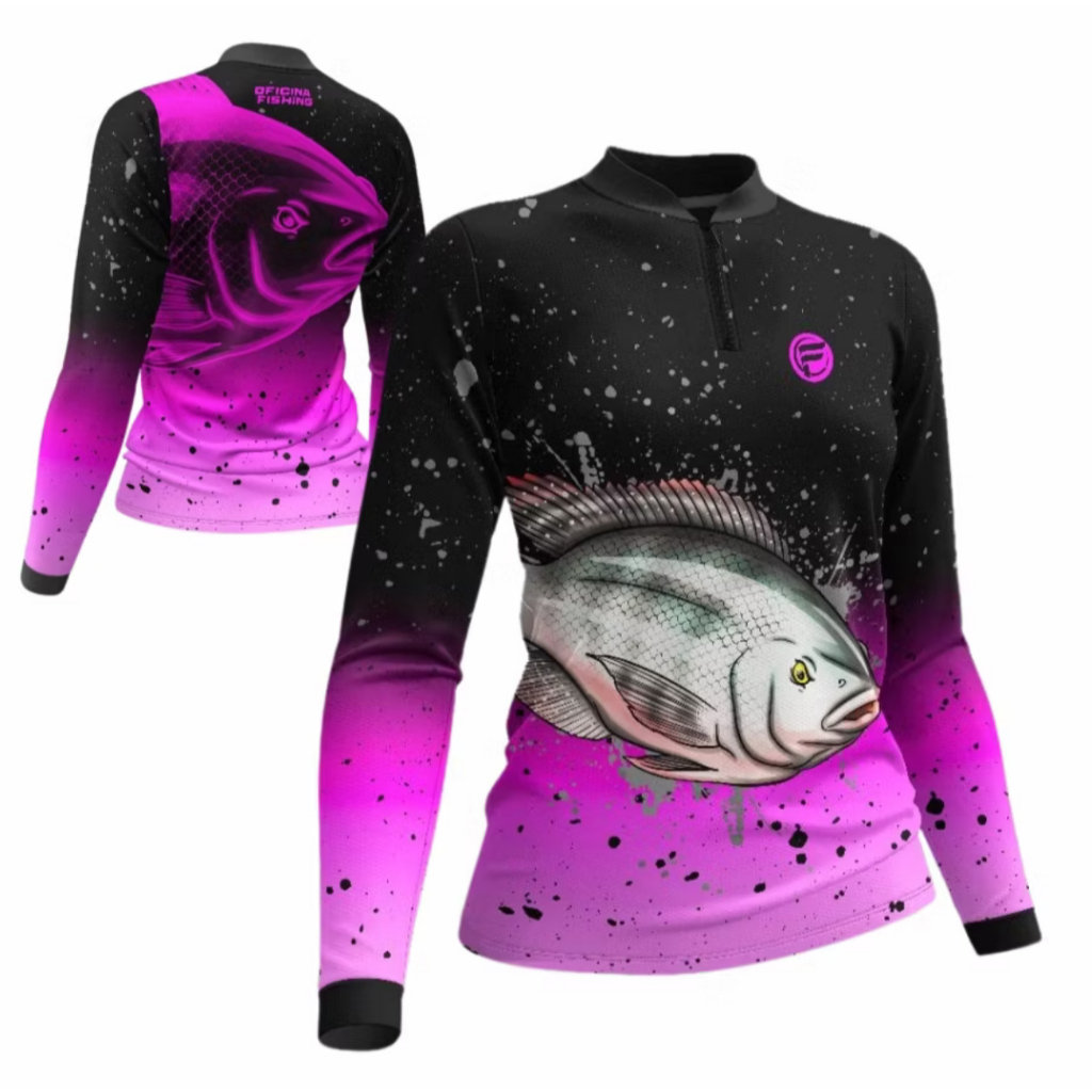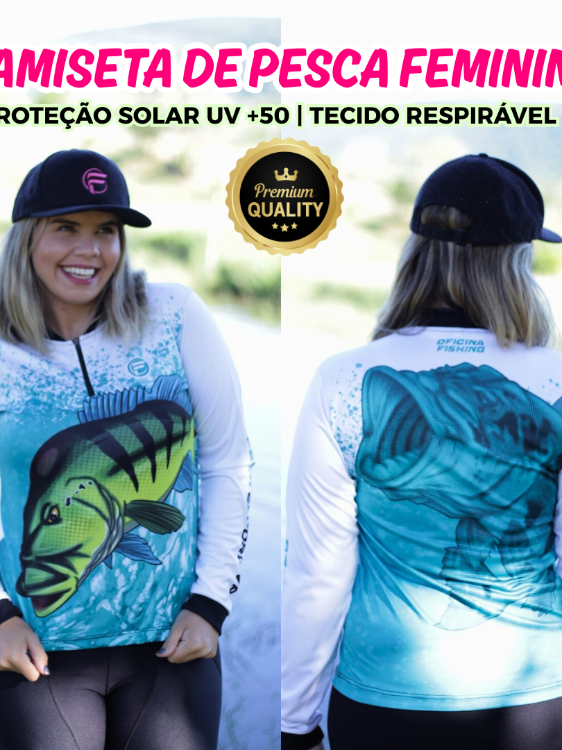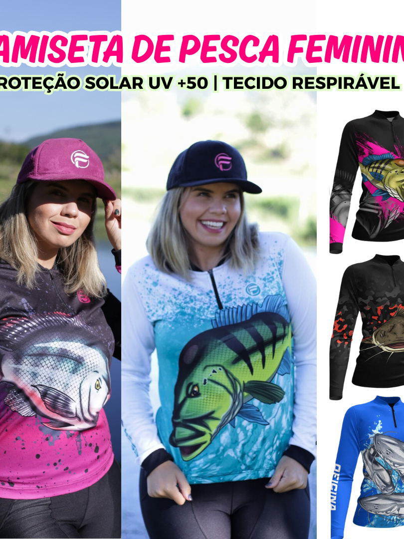 Camiseta Camisa de Pesca Feminina proteção UV com Zíper para mulher dryfit tucunare pirarara