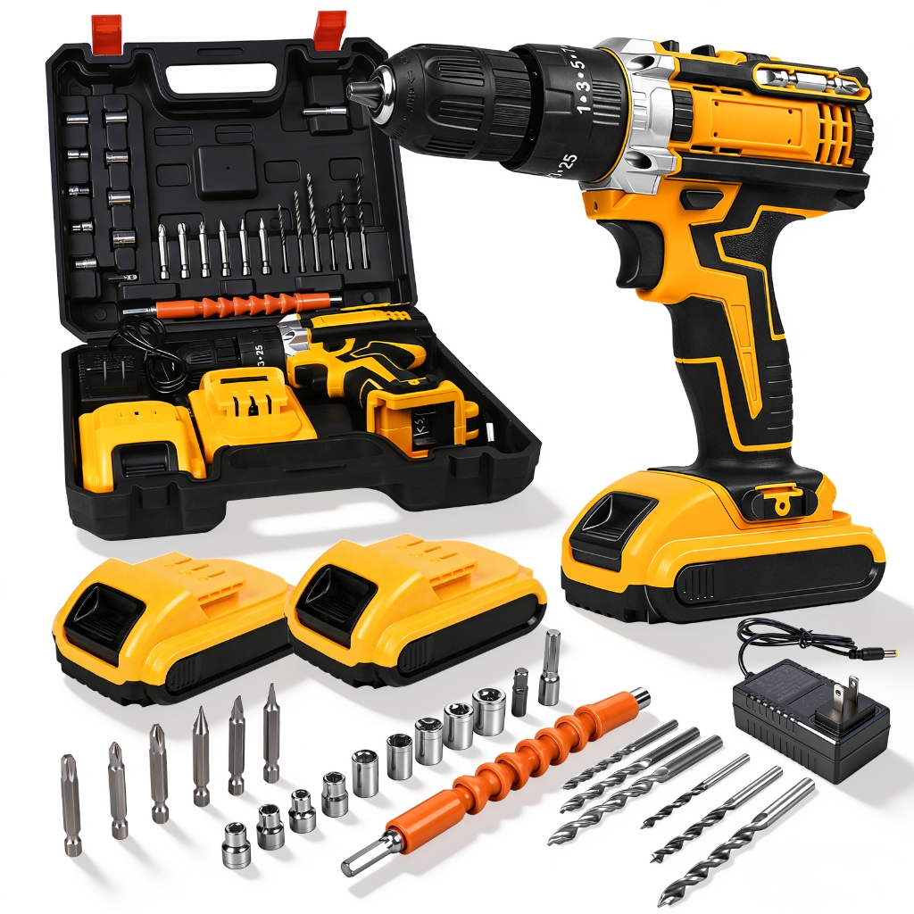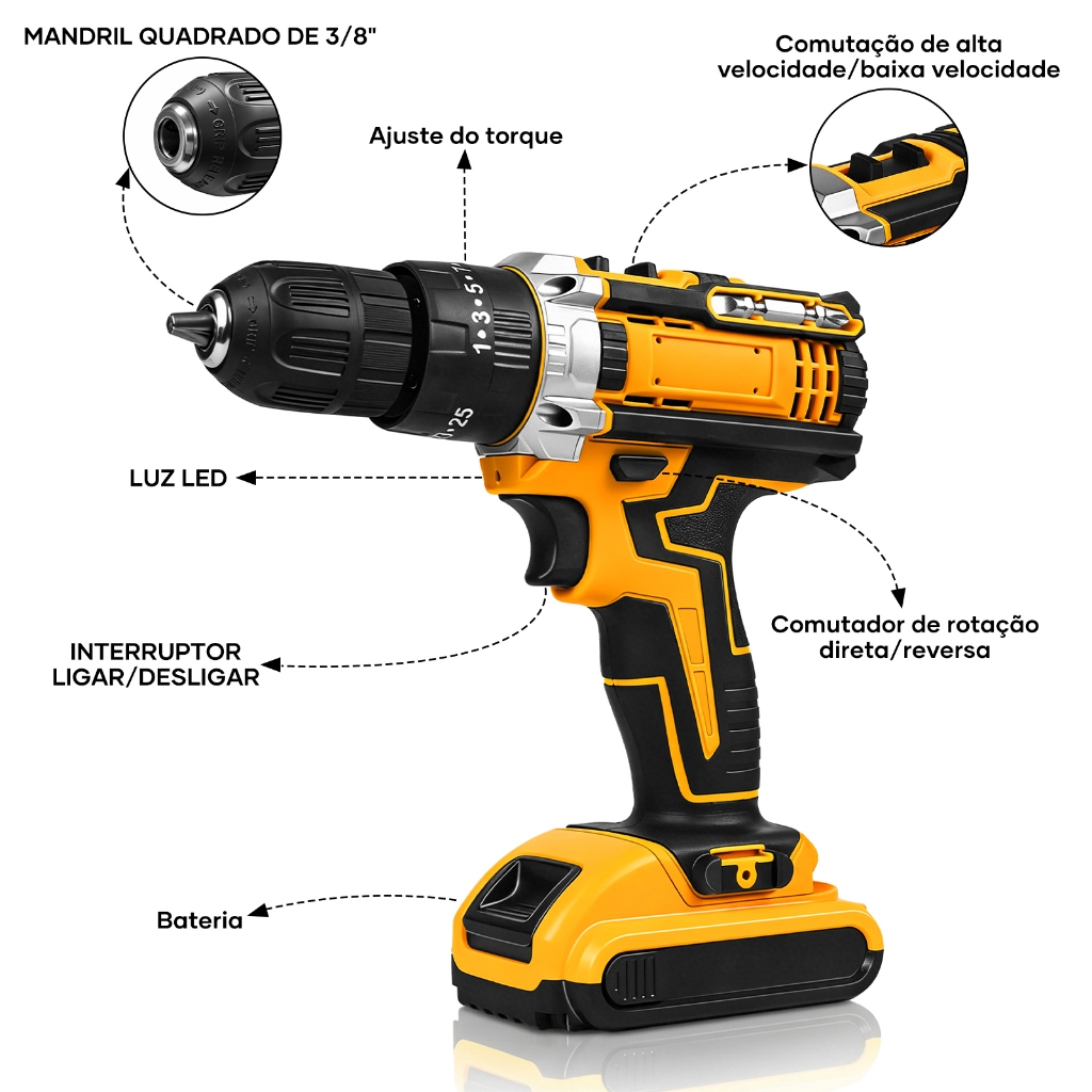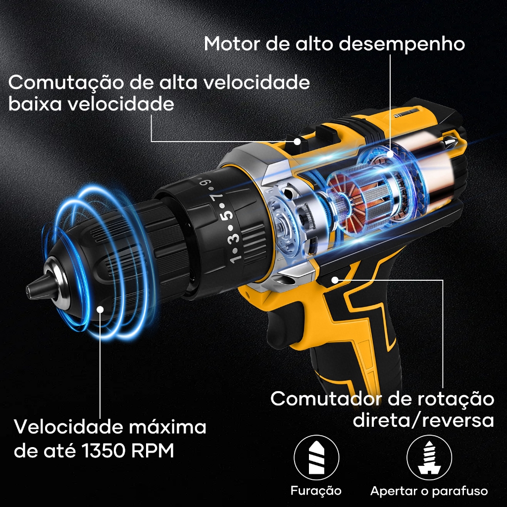 Kit Parafusadeira Furadeira Sem Fio Impacto com 2 Baterias 21V 45NM Profissional, Maleta + Brocas/Bits
