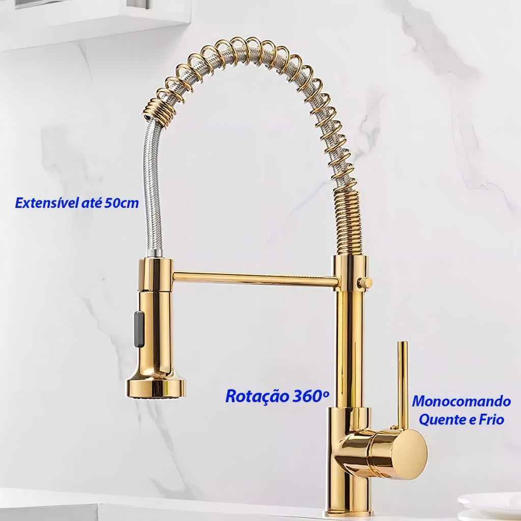 Torneira Cozinha Gourmet Dourada Monocomando Misturador Com Spray Extensor 304 Aço Inox Luxo