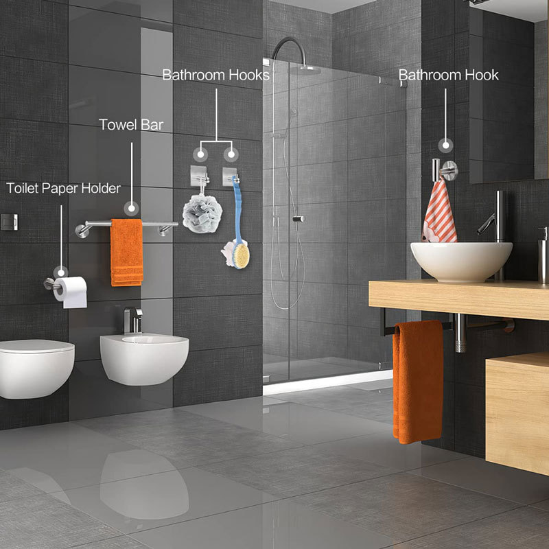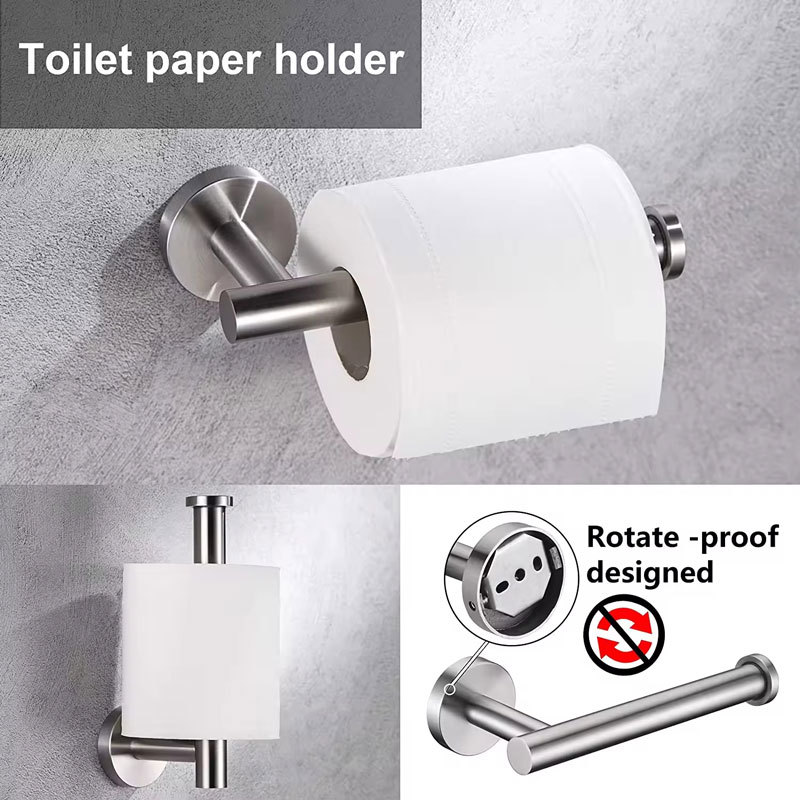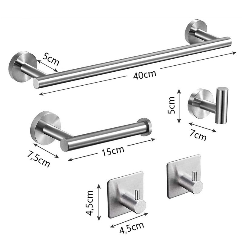Kit 5 Banheiro Completo Inox com Papeleira e Ganchos Prata Escovado