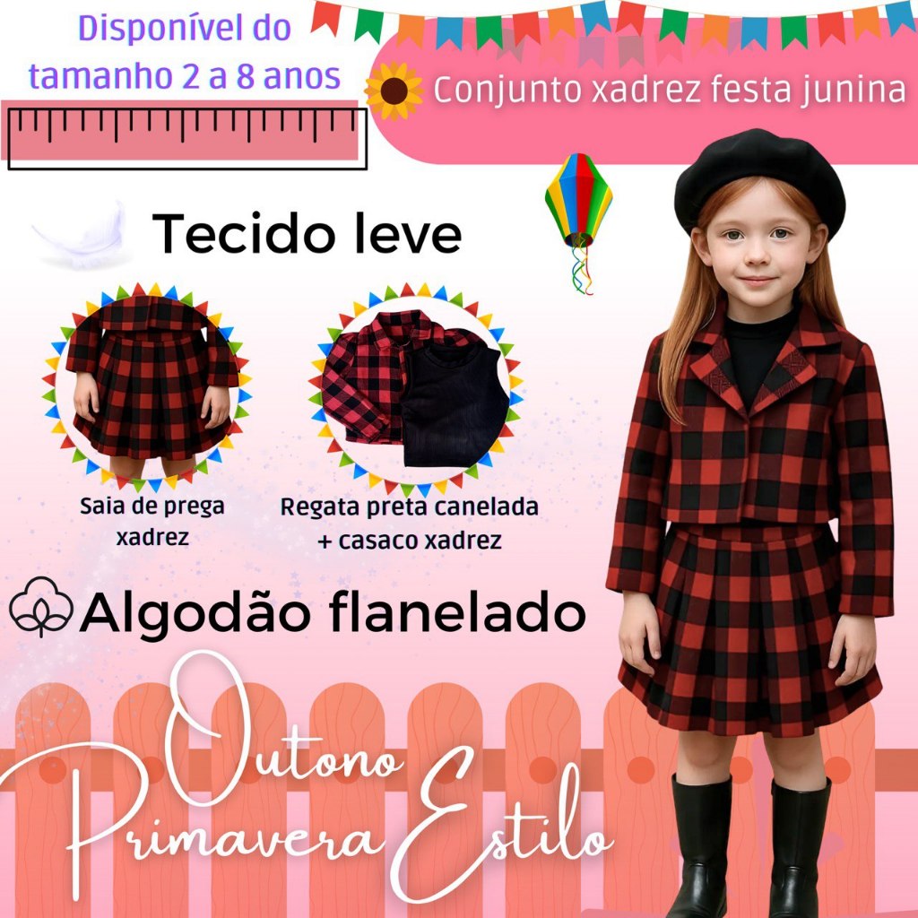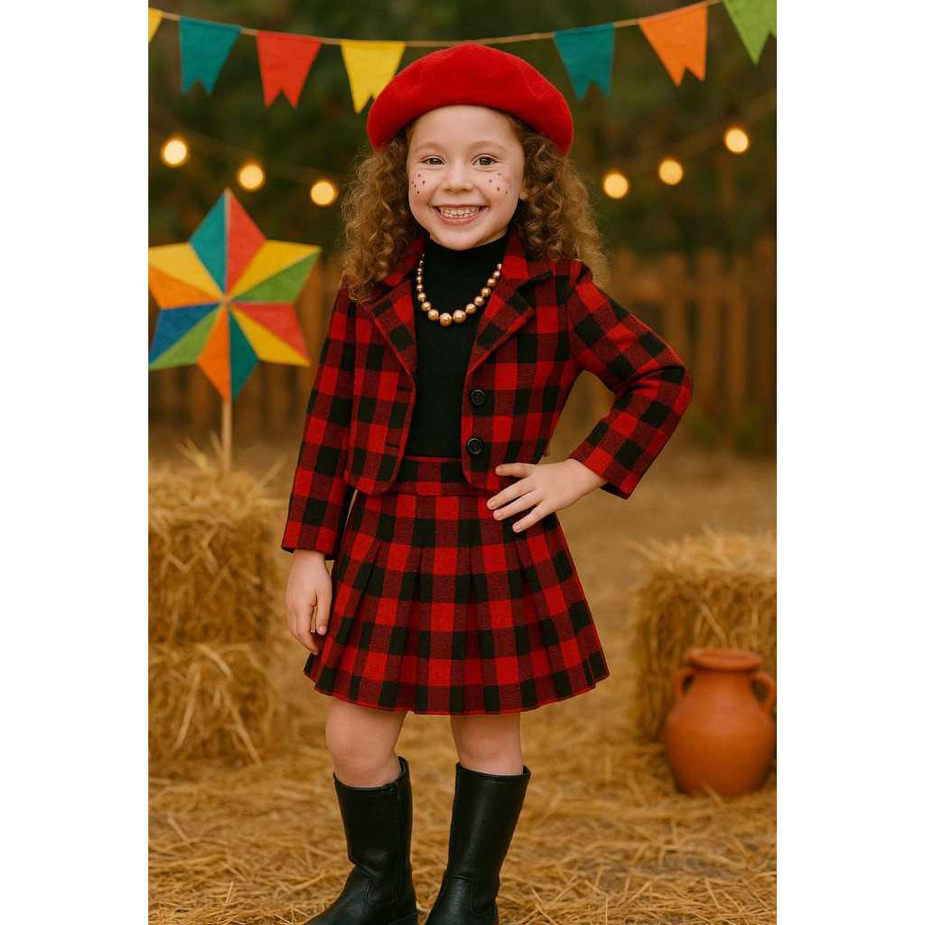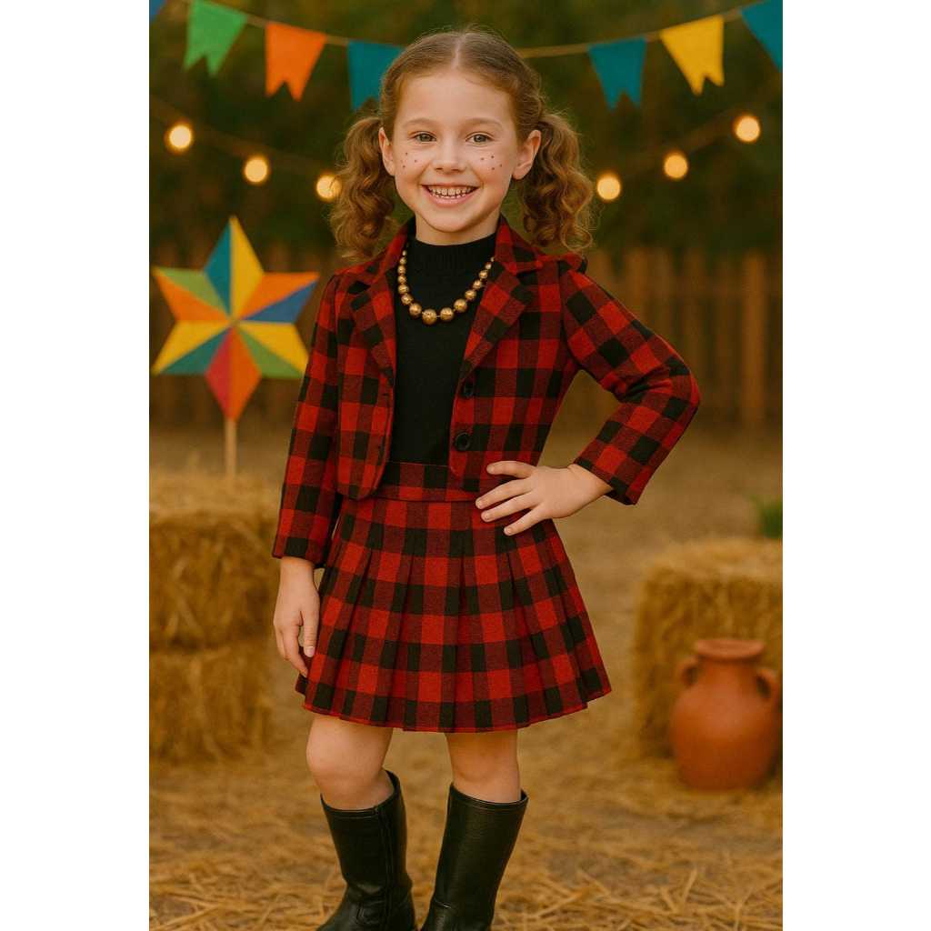 Conjunto Infantil Xadrez Vermelho Feminino – Jaqueta e Saia Moda Inverno Menina Estilosa