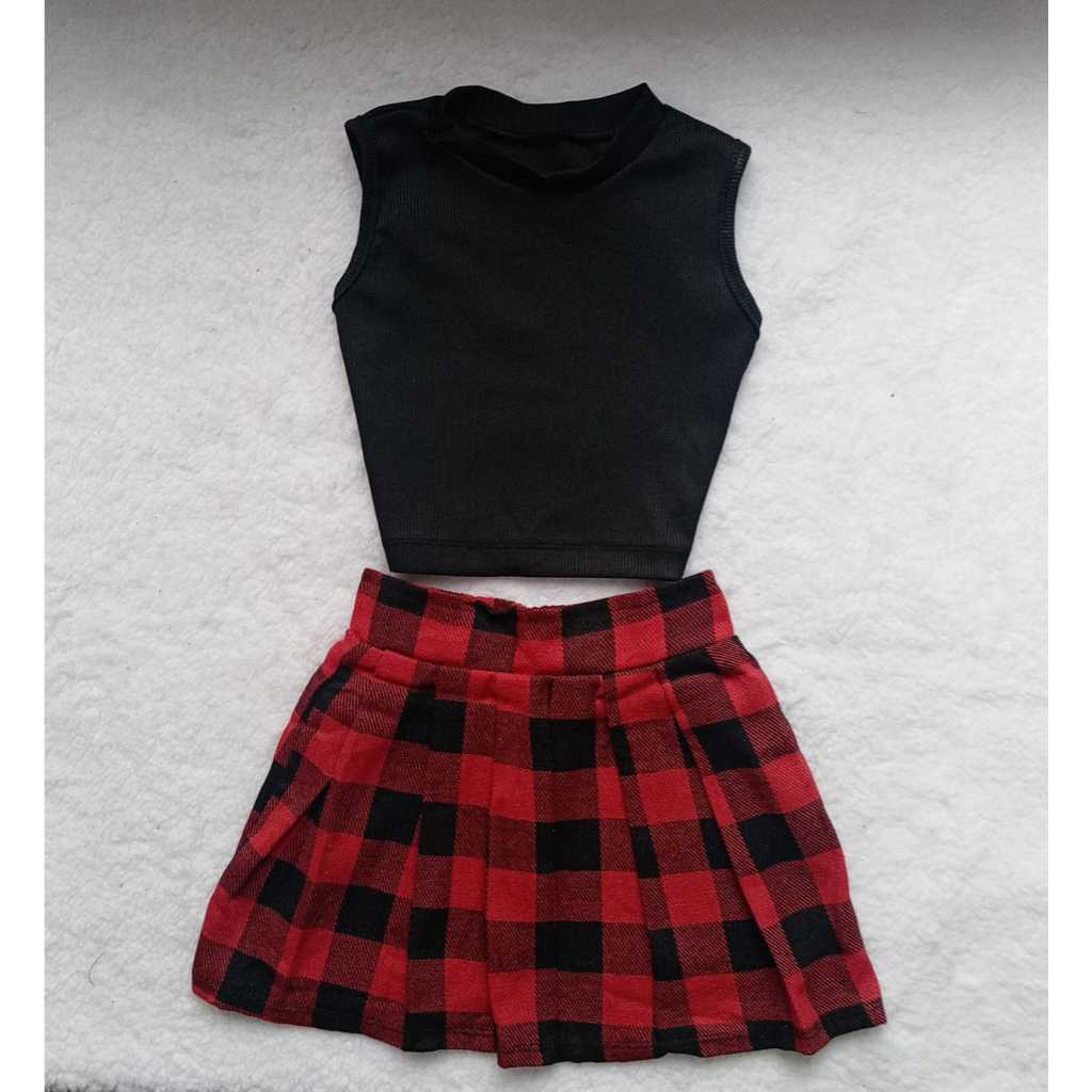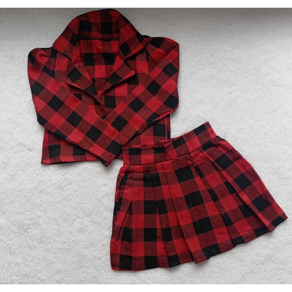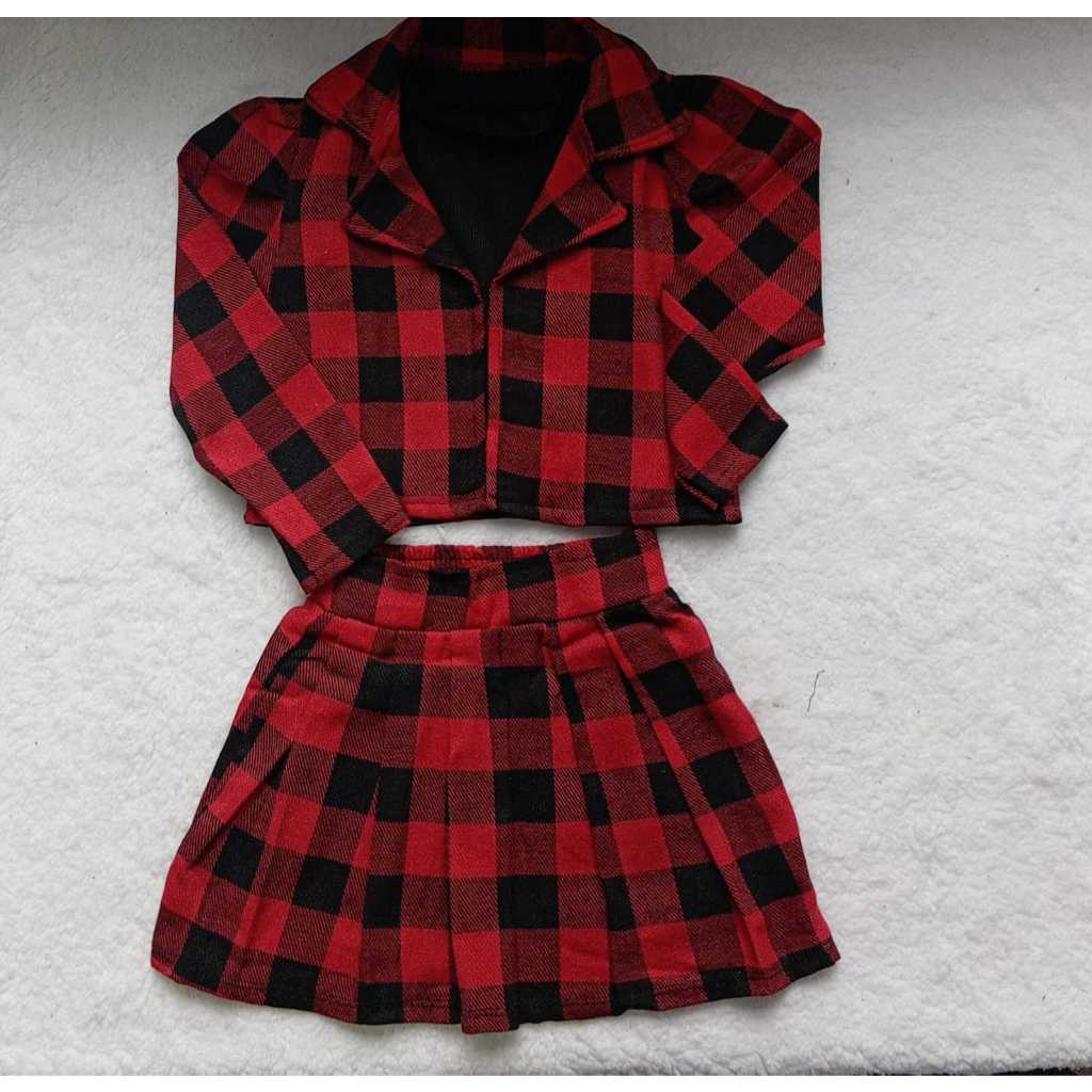 Conjunto Infantil Xadrez Vermelho Feminino – Jaqueta e Saia Moda Inverno Menina Estilosa