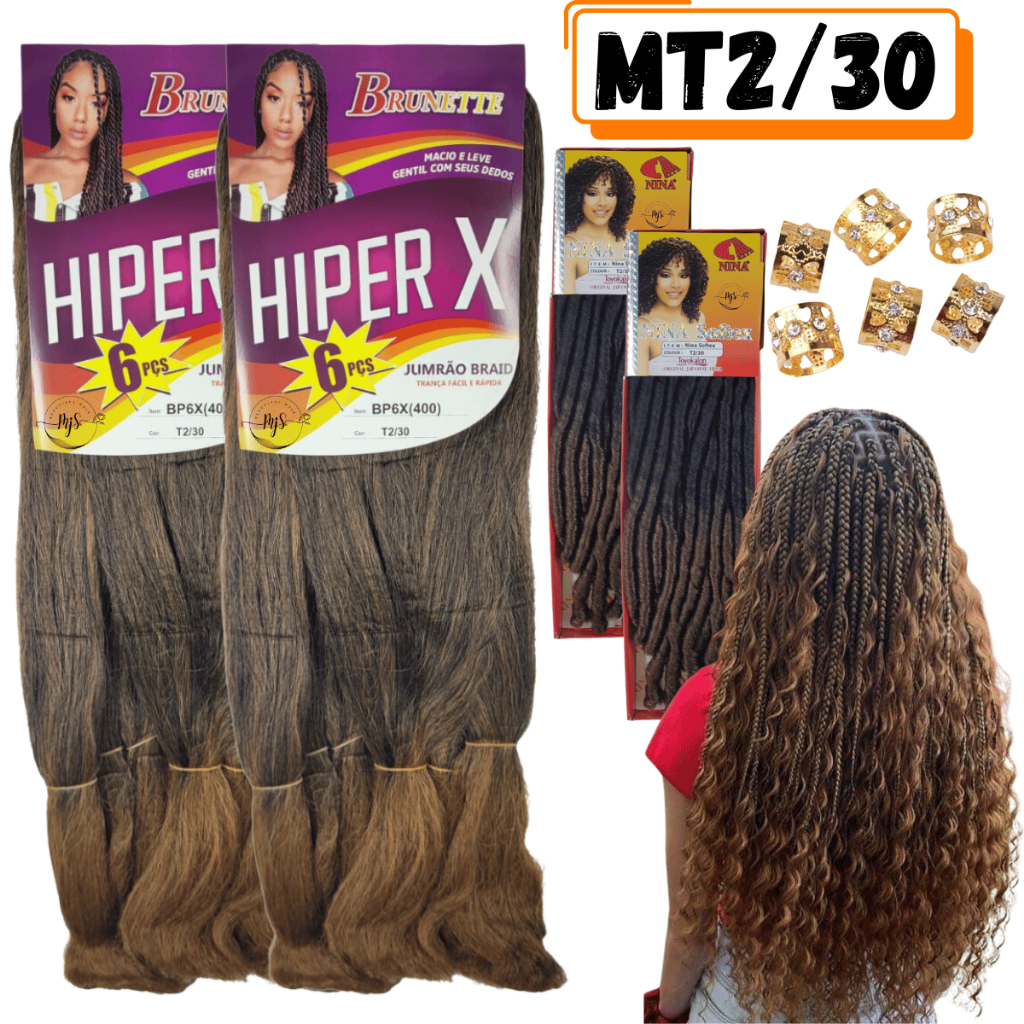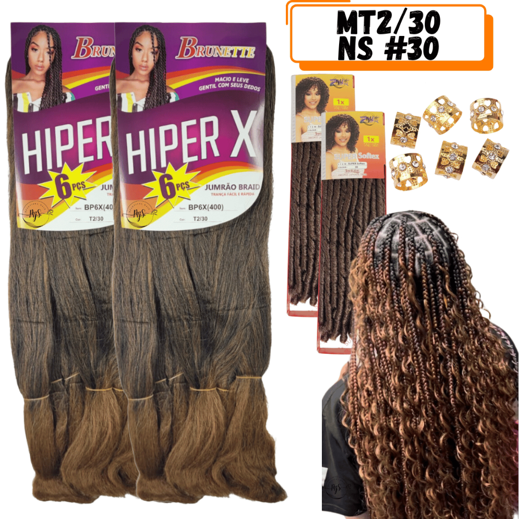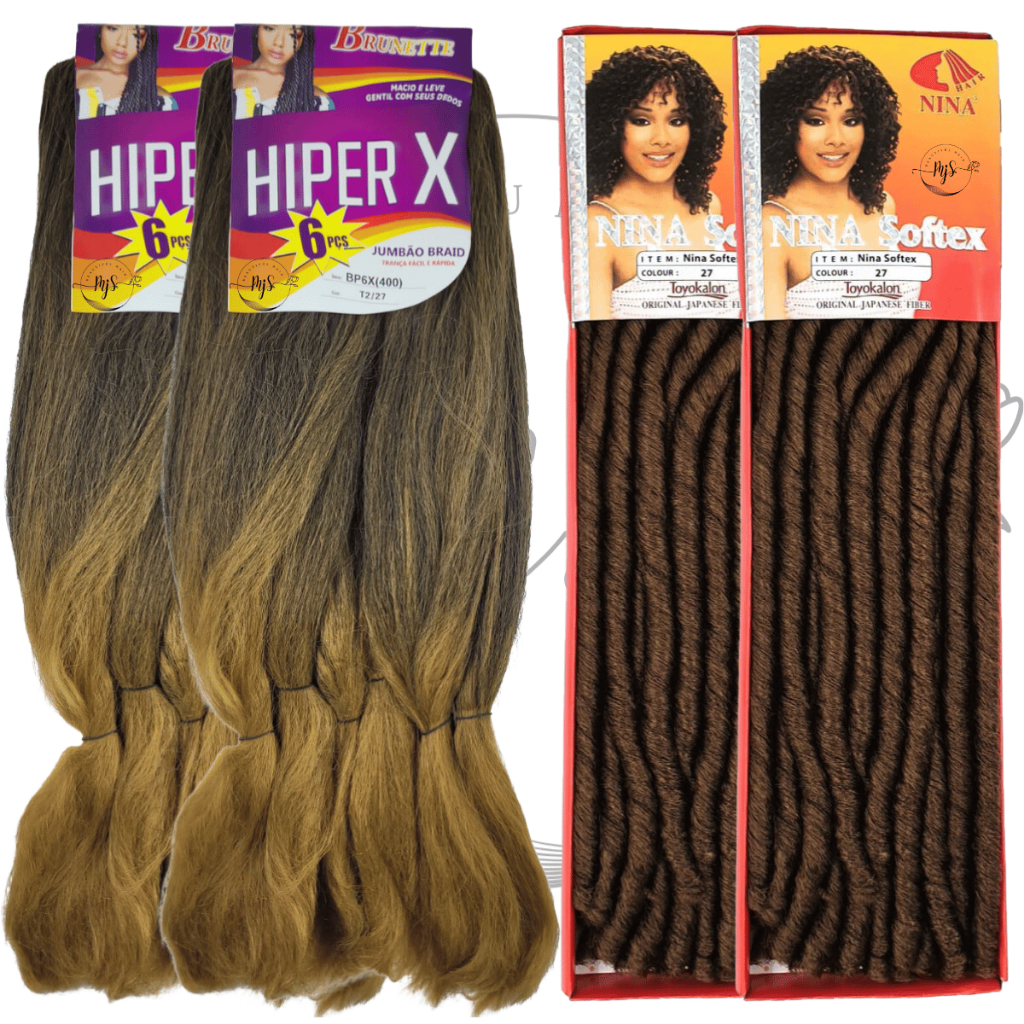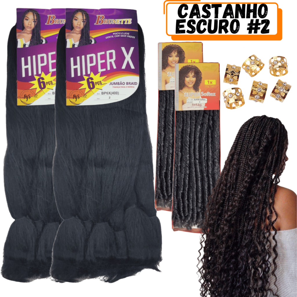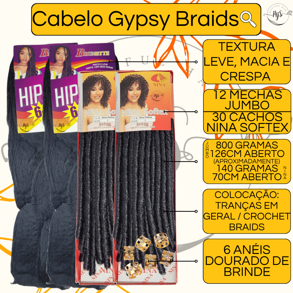 Kit 2 Cabelos Jumbo Jumbão Hiper X Gypsy Braids Kanekalon 400 Gramas + 2 Cabelo Nina Softex Cacheado + Anéis de Enfeite