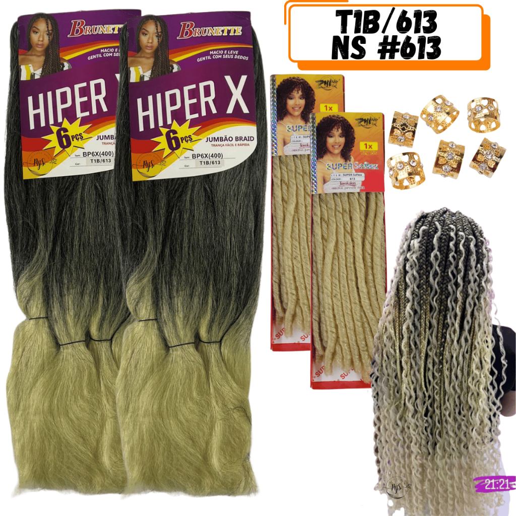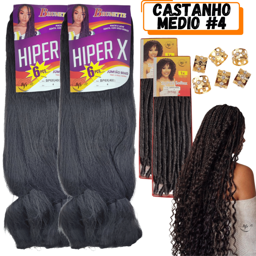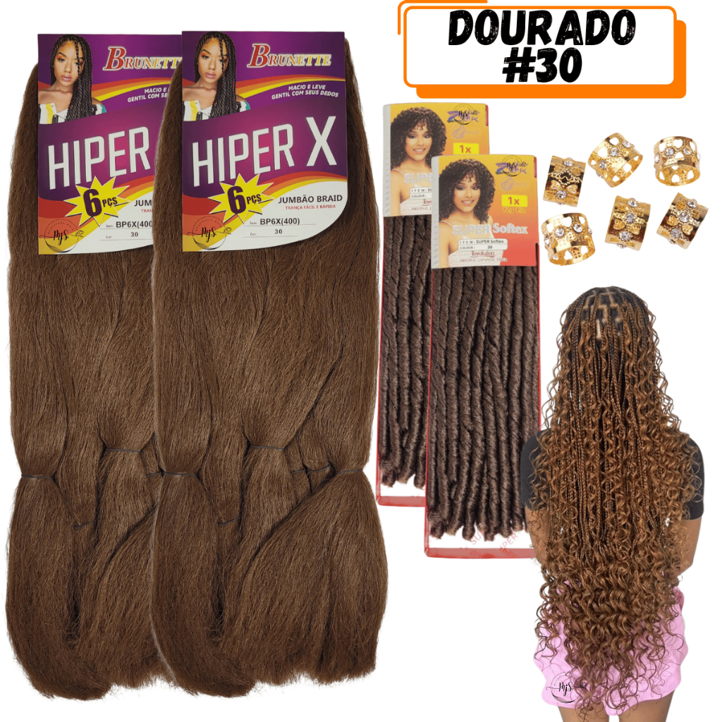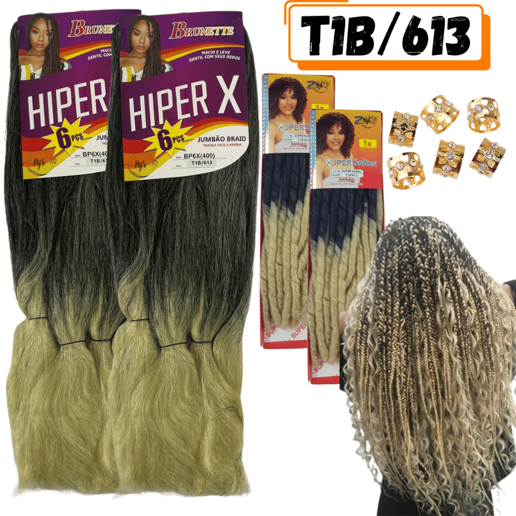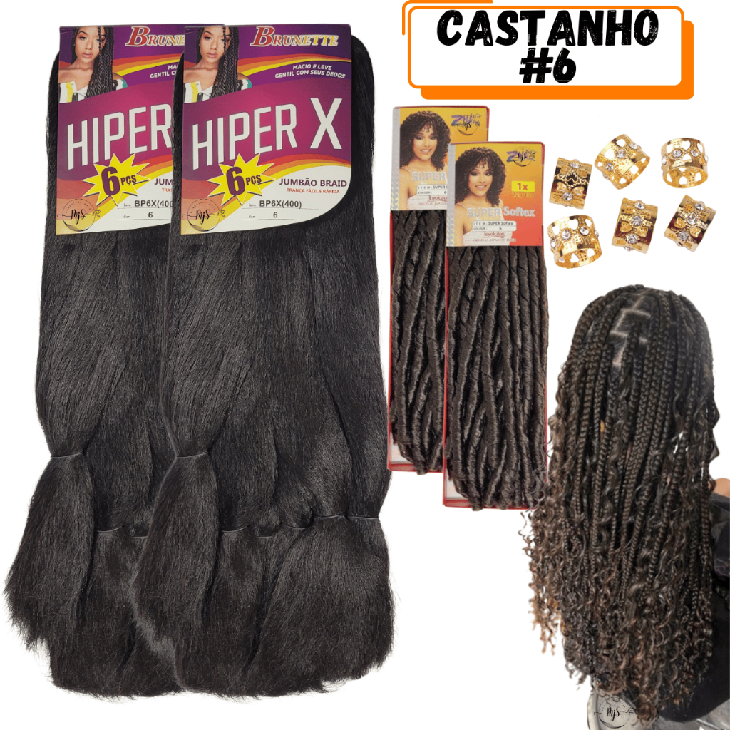 Kit 2 Cabelos Jumbo Jumbão Hiper X Gypsy Braids Kanekalon 400 Gramas + 2 Cabelo Nina Softex Cacheado + Anéis de Enfeite