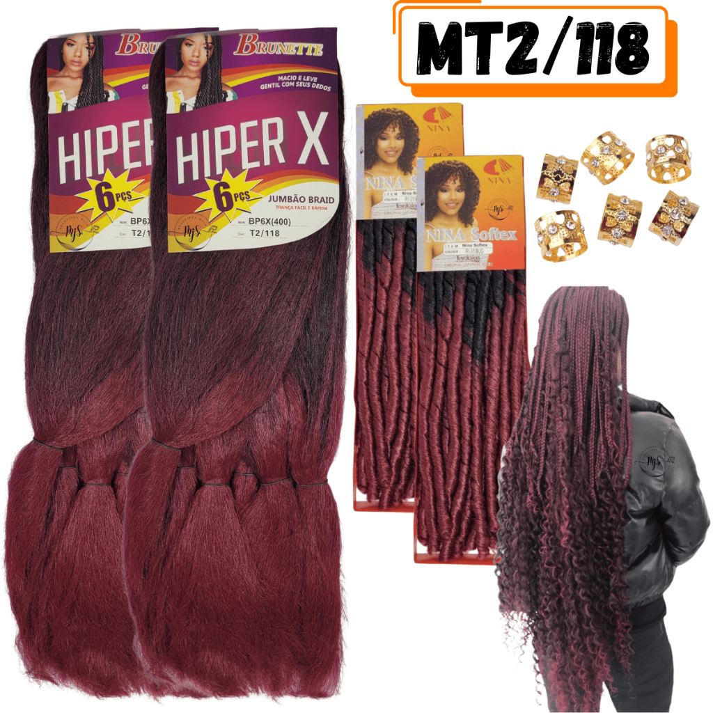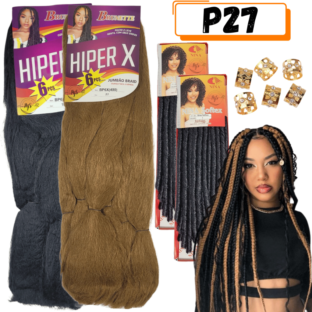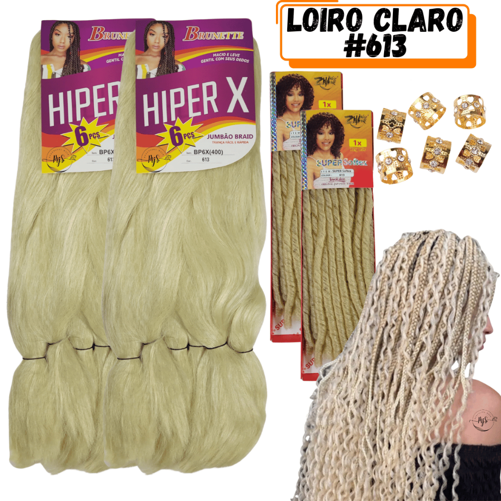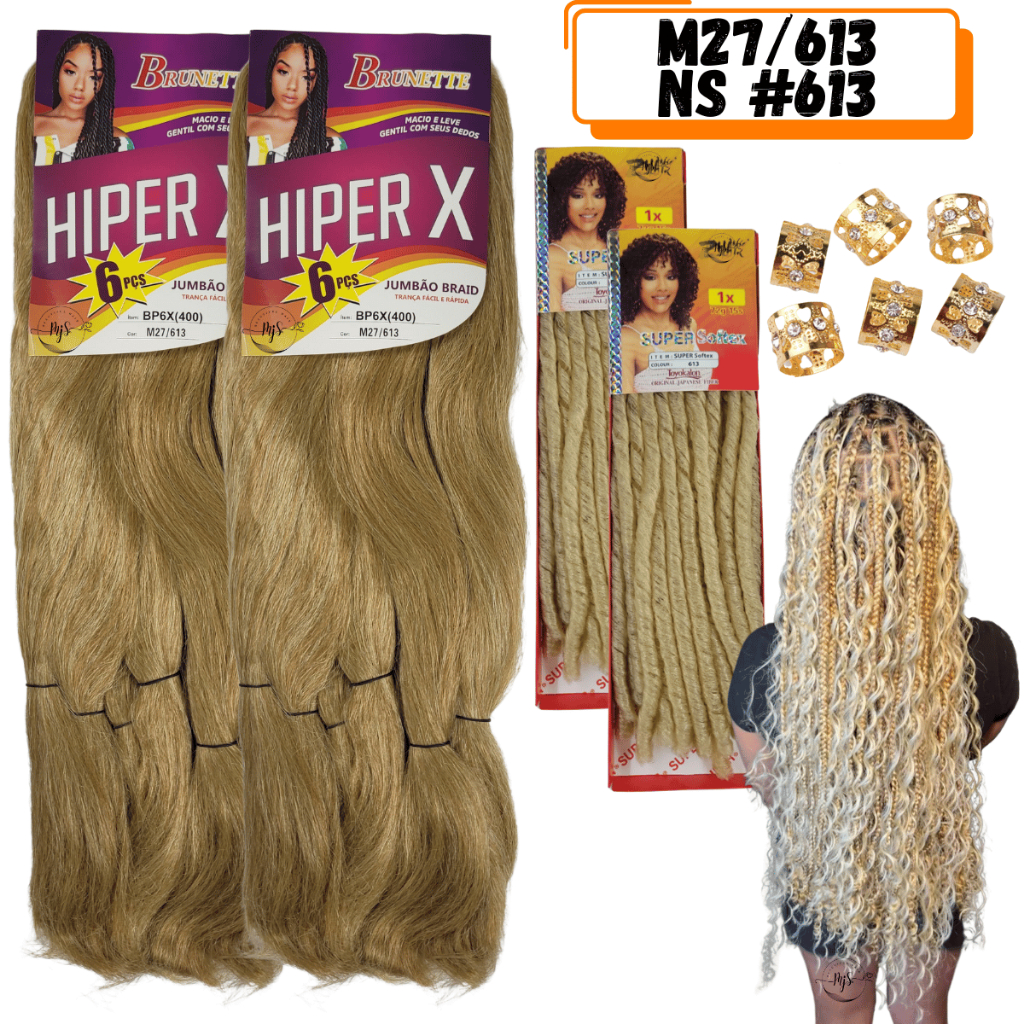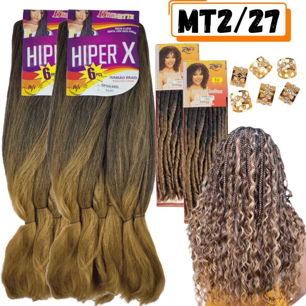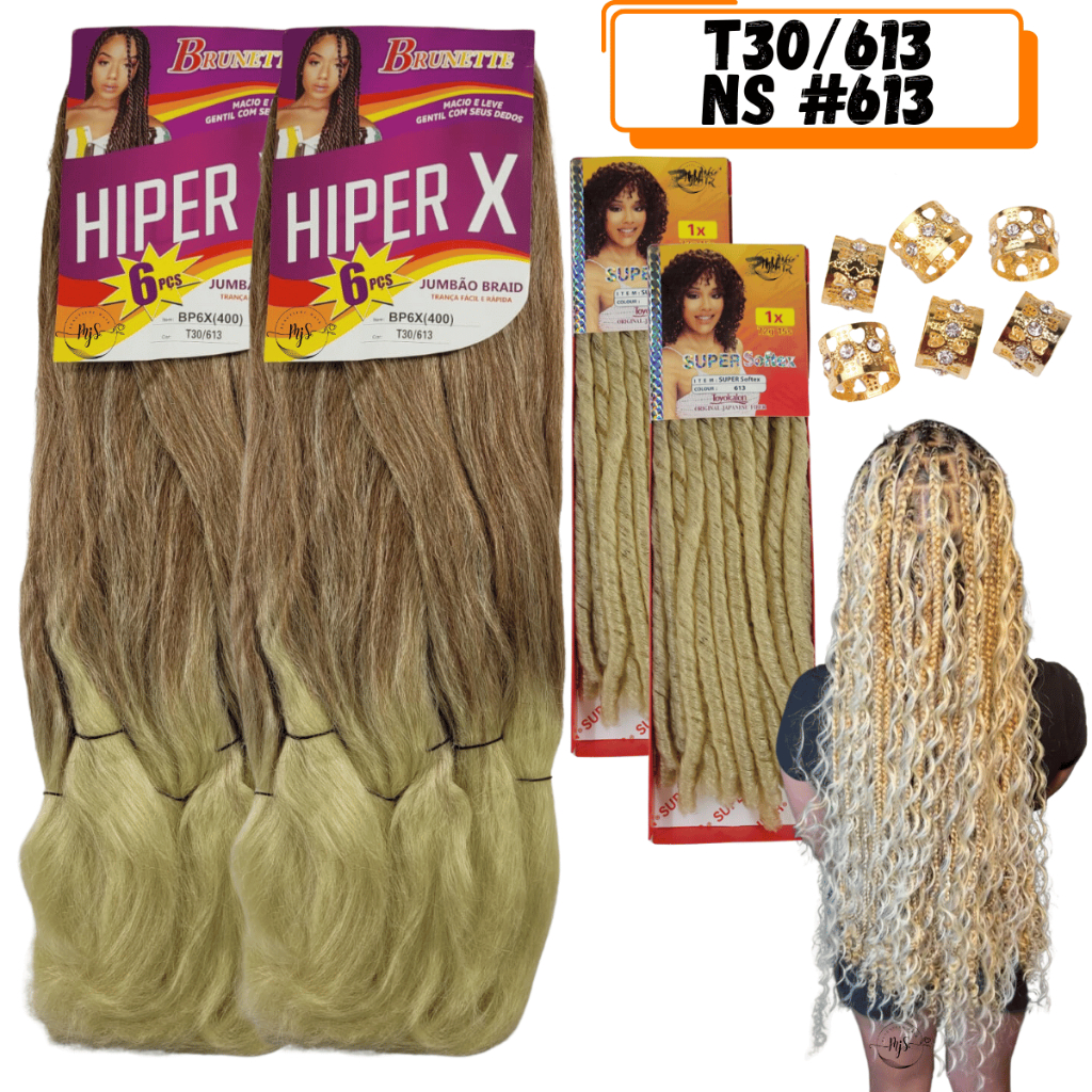 Kit 2 Cabelos Jumbo Jumbão Hiper X Gypsy Braids Kanekalon 400 Gramas + 2 Cabelo Nina Softex Cacheado + Anéis de Enfeite