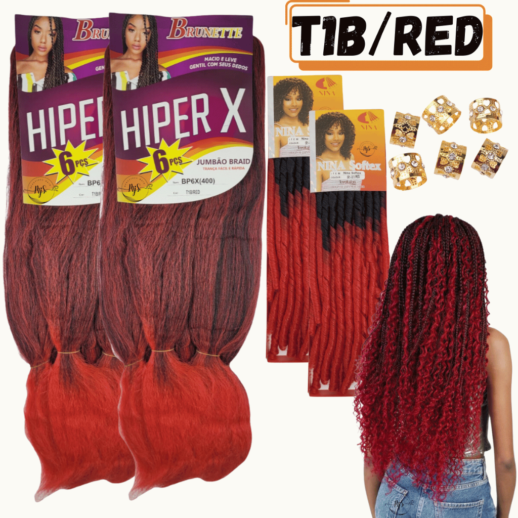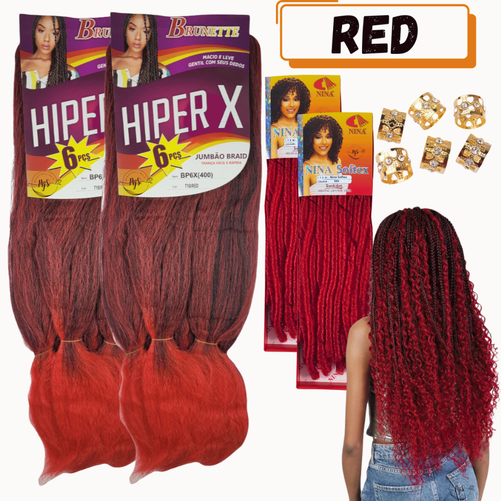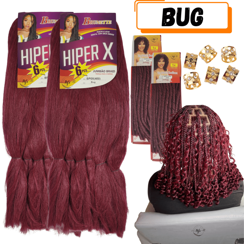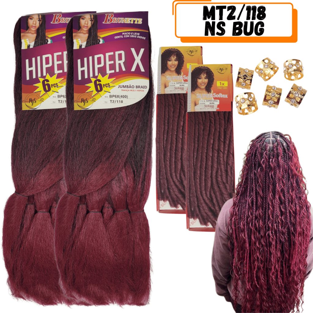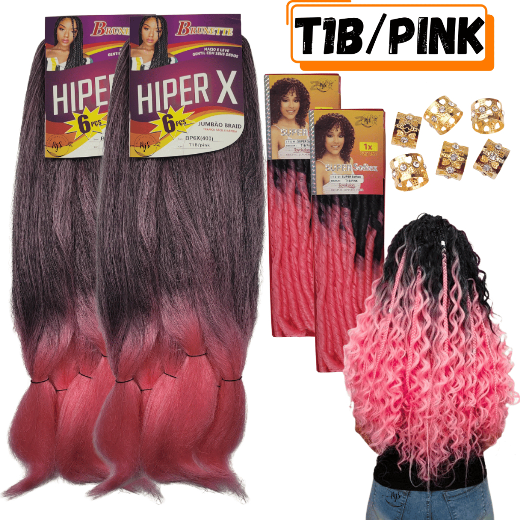 Kit 2 Cabelos Jumbo Jumbão Hiper X Gypsy Braids Kanekalon 400 Gramas + 2 Cabelo Nina Softex Cacheado + Anéis de Enfeite