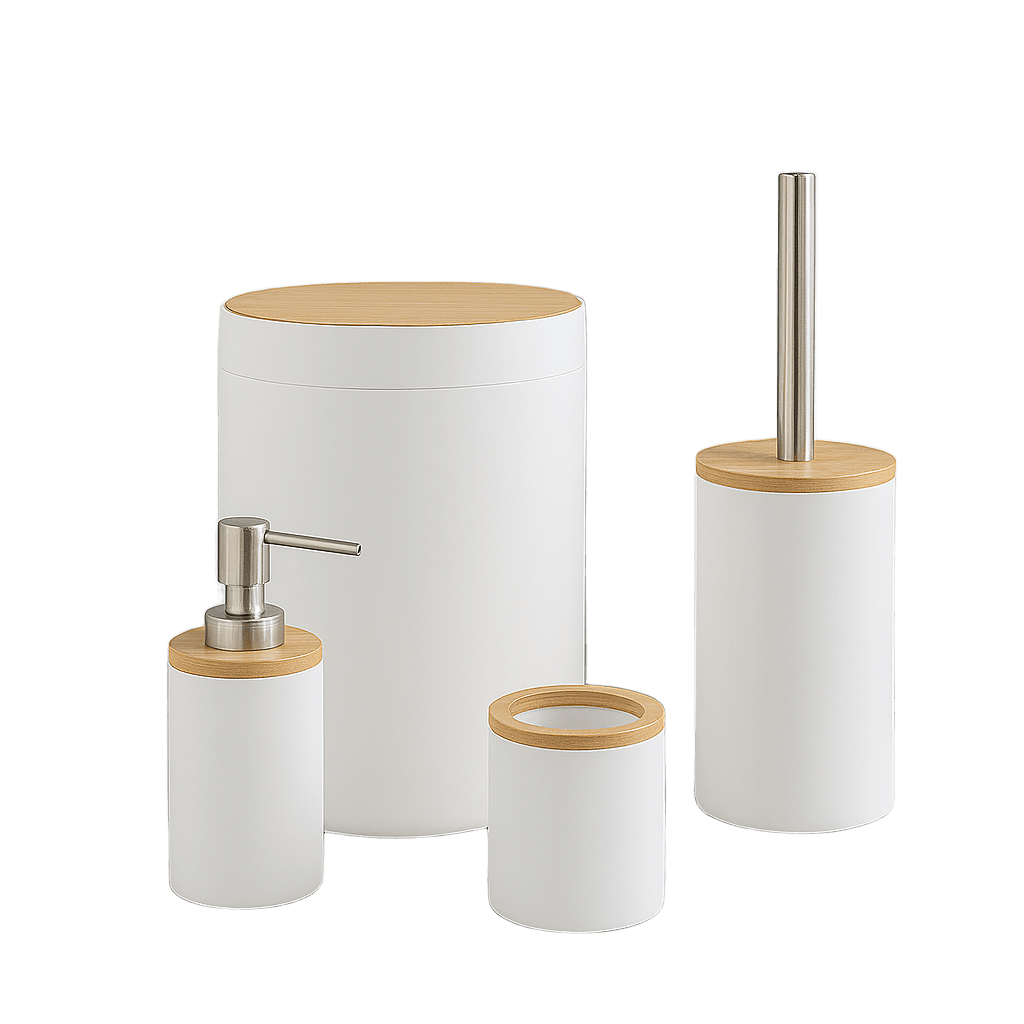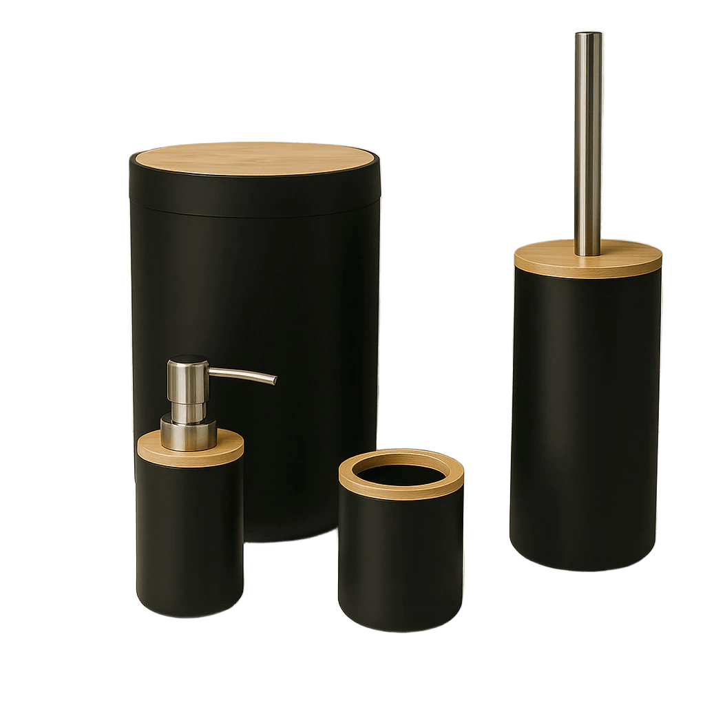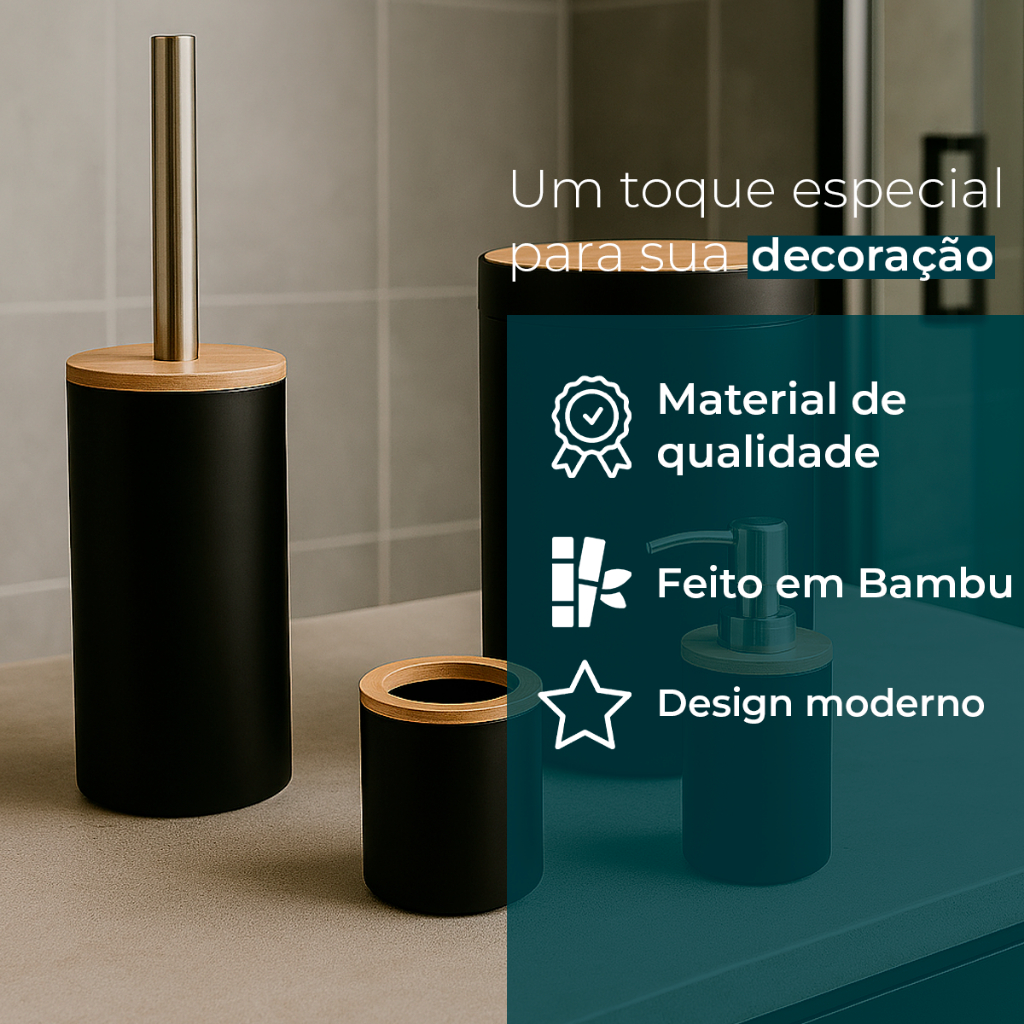 Kit Banheiro Conjunto 4 Peças Completo Lixeira Bambu Escova Sanitária Moderno Lavabo