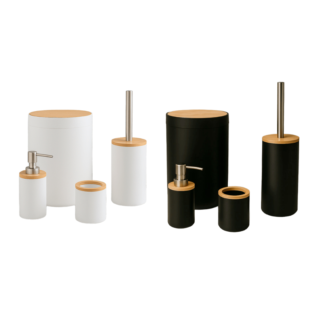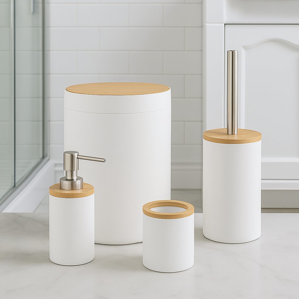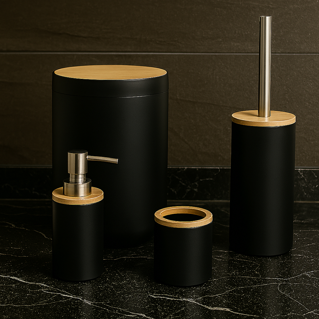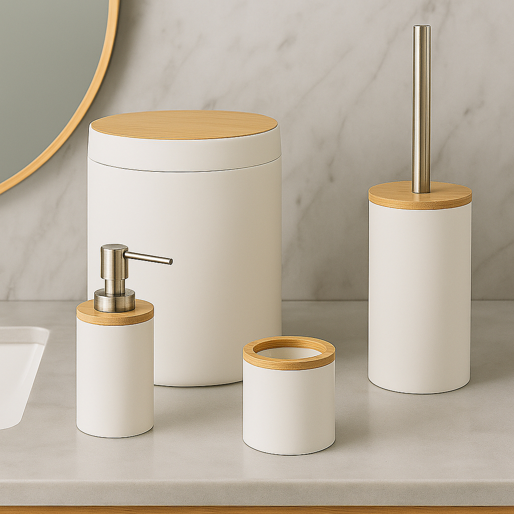 Kit Banheiro Conjunto 4 Peças Completo Lixeira Bambu Escova Sanitária Moderno Lavabo
