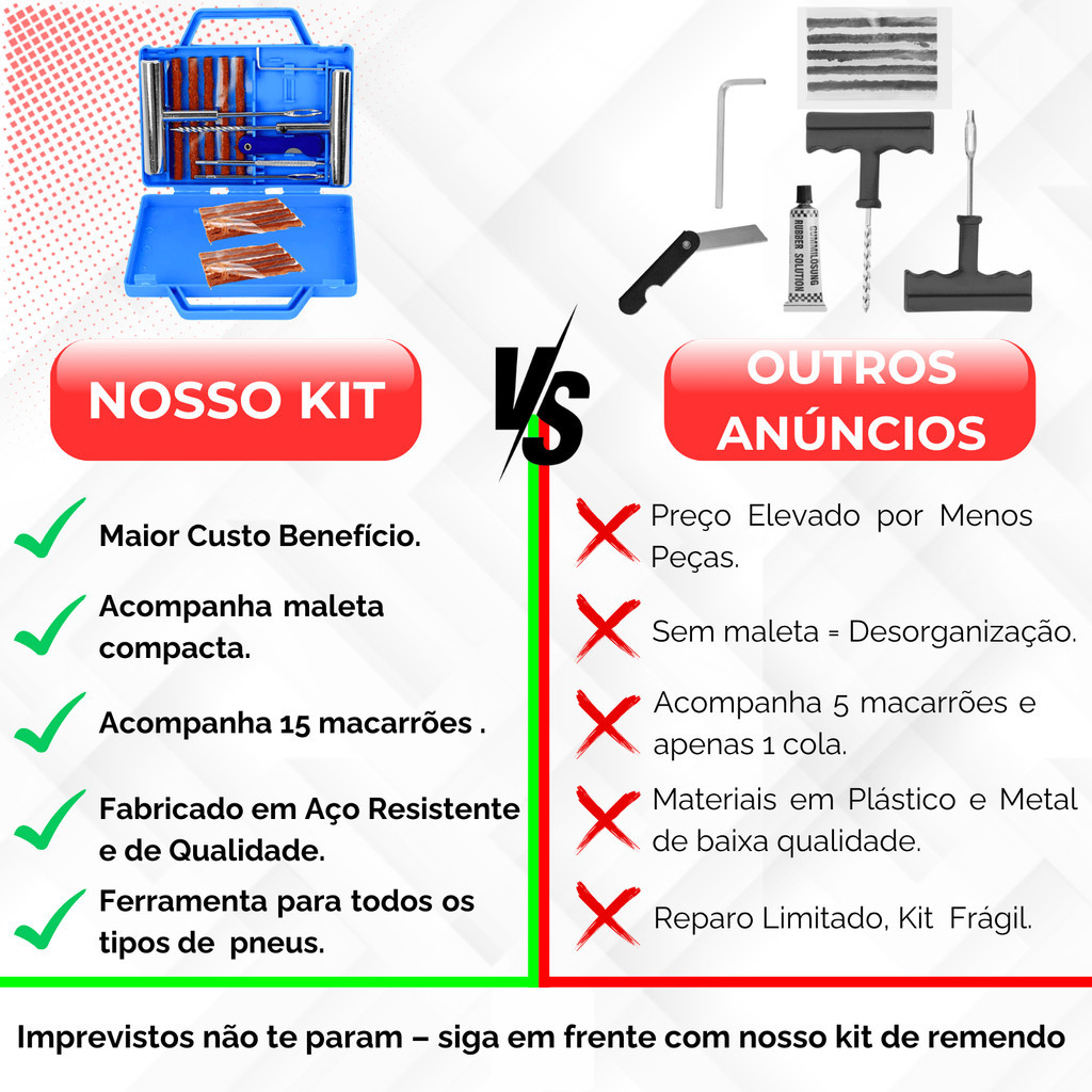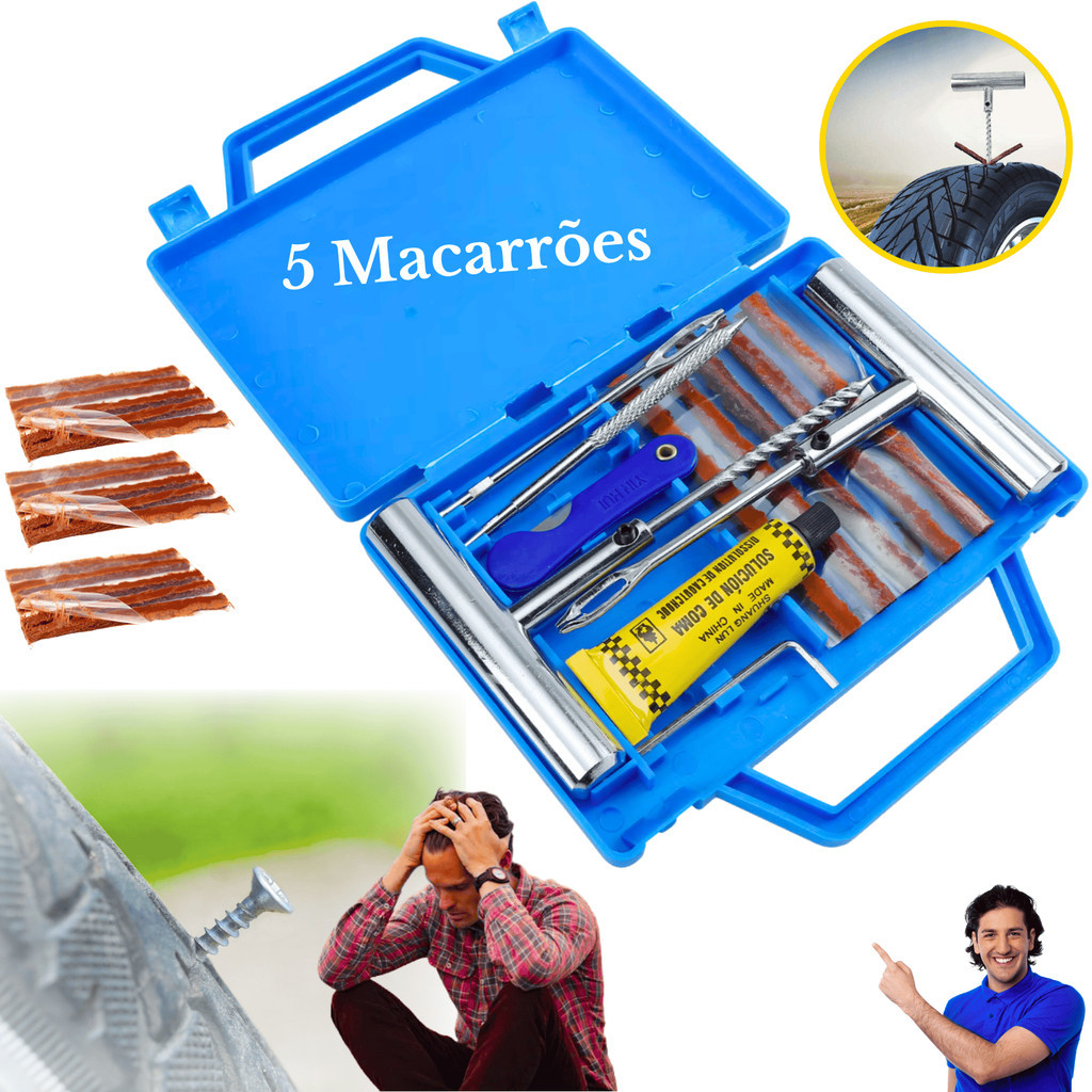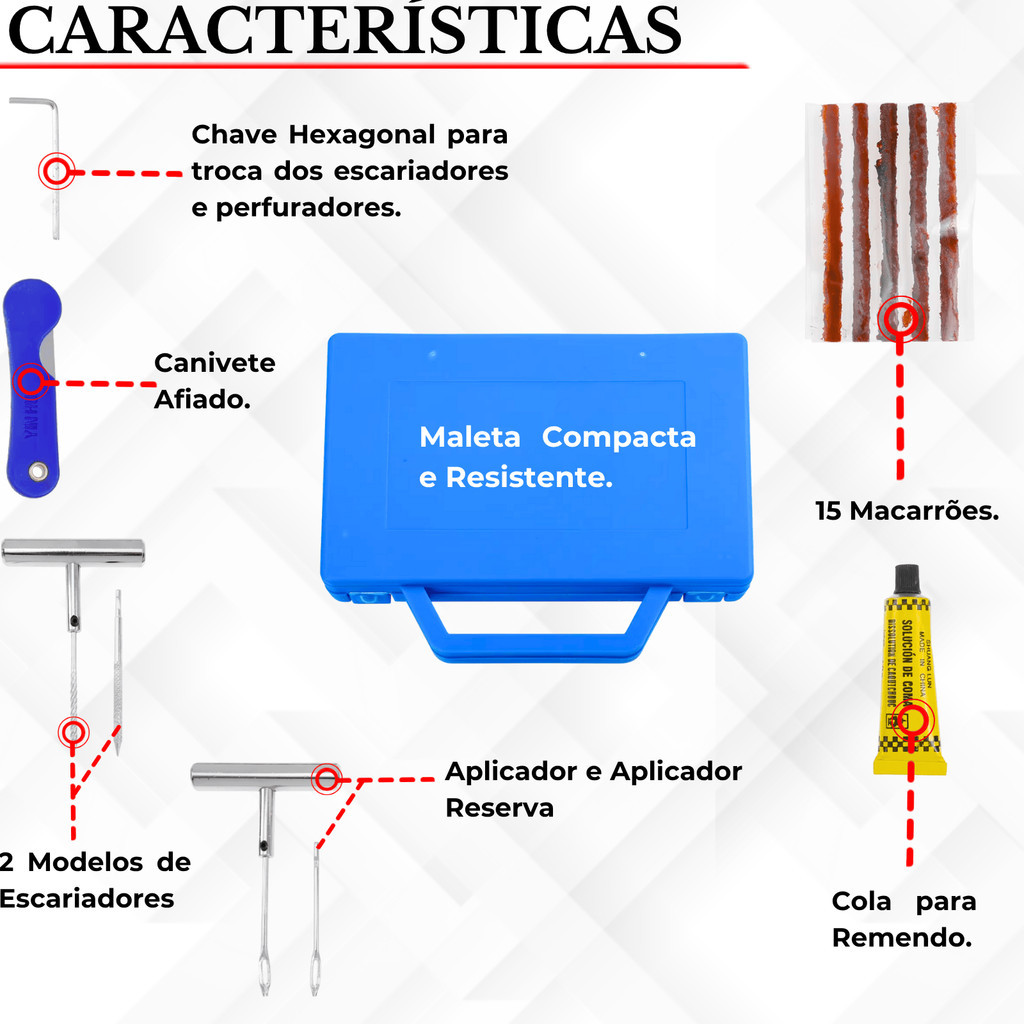 Kit Reparo Pneu Sem Câmara + Maleta 15 Remendos Moto E Carro Remendo Metal Macarrão Motos Refis