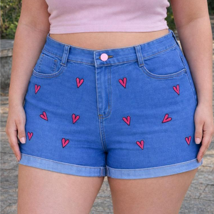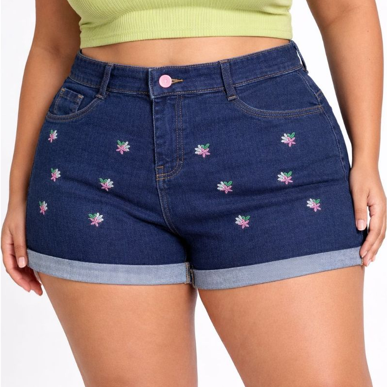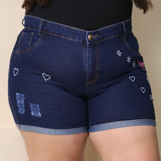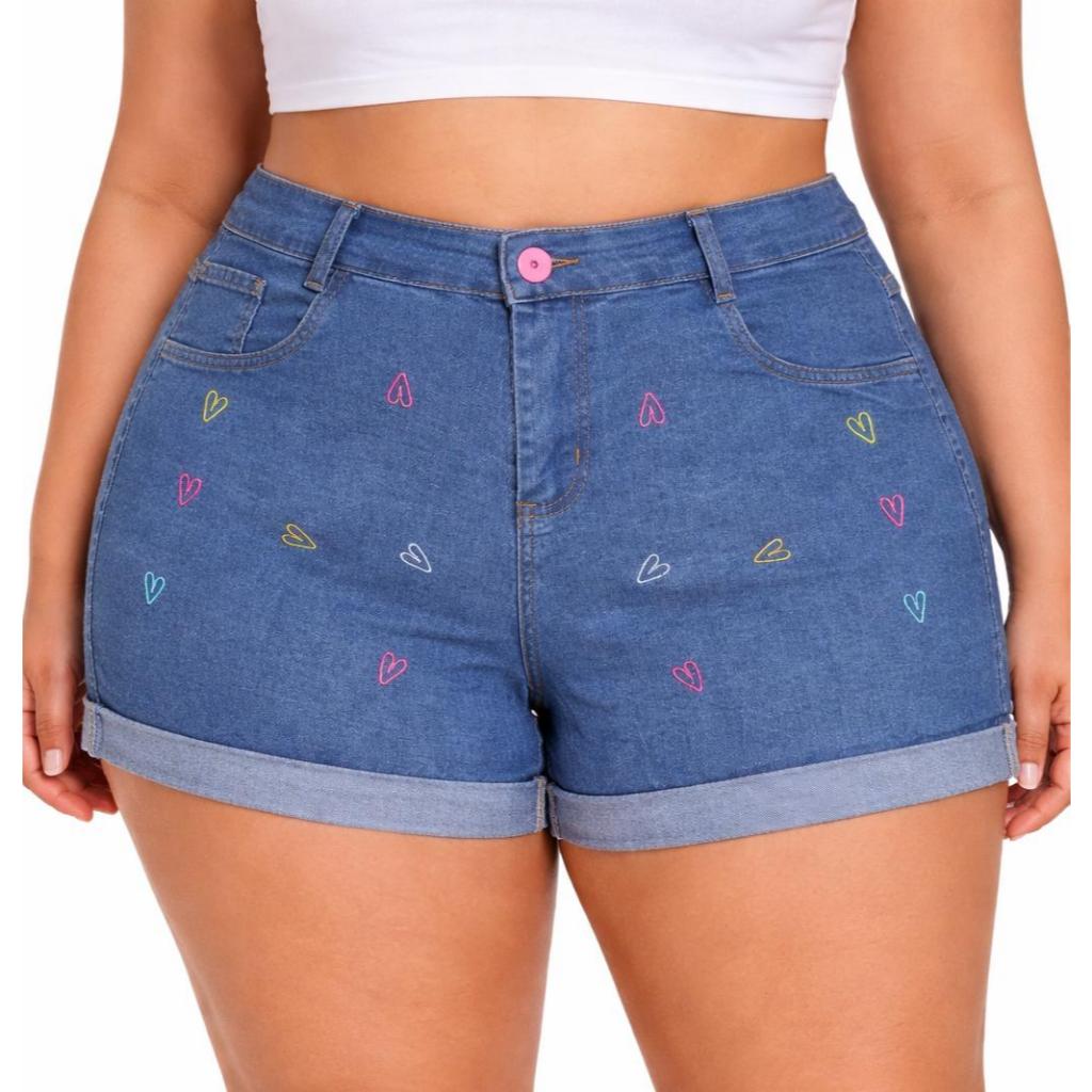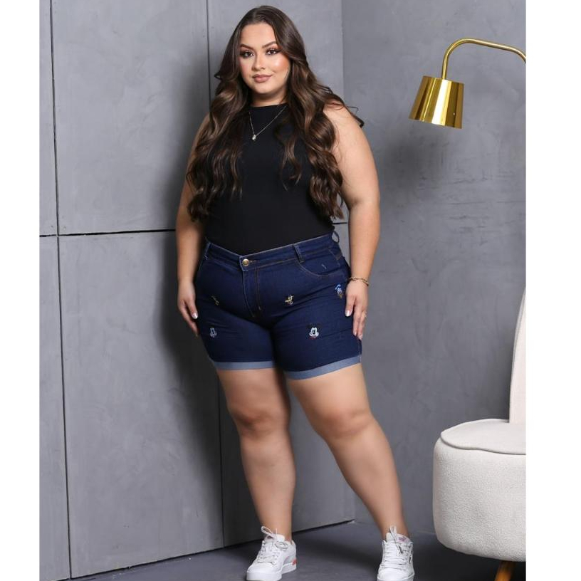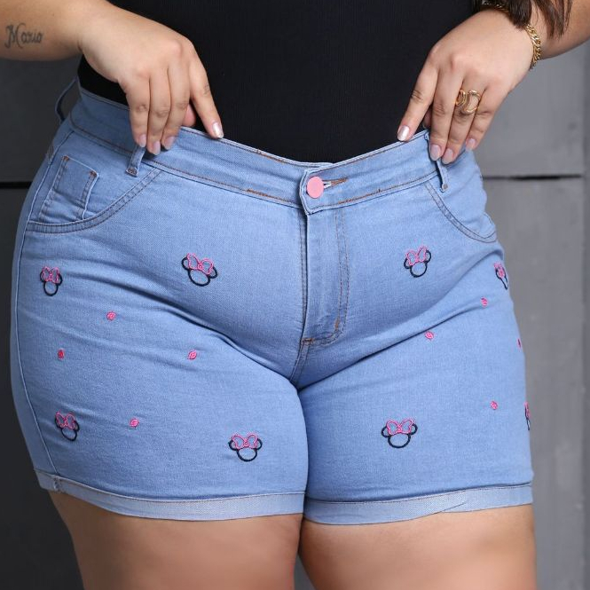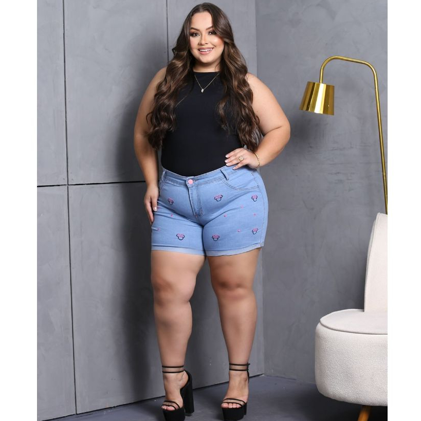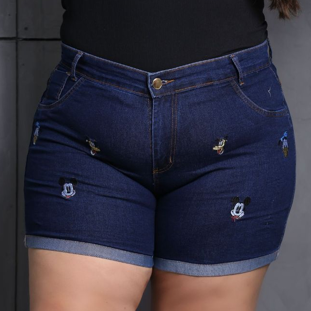 Short Jeans Plus Size Bordado com Lycra feminino Estampado Personagem Disney Cintura Alta Elegante e Confortavel