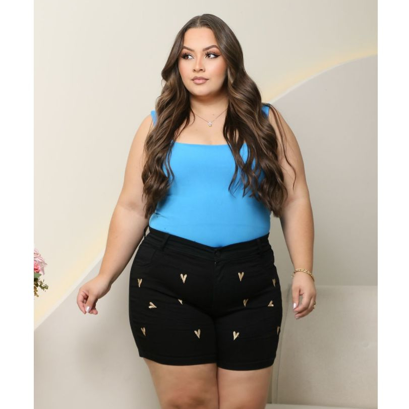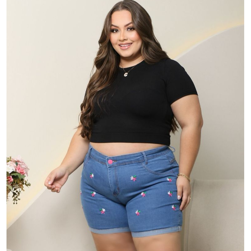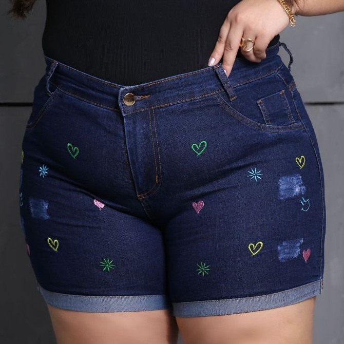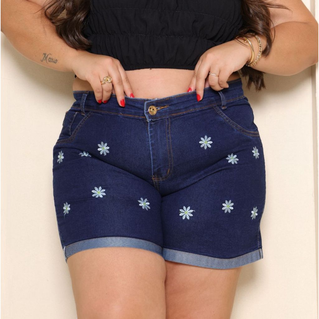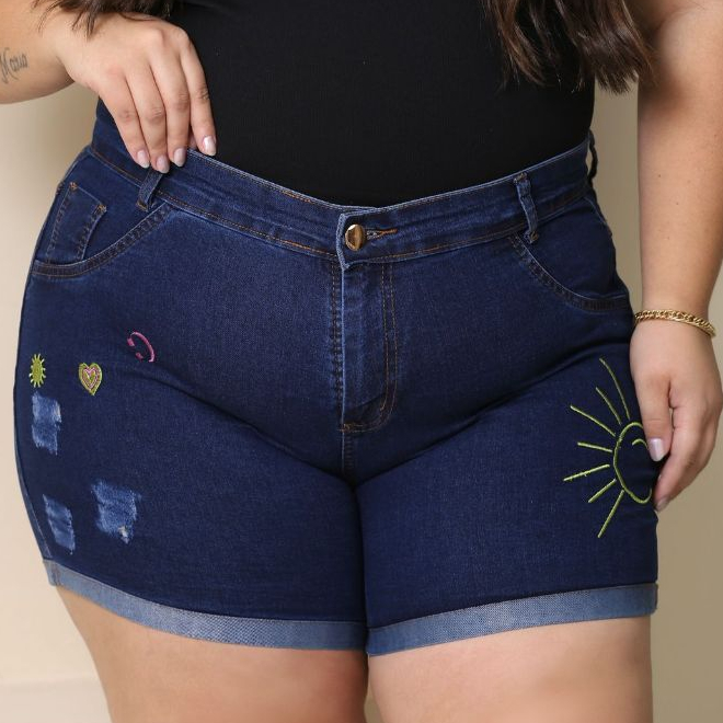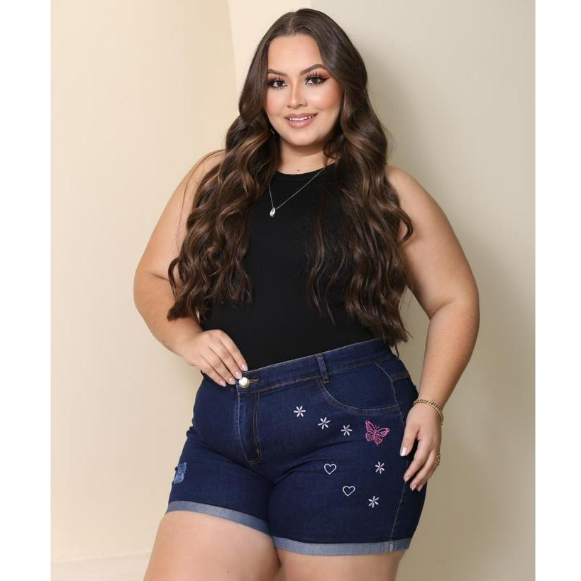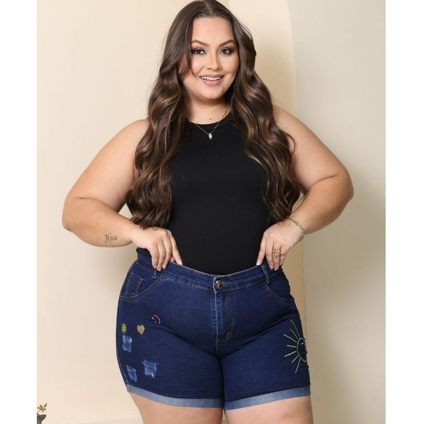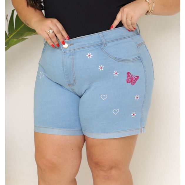 Short Jeans Plus Size Bordado com Lycra feminino Estampado Personagem Disney Cintura Alta Elegante e Confortavel