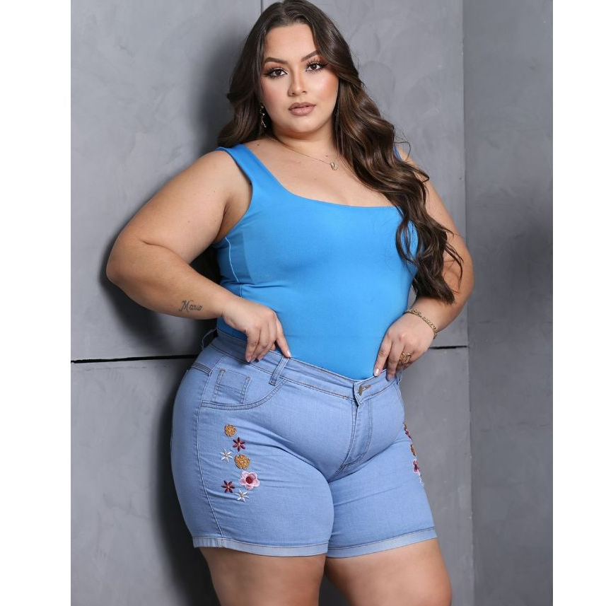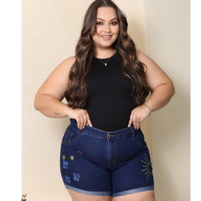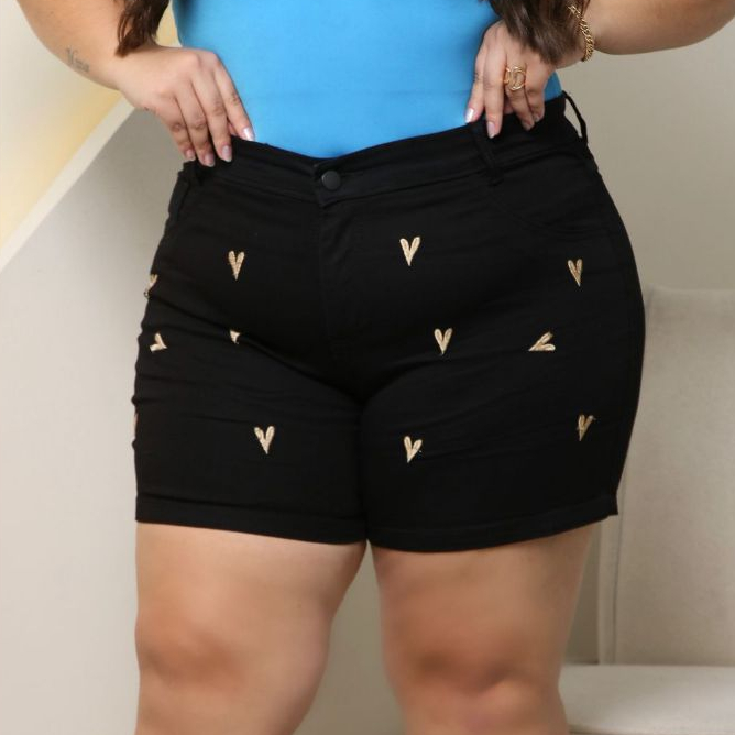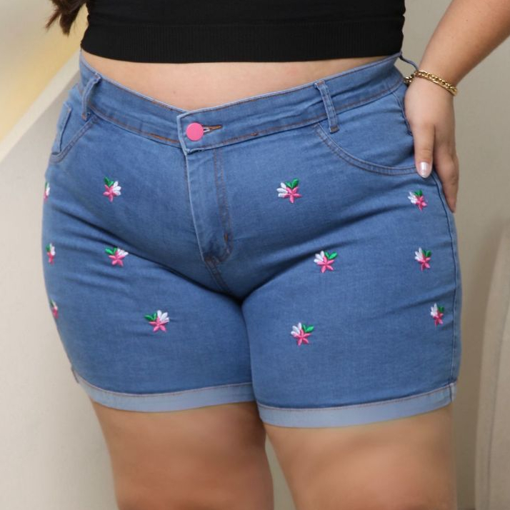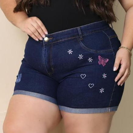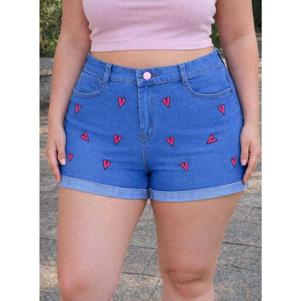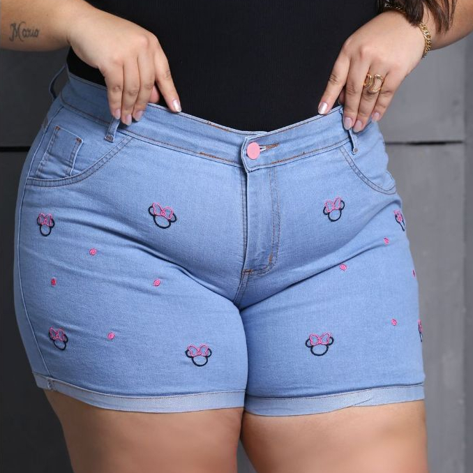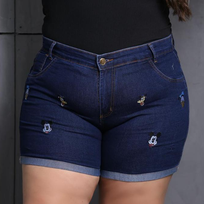 Short Jeans Plus Size com Lycra feminino Bordado Personagem Estampado Cintura Alta