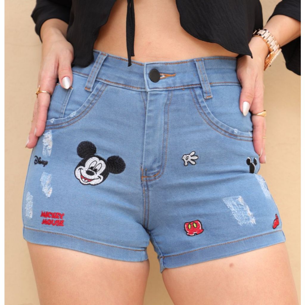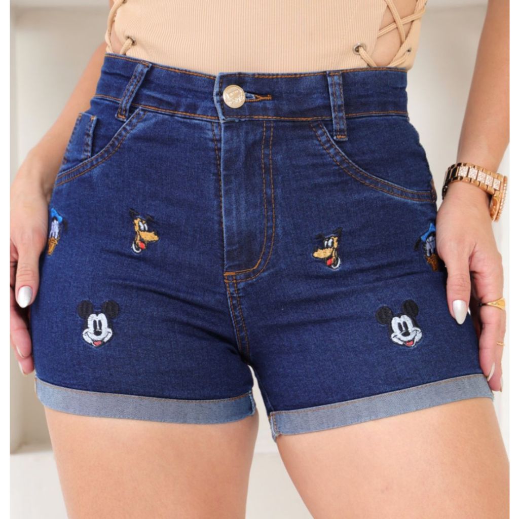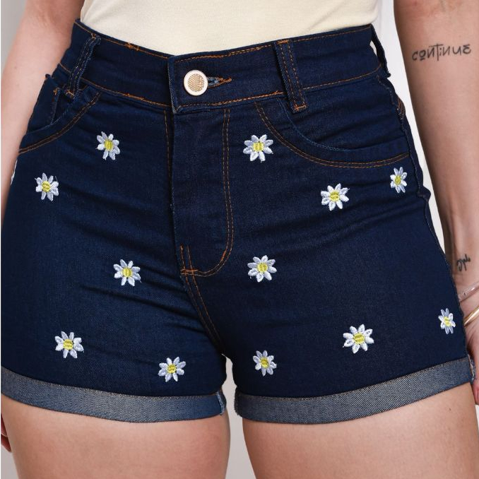 Short Jeans Bordado feminino com lycra cintura alta Moda Verão cos alto confortavel elegante Promoçã
