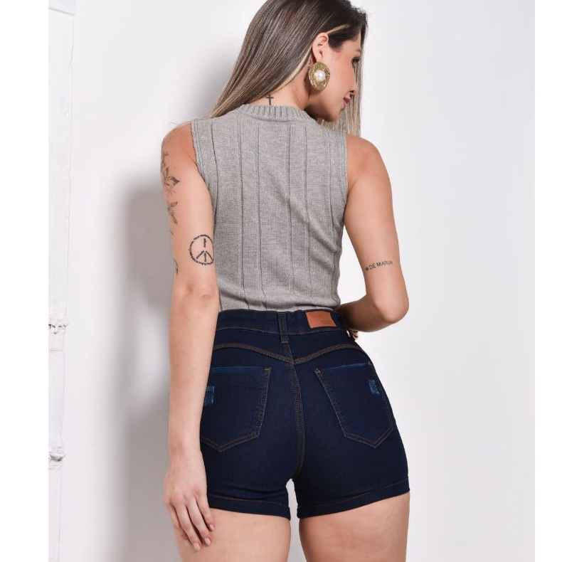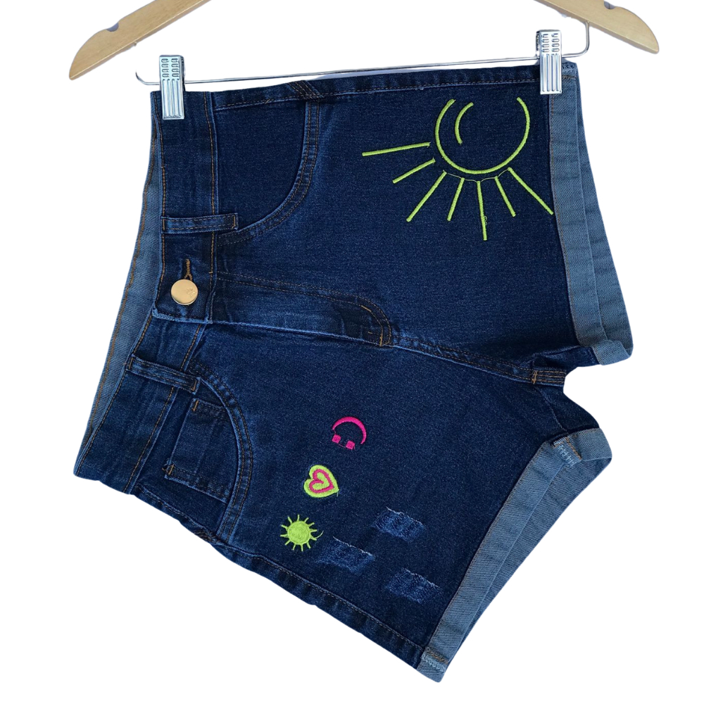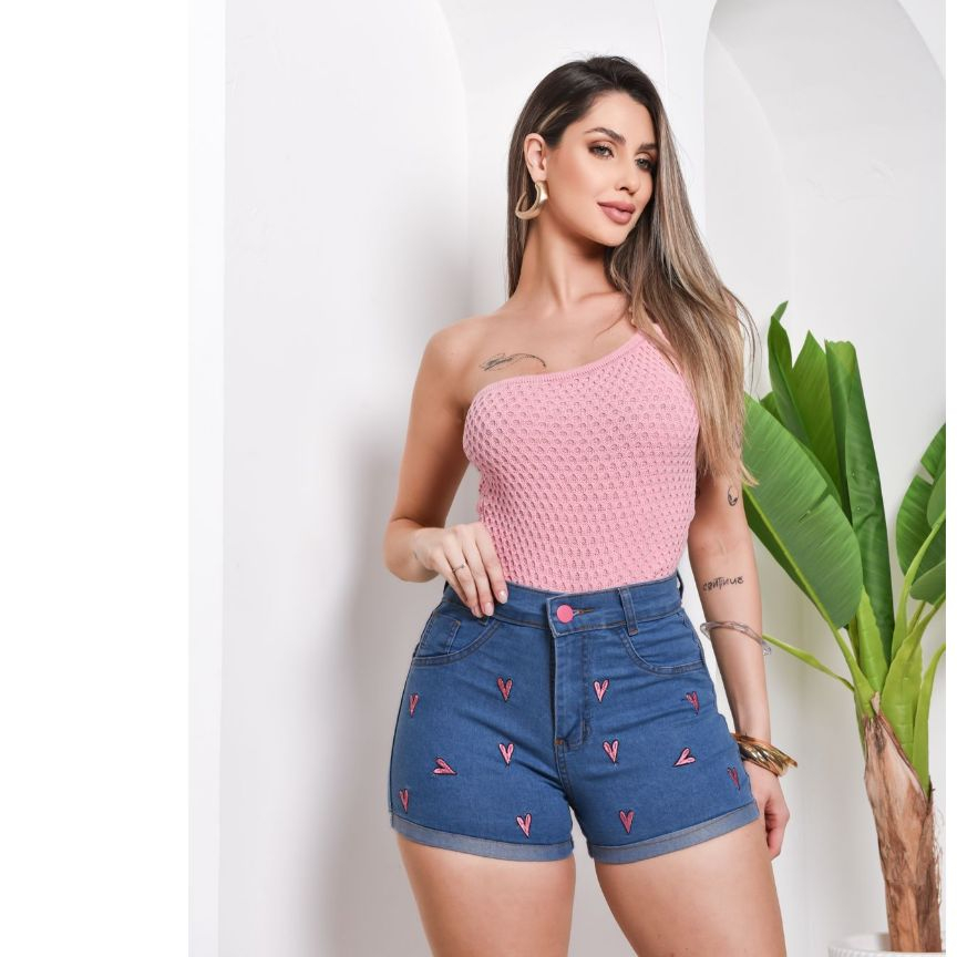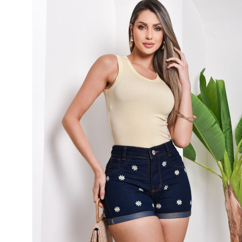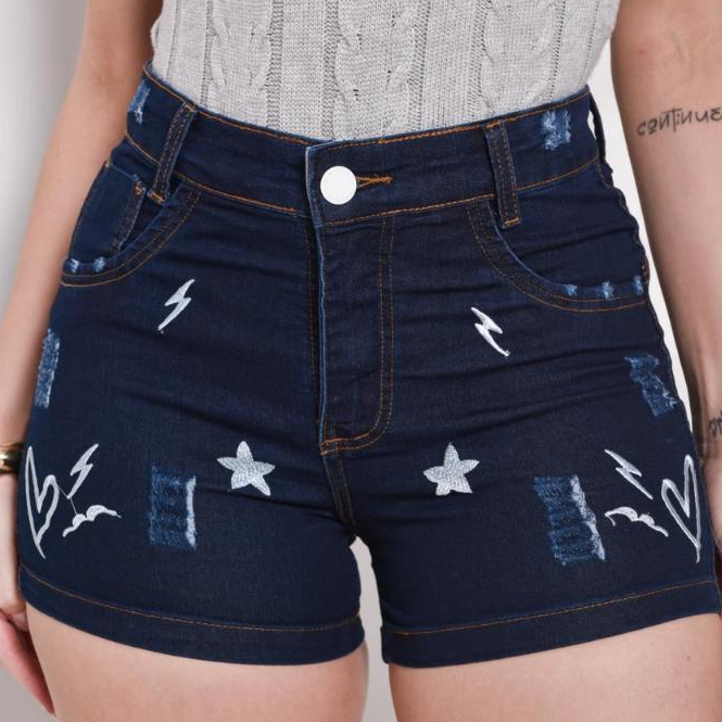 Short Jeans com Lycra bordado cintura alta feminino empina bumbum cos alto elastico Moda Verão