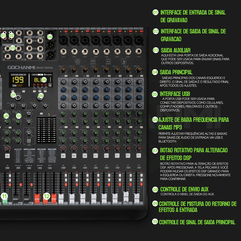 Mesa de Som GOCHANMI Master16 DJ Mixer 16 Canais 199 Efeitos Grupos EQ Sweep Phantom 48V 110v/220v