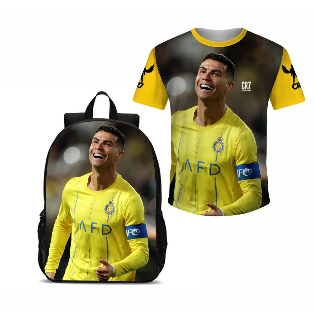 Kit Camiseta Infantil + Mochila Escolar Cristiano Ronaldo Futebol