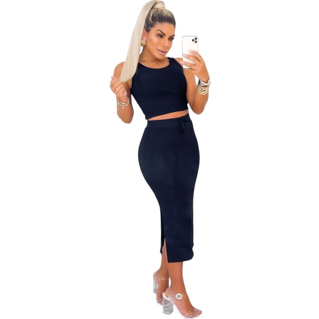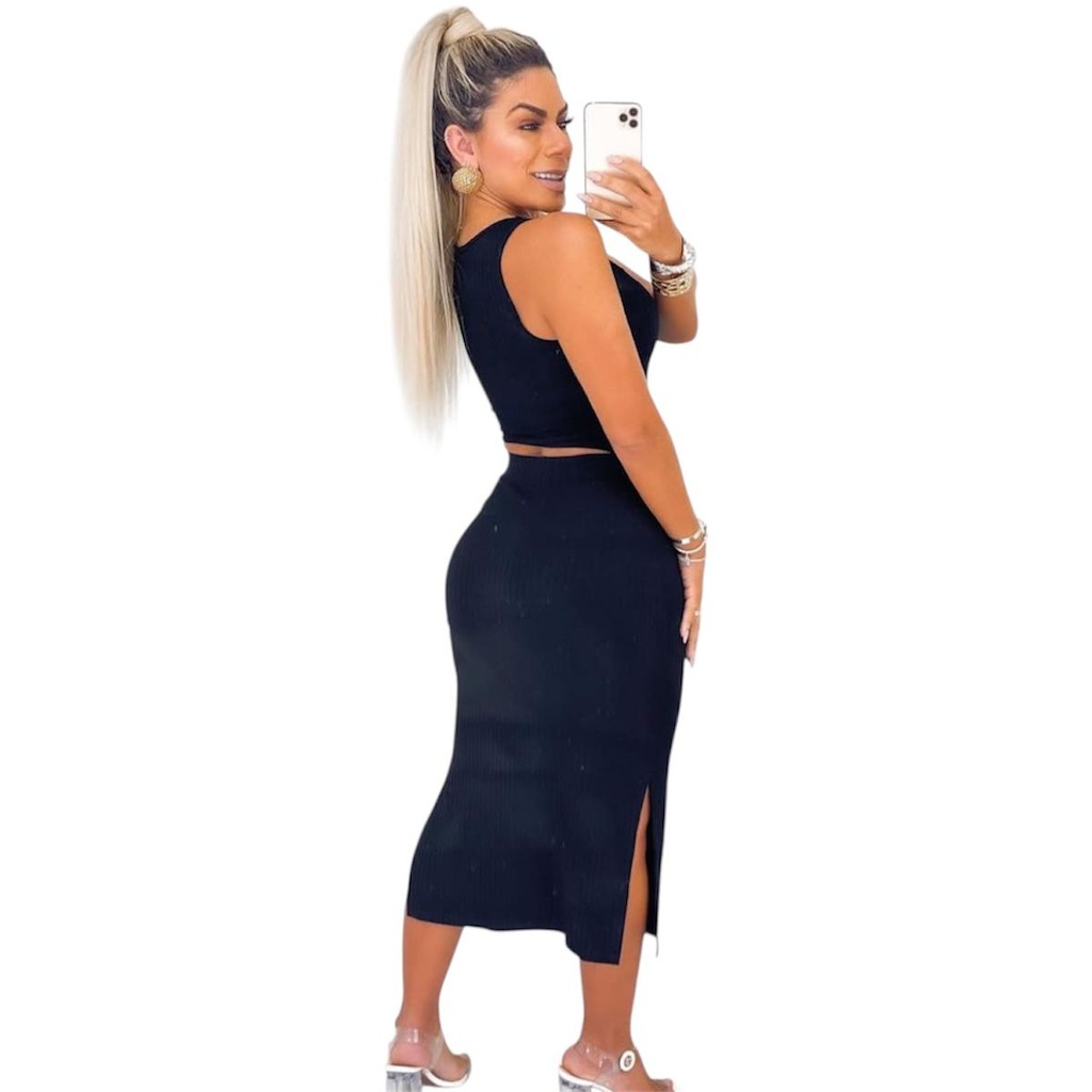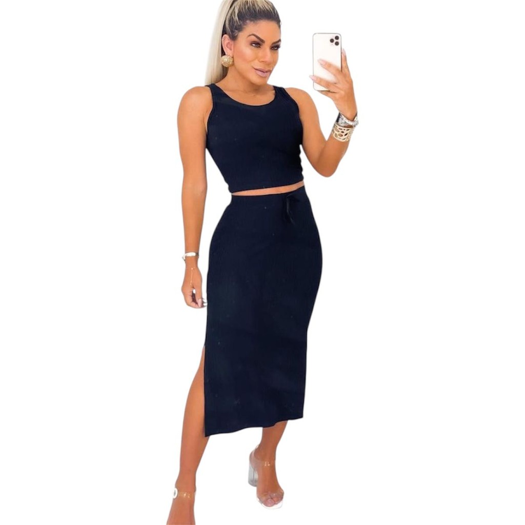 Conjunto Feminino Saia Midi e Cropped Anarruga fenda Lateral Zero Transparência Moda Gringa