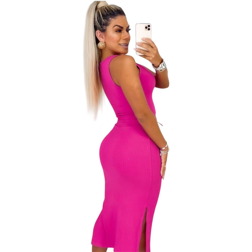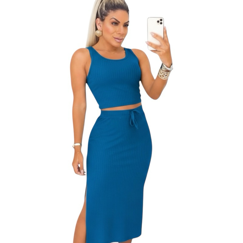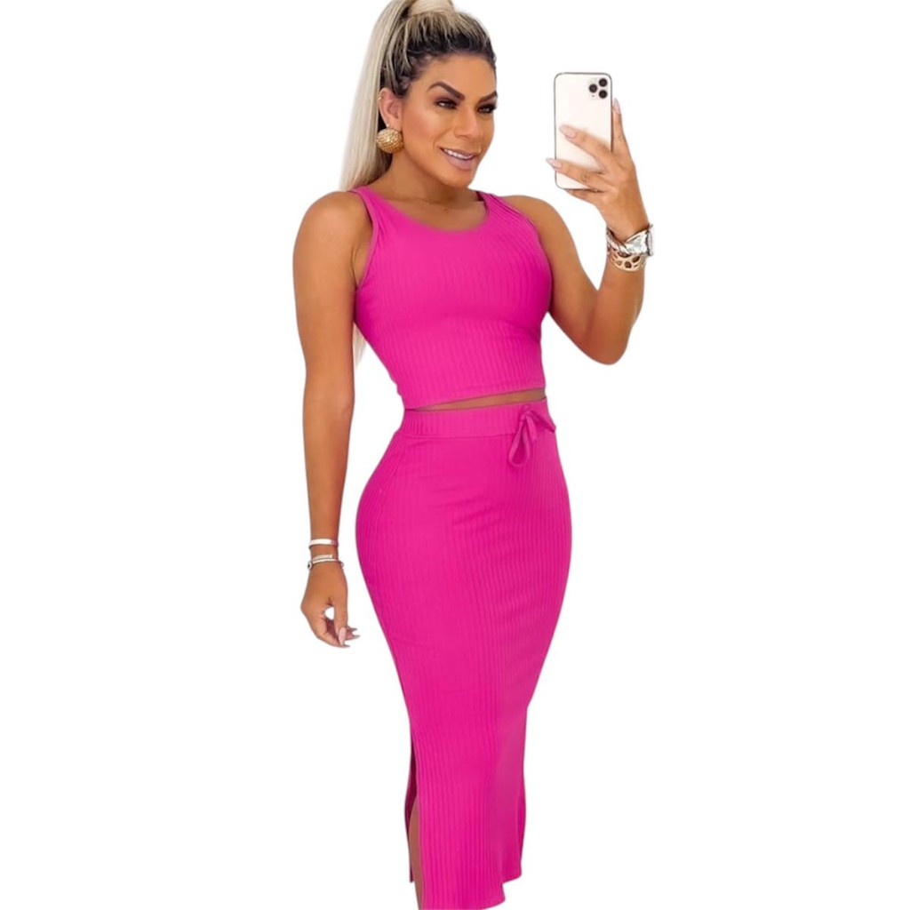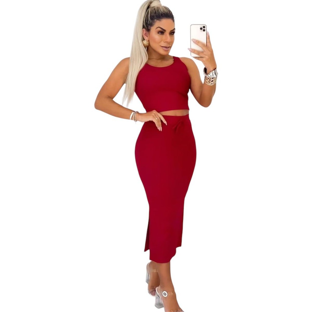 Conjunto Feminino Saia Midi e Cropped Anarruga fenda Lateral Zero Transparência Moda Gringa