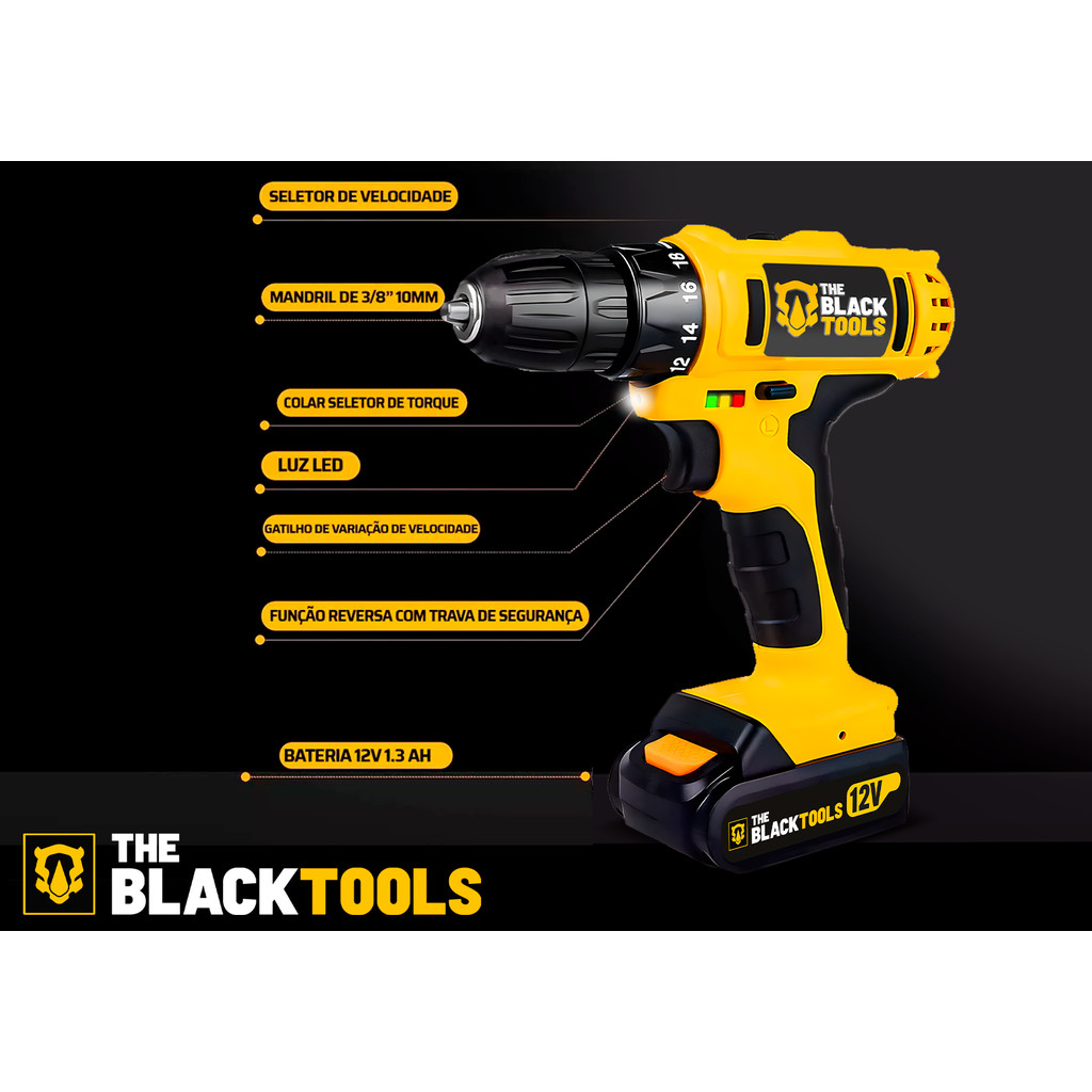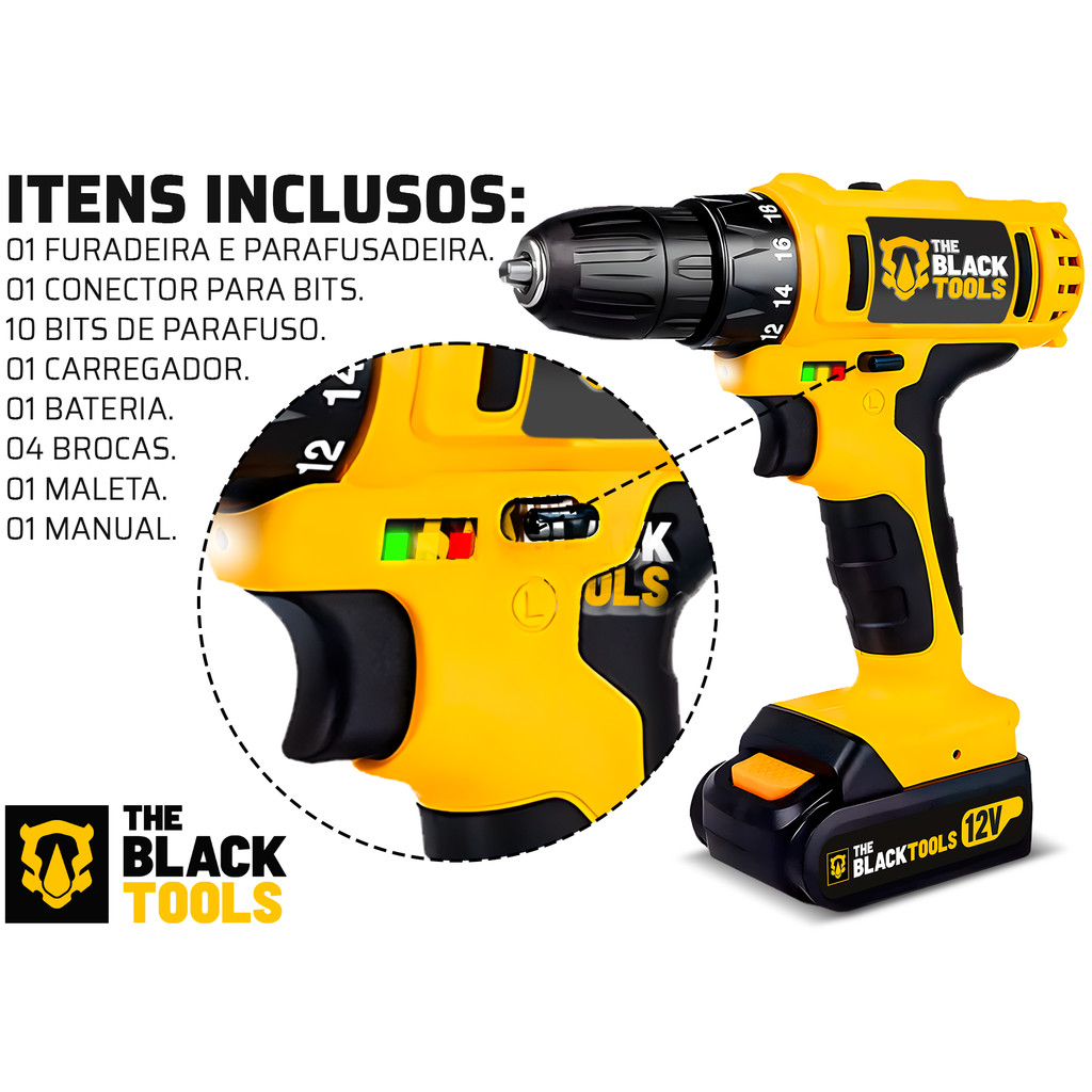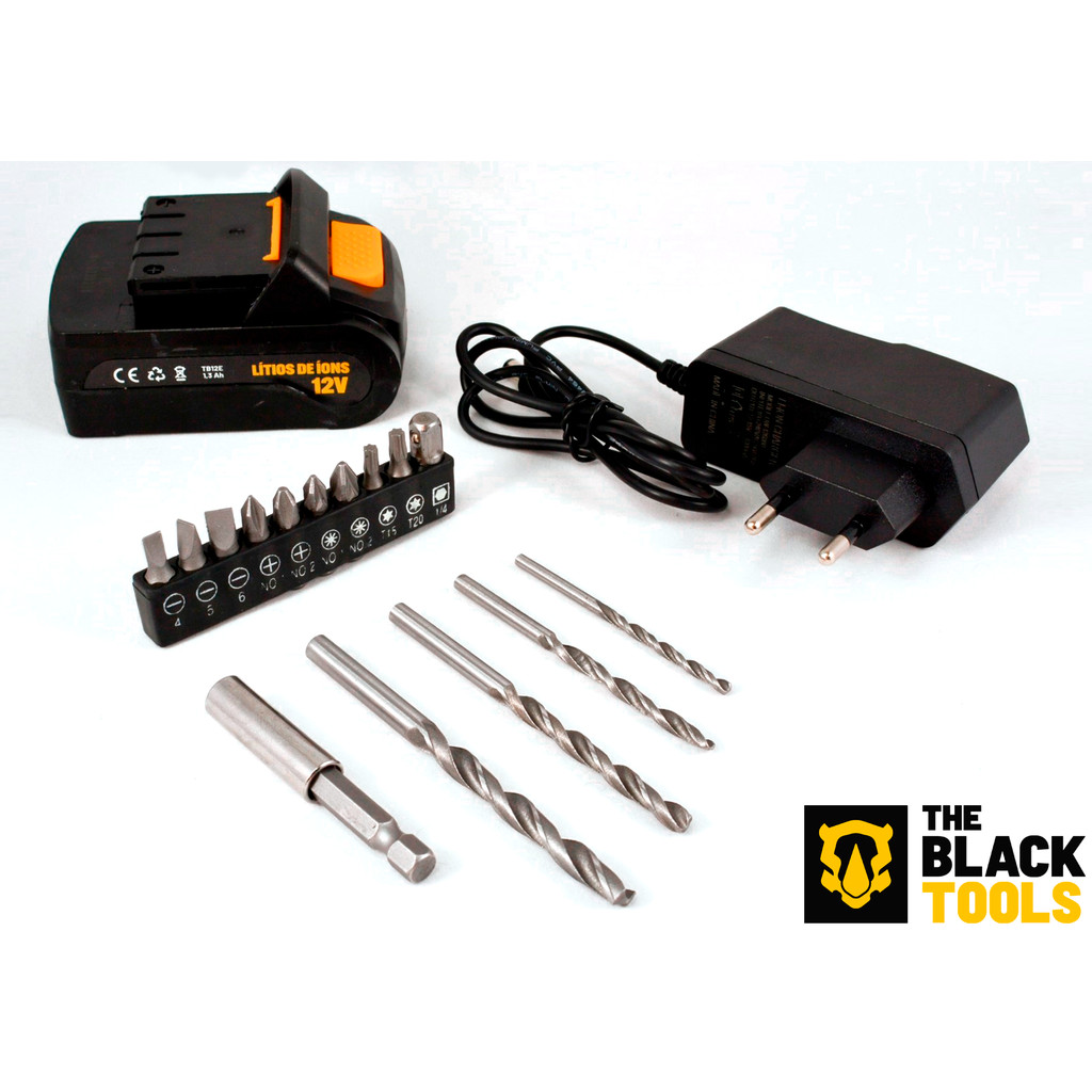 Parafusadeira E Furadeira S/ Fio Bateria 12v Bivolt 3/8 10mm Com Maleta E Acessorios The Black Tools