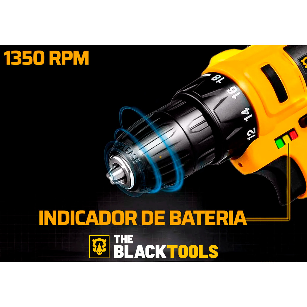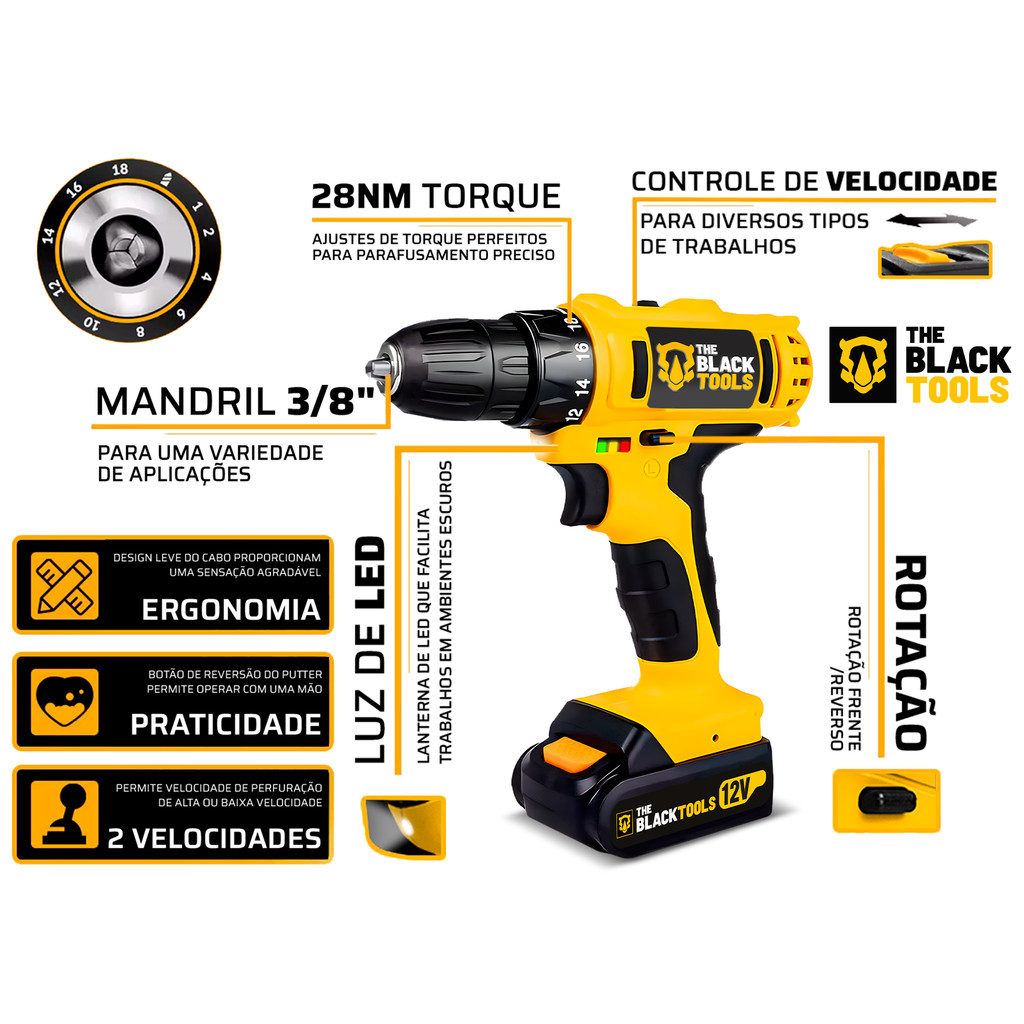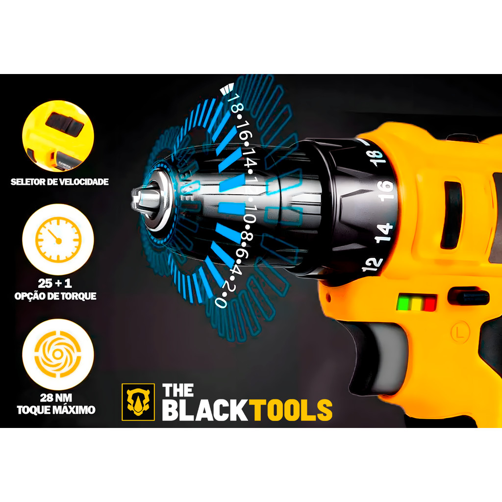 Parafusadeira E Furadeira S/ Fio Bateria 12v Bivolt 3/8 10mm Com Maleta E Acessorios The Black Tools