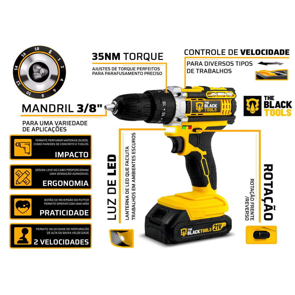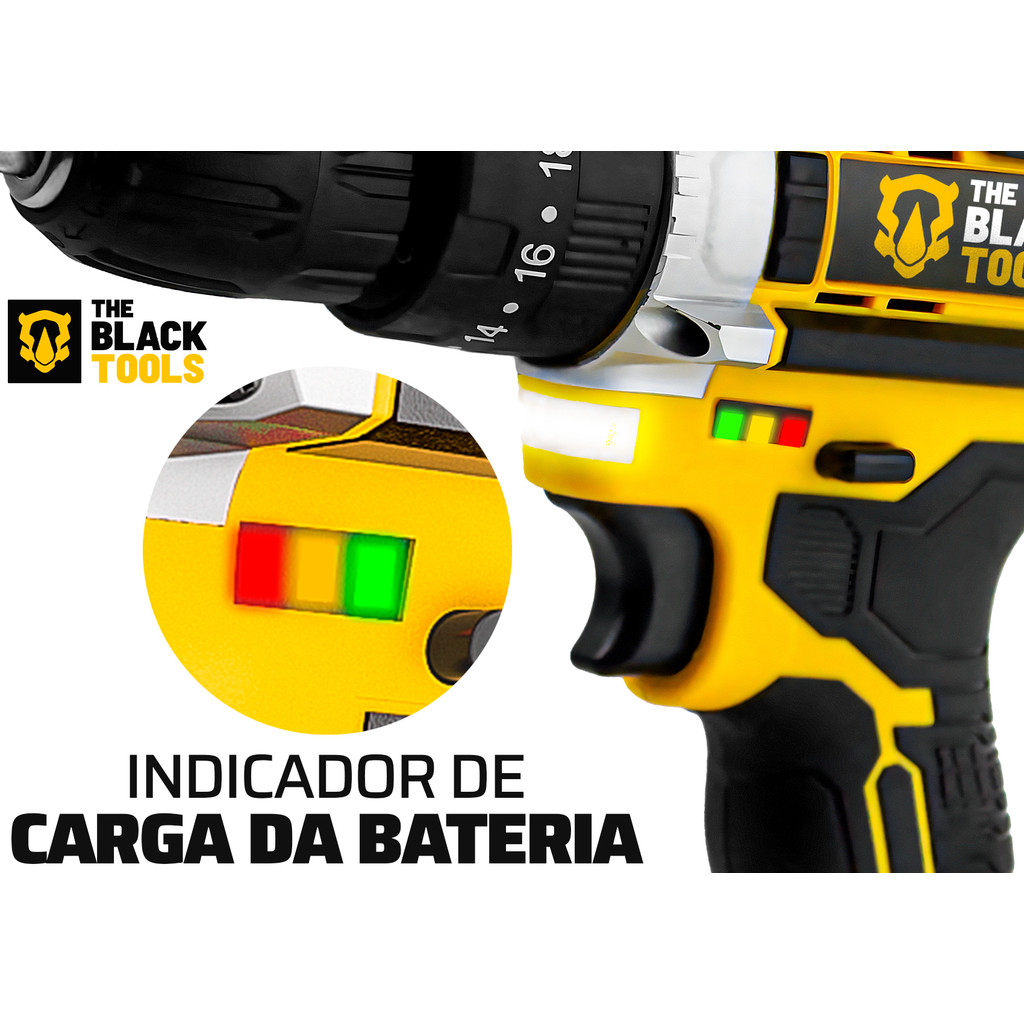 Parafusadeira Furadeira Impacto 21v Com Bateria Maleta e Acessórios Completo The Black Tools
