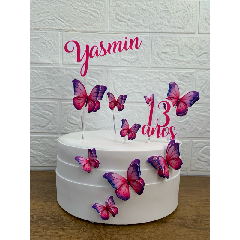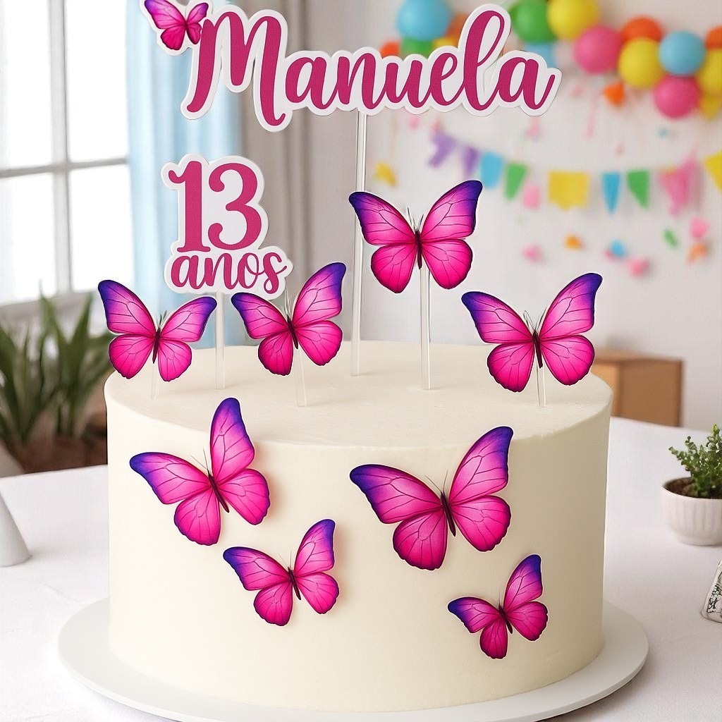 Topo de Bolo Borboletas Rosa e Roxo Clássico Personalizado Nome e Idade Aniversário