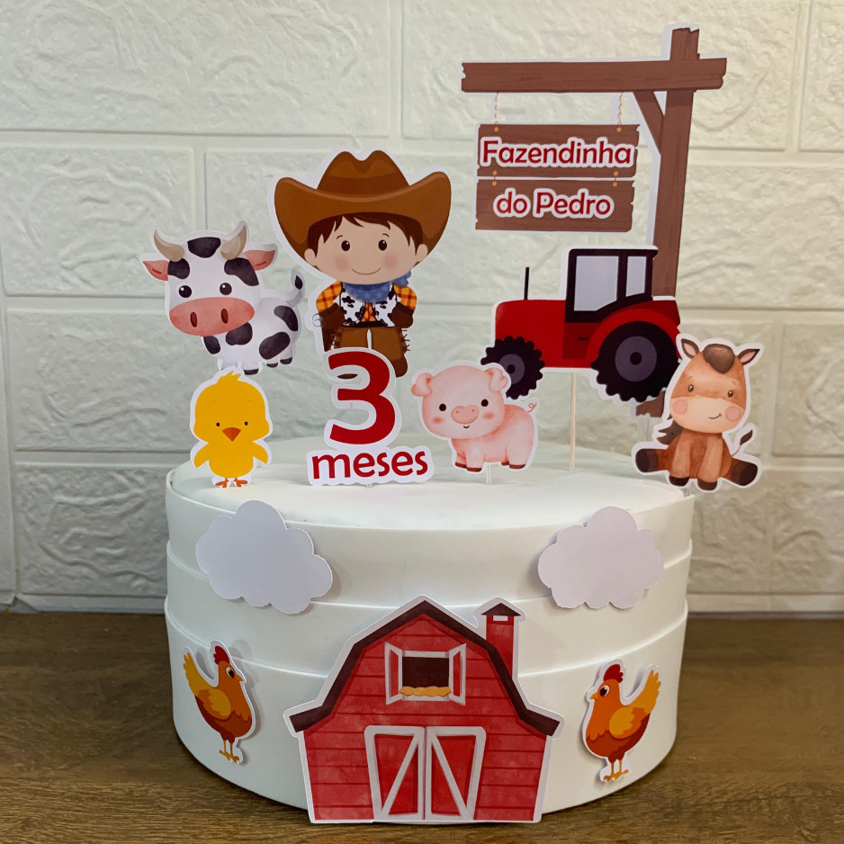Topo de Bolo Fazendinha Menino Nome e Idade Mesversário e Aniversário