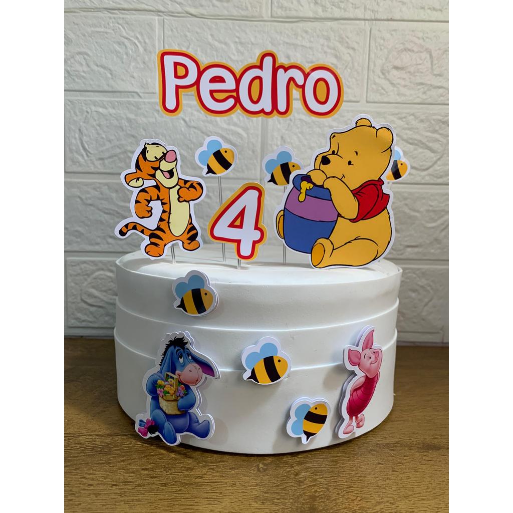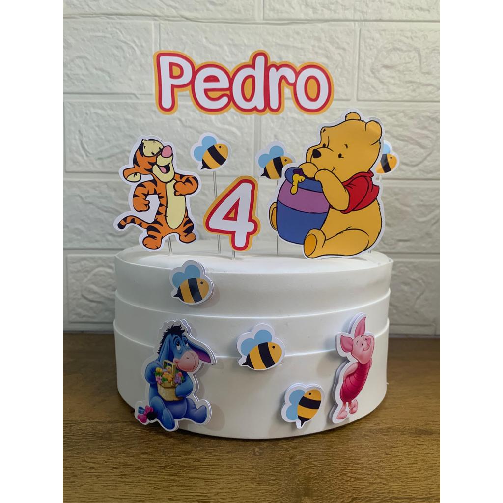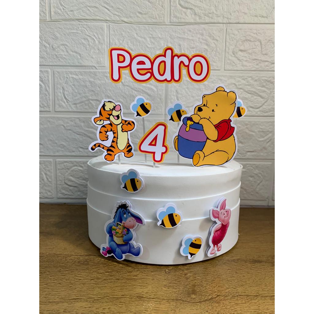 Topo de Bolo Ursinho Pooh Personalizado Nome e Idade Aniversário e Mesversário