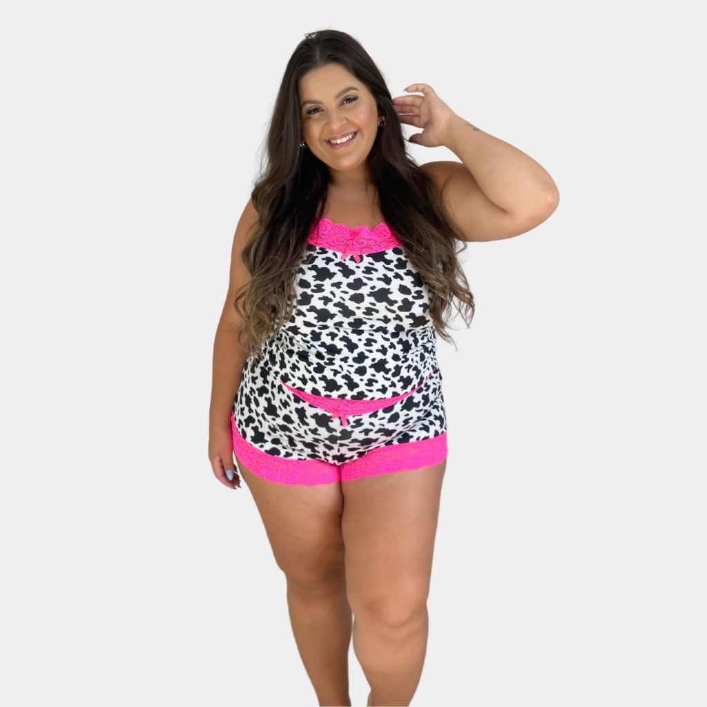 Pijama Baby Doll Microfibra Plus Size Vaquinha Com Renda Neon Confortável