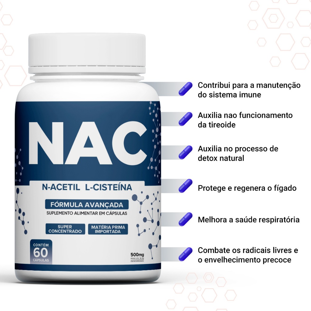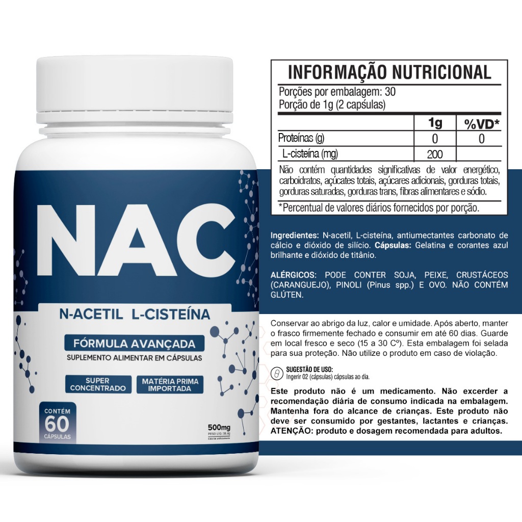 NAC N-Acetil L-Cisteína 500mg | Imunidade, Saúde do Fígado, Antioxidante e Detox – 60 Cápsulas