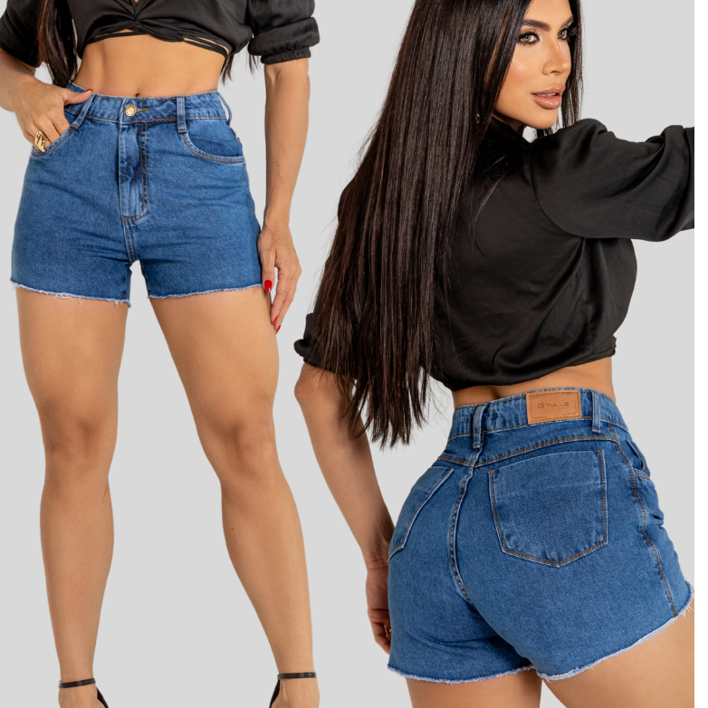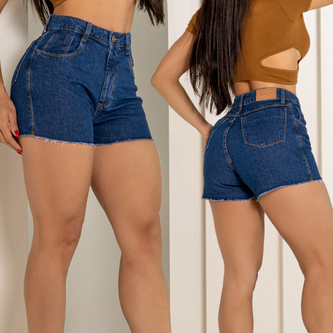 SHORT JEANS FEMININO CINTURA ALTA 100% ALGODÃO MARMORIZADO SEM LYCRA