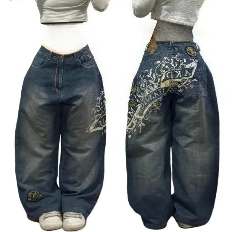 2025 Nova Tendência Americana Retro Hip-hop Bordado Padrão Baggy Jeans Y2K Harajuku Calças Largas Streetwear