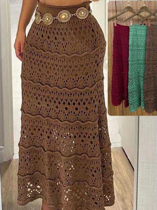 Saia Longa Tricot Rendada Ponto Crochê Moda Verão Forrada Tendência Midi Luxo Tricô Praia Piscina