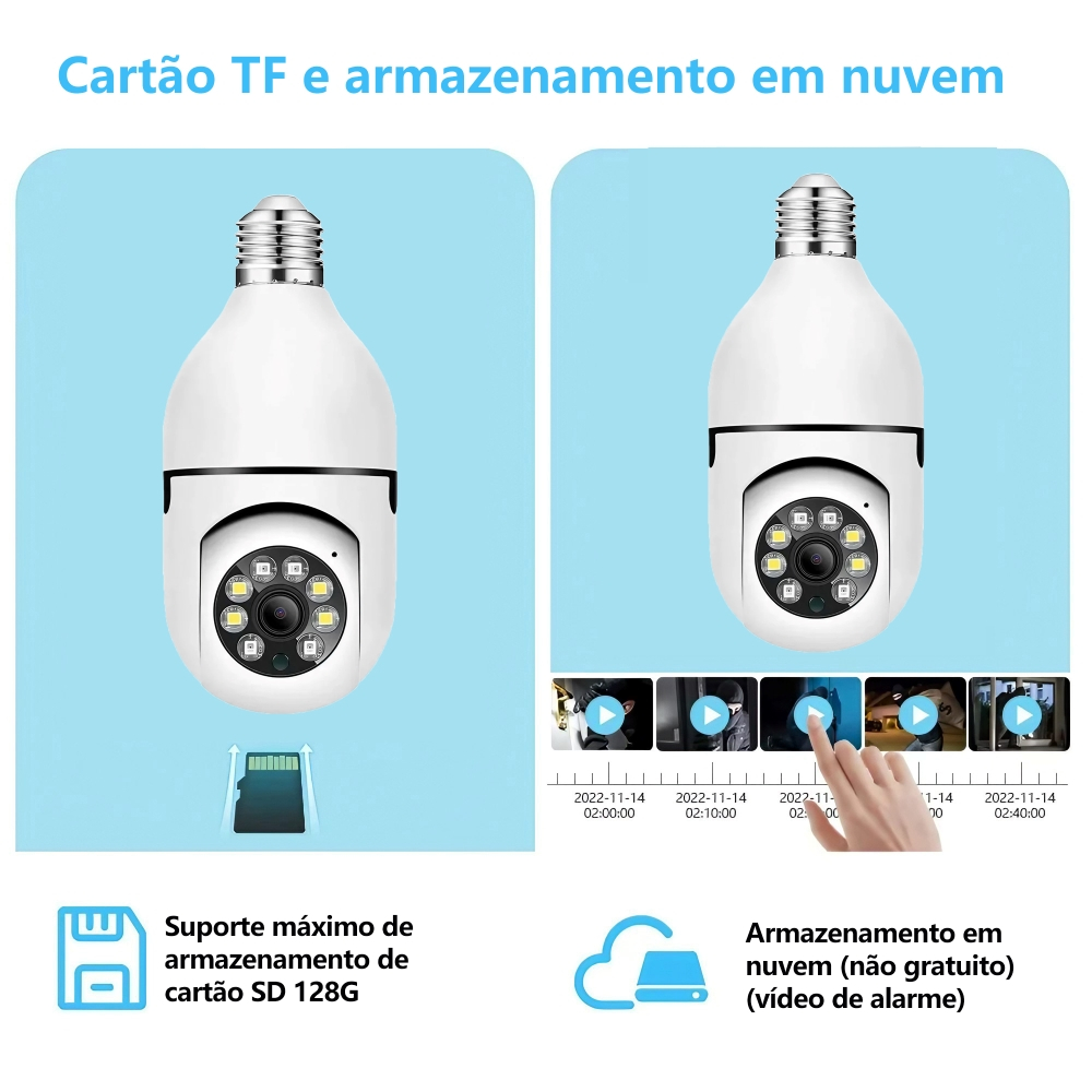 Câmera Vigilância Wi-Fi Soquete E27 - 1080P, Rotação 355°, Visão Colorida à Noite, Detecção Humana, À Prova D'Água, APP