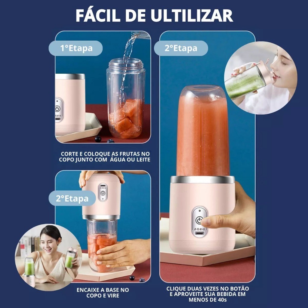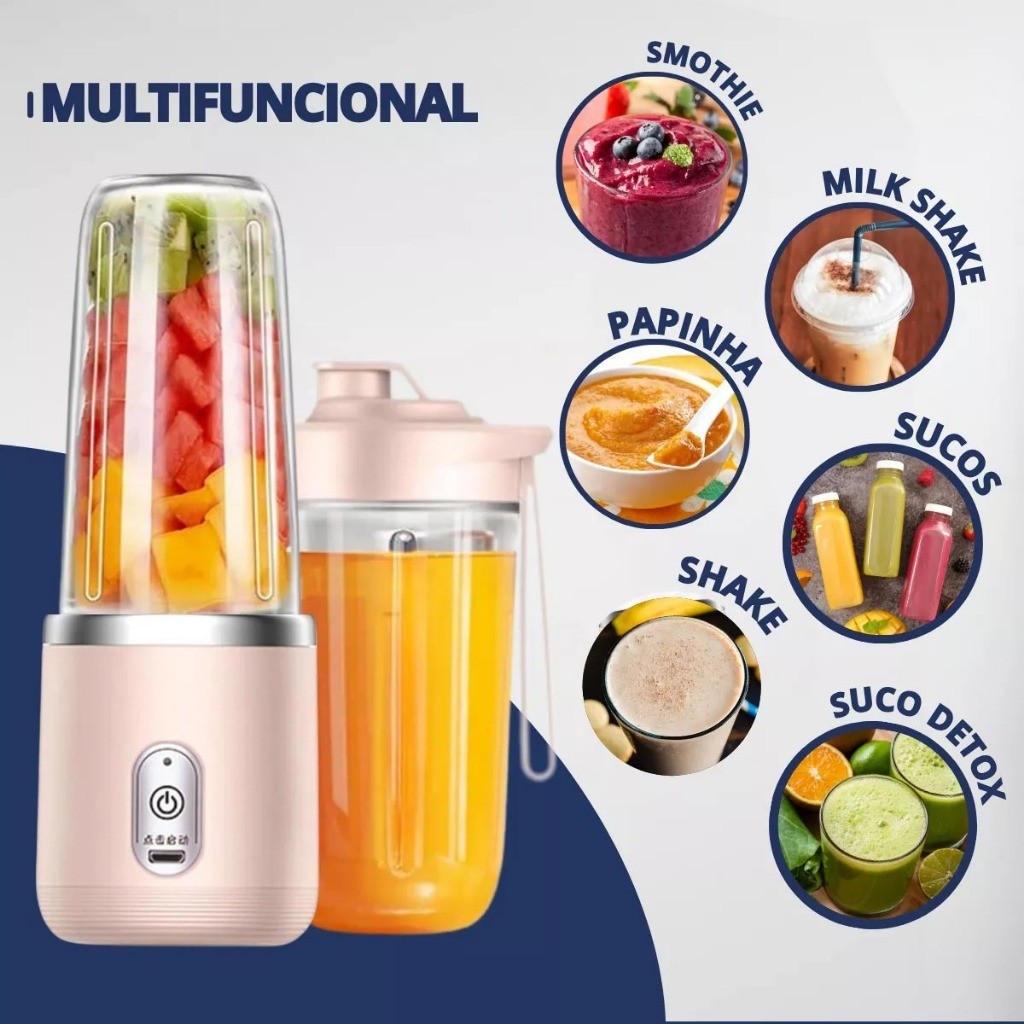 Mini Liquidificador Mixer Processador Portátil Casa Camping Carro Recarregável 2 Copos Bivolt-Smile